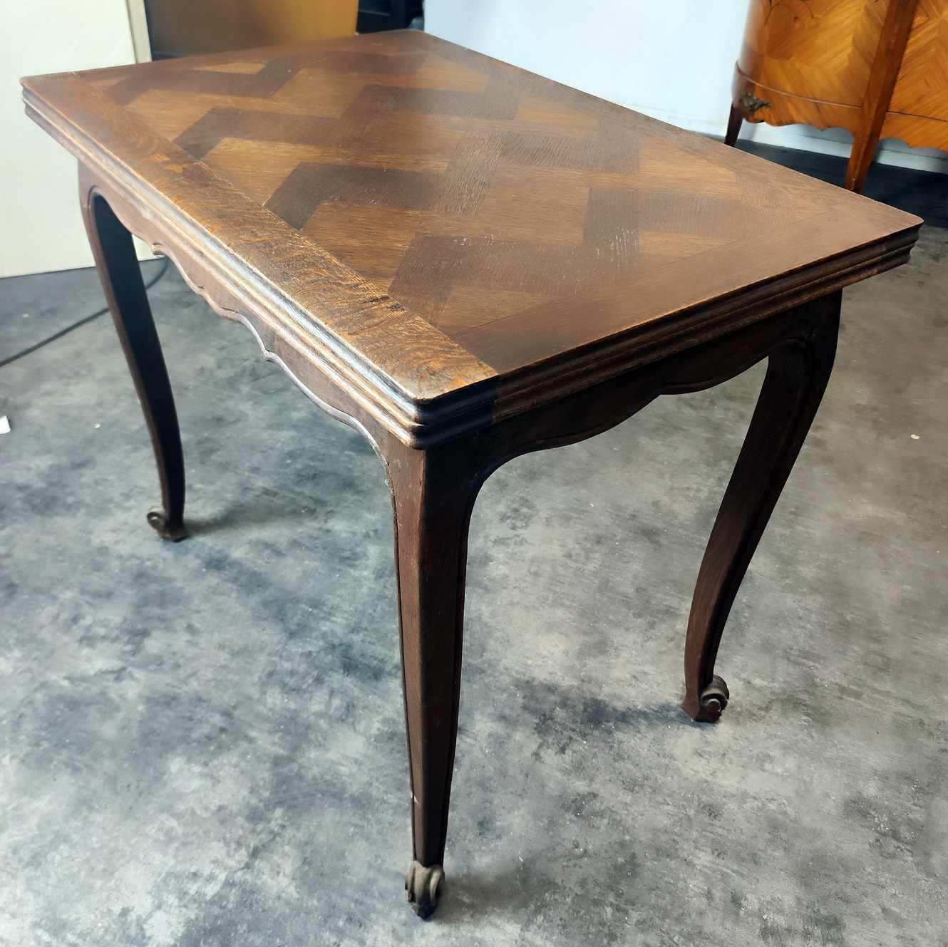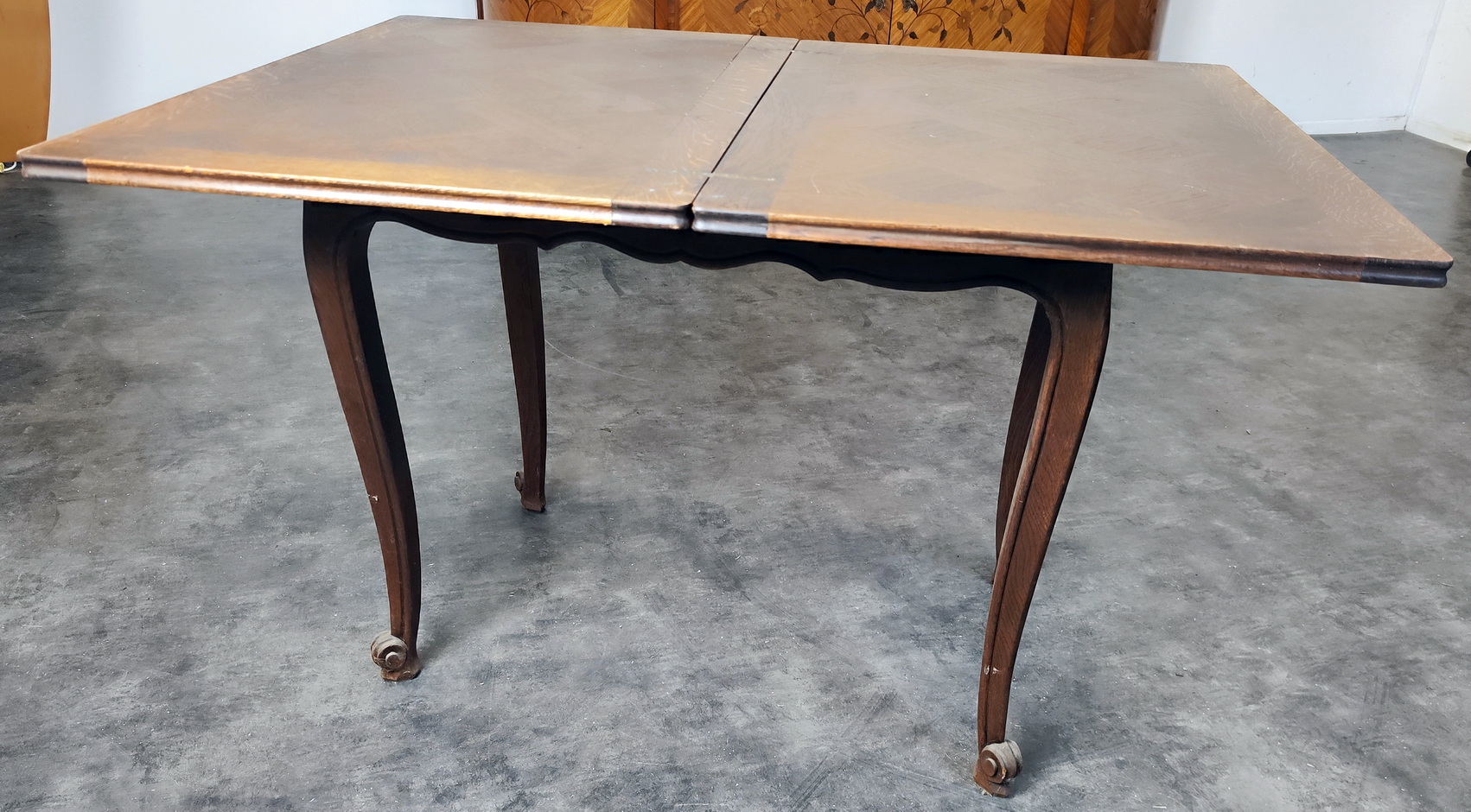 A smaller-sized, early 20th century French Provincial Louis XV style carved solid walnut and walnut parquetry inlaid extending dining table, the top with a fold-out mechanism, standing above well-carved Cabriole legs and shaped rails. Please note the elegance of the legs and the cleverness of the fold-out concept. Area of Paris, circa 1930.