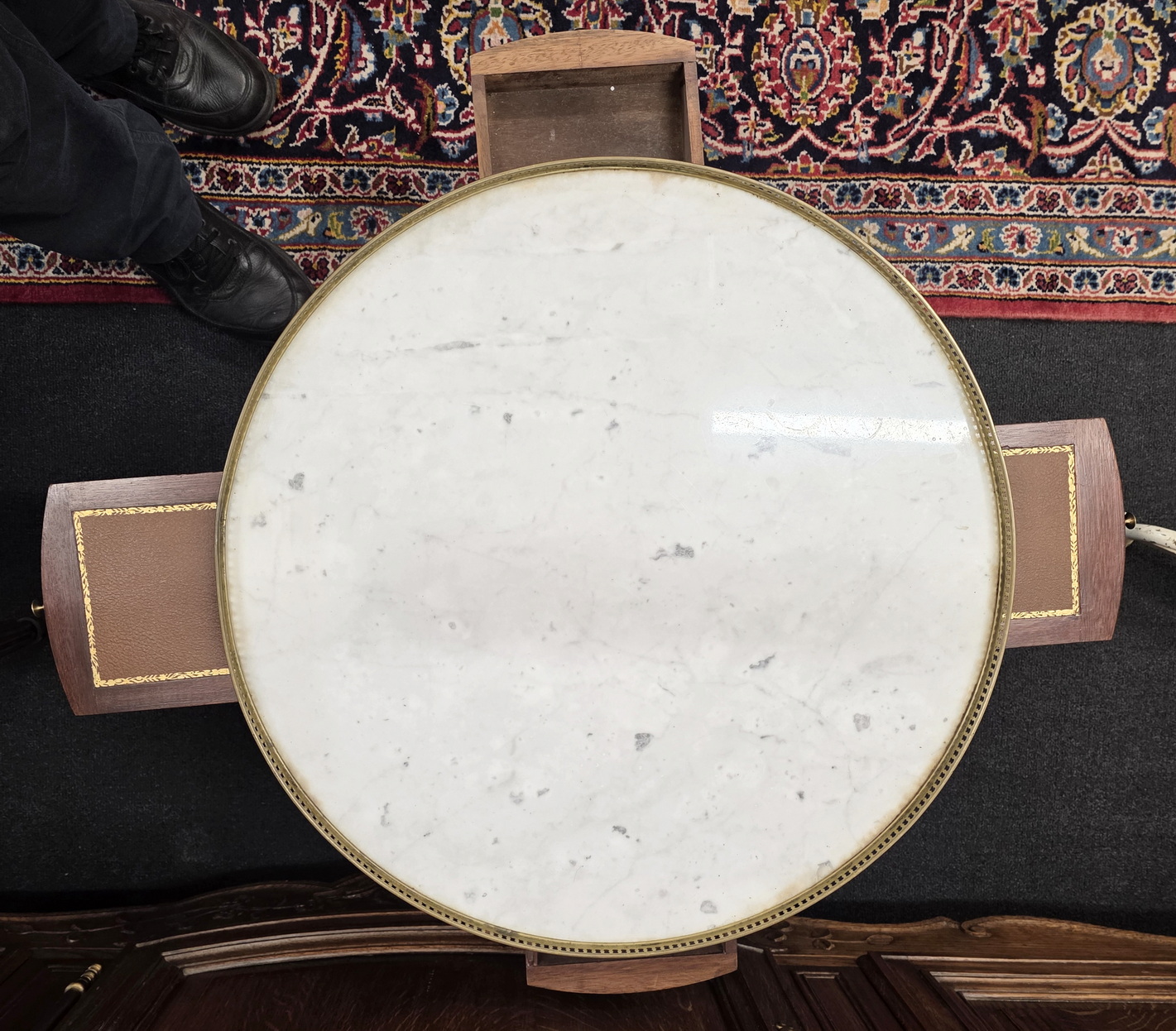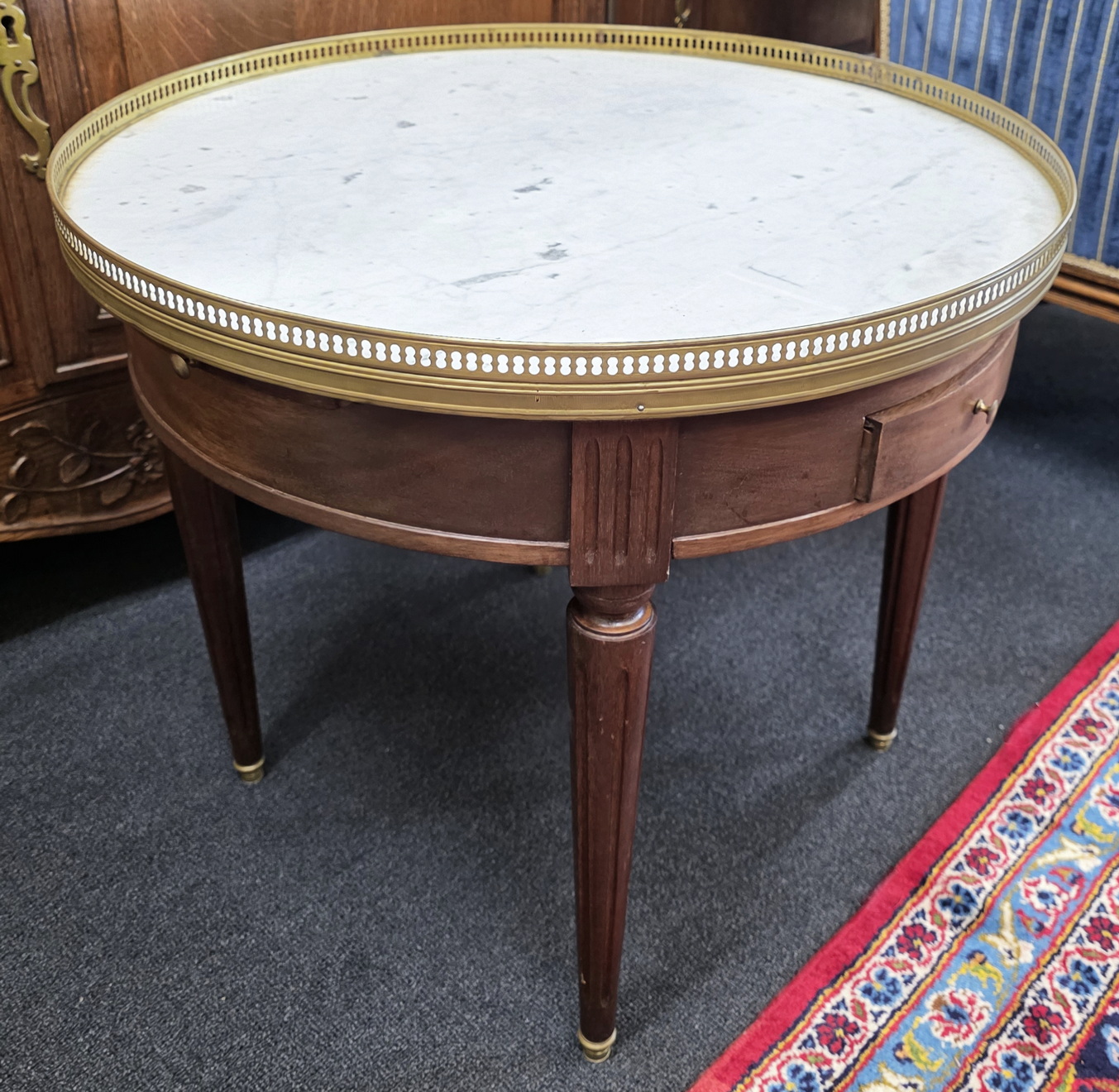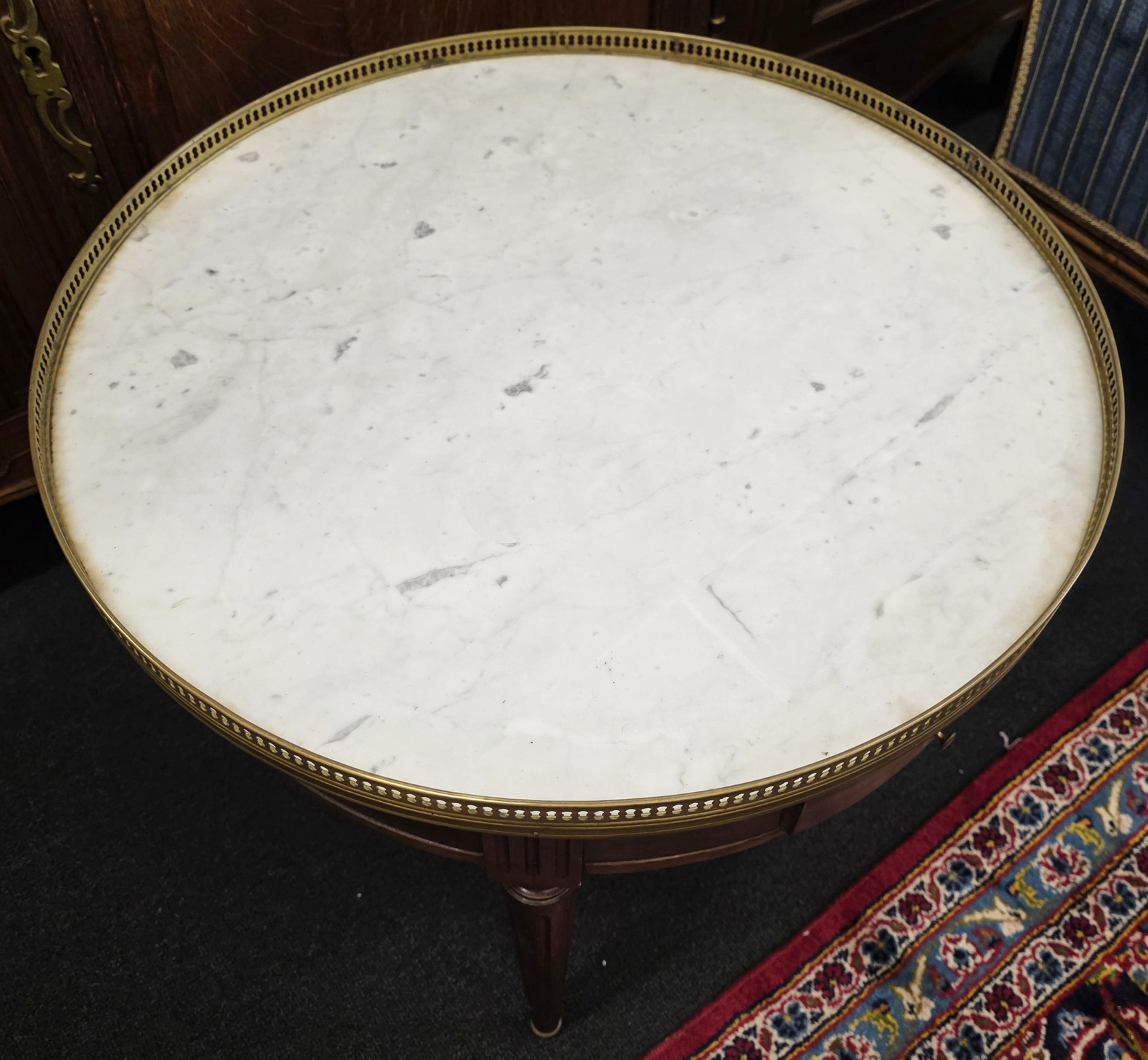 A French Louis XVI style 'Bouillotte' coffee table, the circular top fitted with its original Carrara marble and framed by a raised and fretted gilt brass gallery, standing on fine tapering and fluted legs. The table is fitted with two drawers and two slide-out extensions, each retaining the original, gilt-edge leather inserts. Area of Paris, circa 1930.