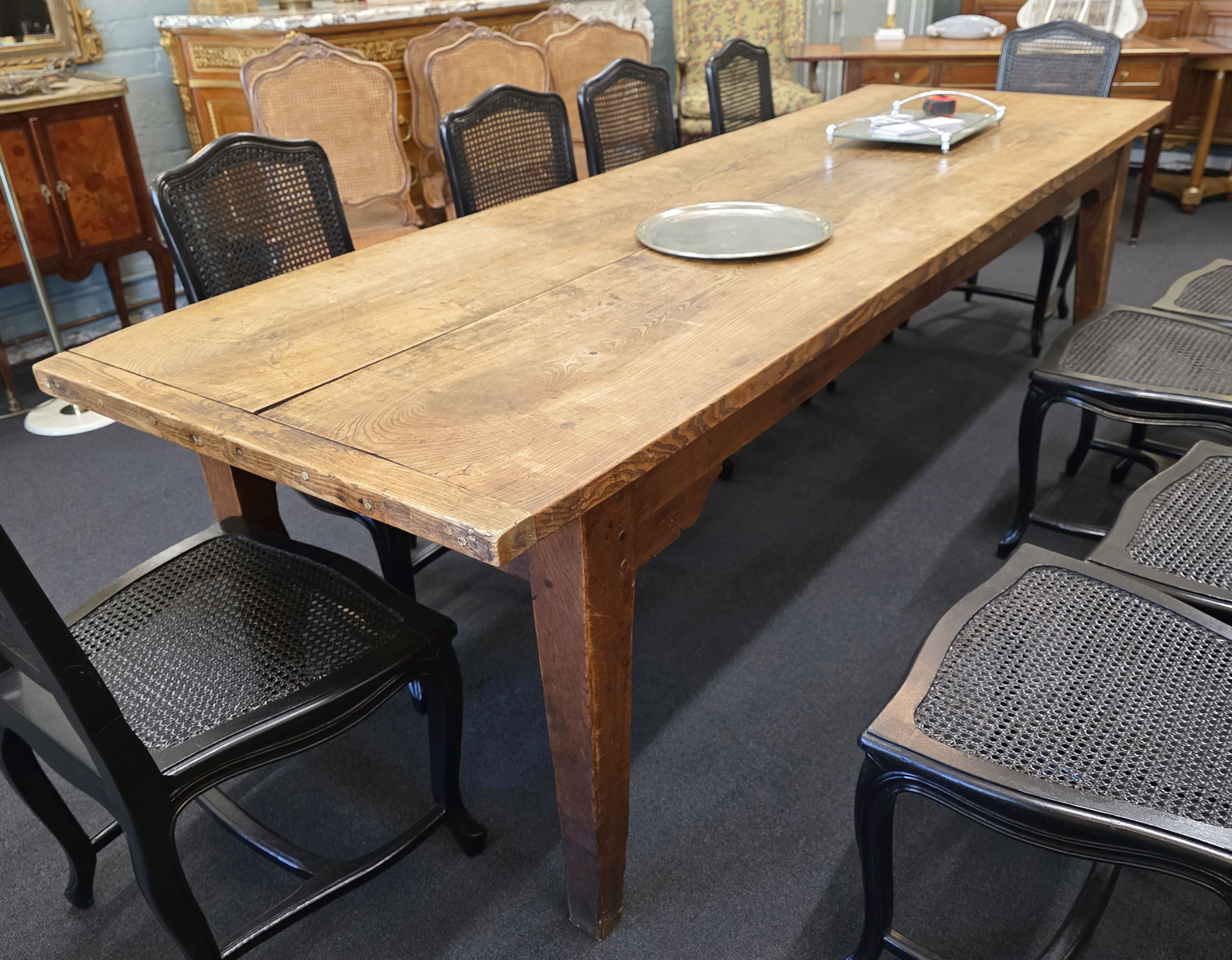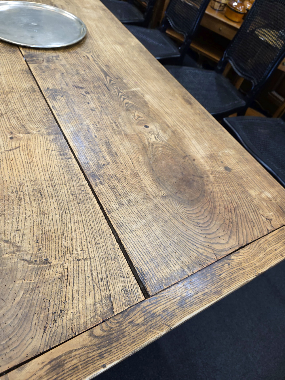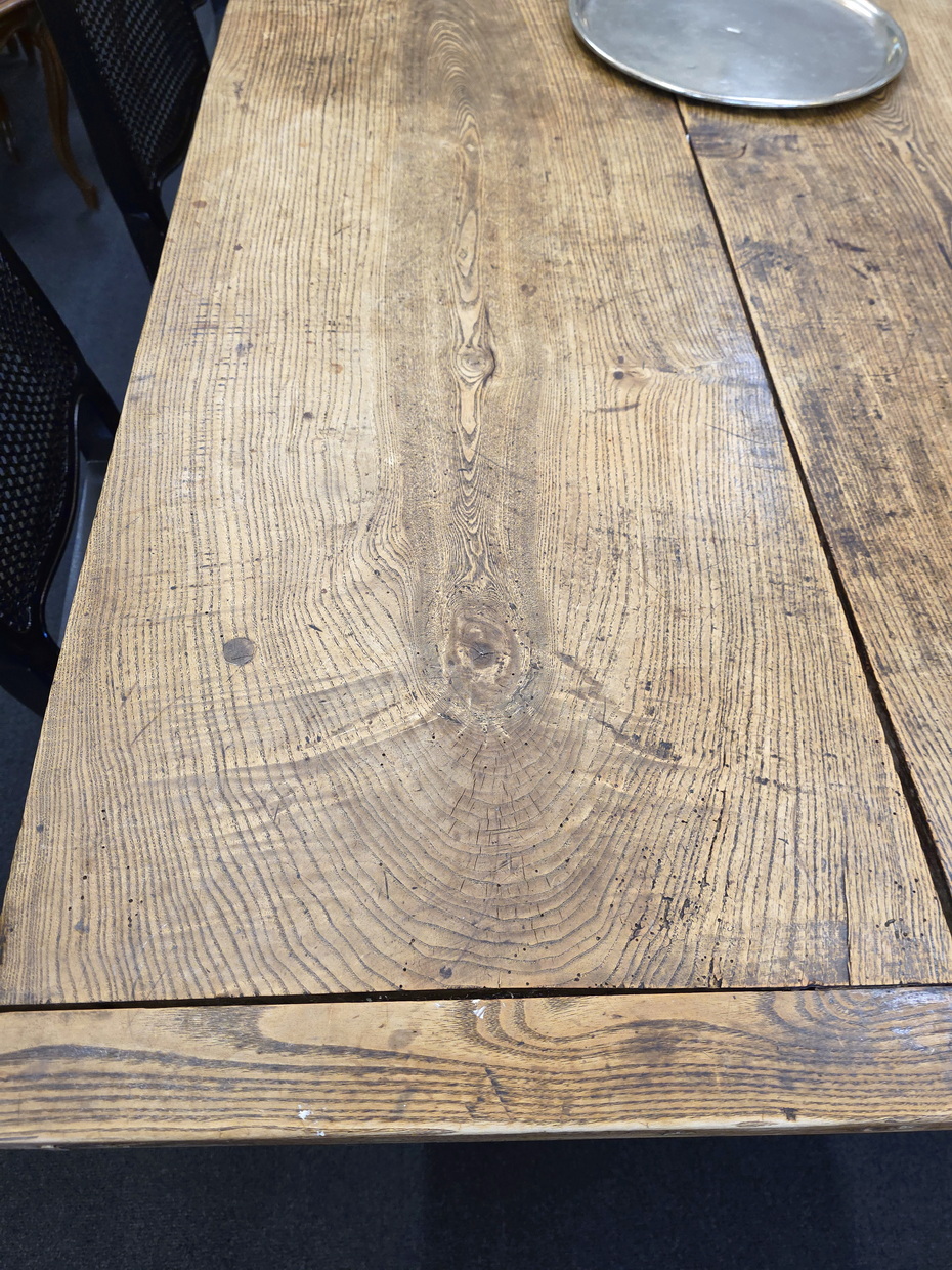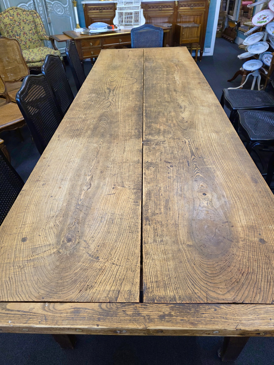 An 18th century French solid elm farmhouse table from the area of Lower Normandy, designed with typically large planks and with sturdy square-section tapering legs. The top is made from just two exceptionally thick and well-burnished planks, (taken from the same trunk), and built with early construction techniques. Please note the elegance of the book matched planks of the top and the beautiful fadedness and burnishing of the timbers. This table seats comfortably ten. Area of the Calvados, circa 1780.