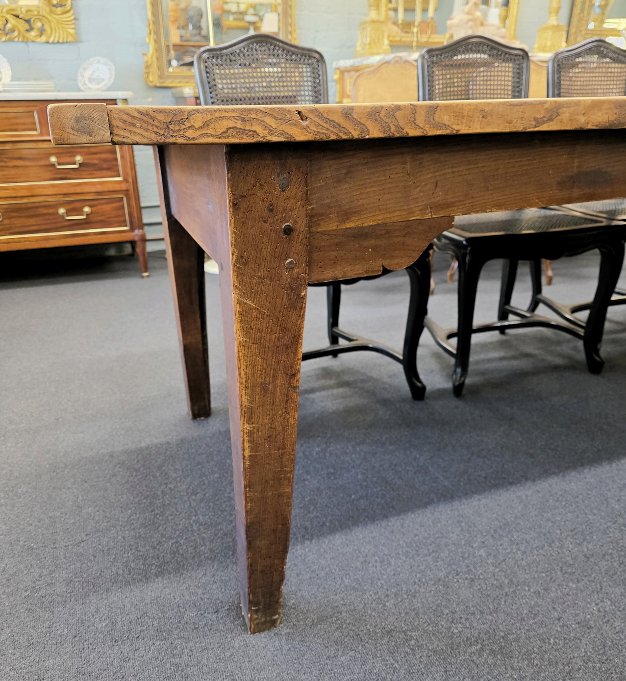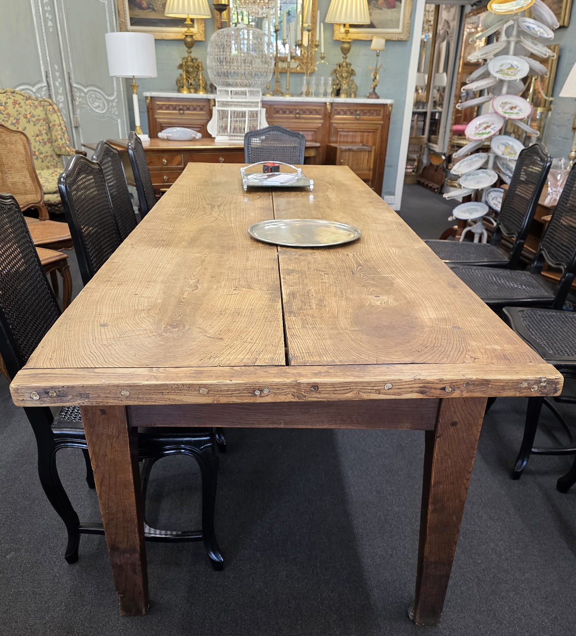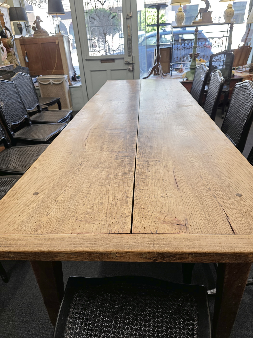 An 18th century French solid elm farmhouse table from the area of Lower Normandy, designed with typically large planks and with sturdy square-section tapering legs. The top is made from just two exceptionally thick and well-burnished planks, (taken from the same trunk), and built with early construction techniques. Please note the elegance of the book matched planks of the top and the beautiful fadedness and burnishing of the timbers. This table seats comfortably ten. Area of the Calvados, circa 1780.