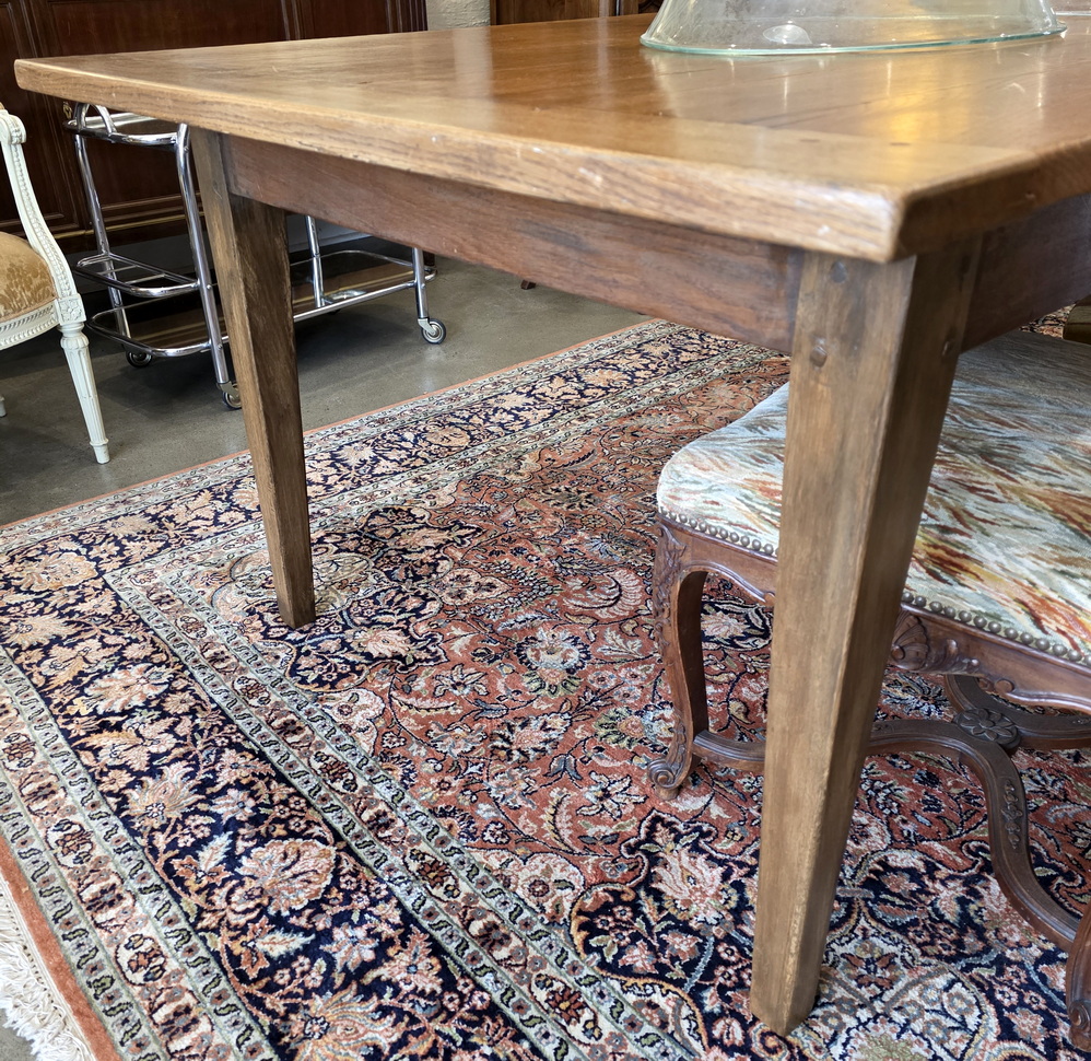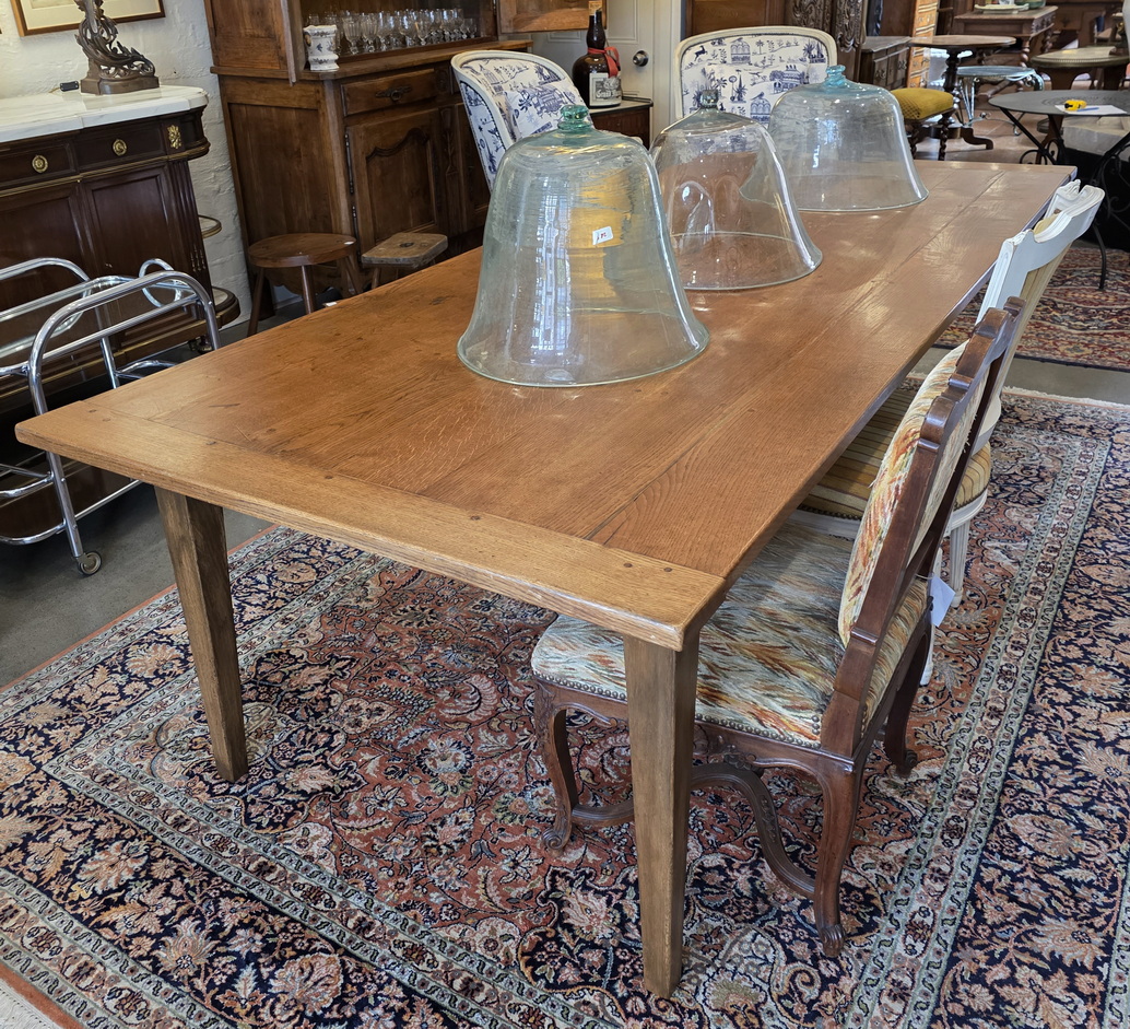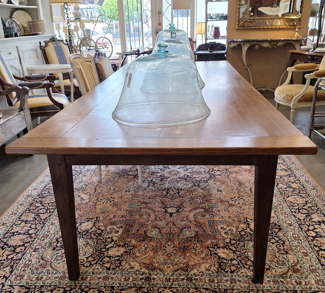 A 19th century French provincial, Louis XVI style, solid oak dining table of exceptionally long and wide proportions, a comfortable 10 to 12-seater. Of simple proportions and standing on graceful, square-section tapering legs, the top is made from wide and thick oak planks and fitted with solid oak bread-ends. The long table rails are narrow, allowing for good leg-room under the table. Please note the wonderful, well-burnished and luminous character of the table top timbers. Area of the Loire Valley, circa 1880.