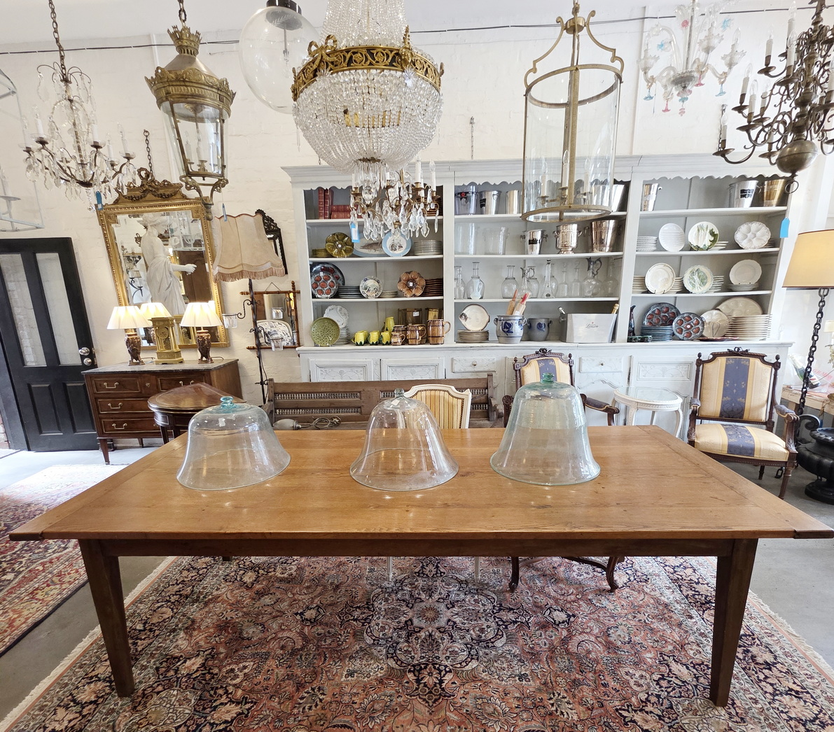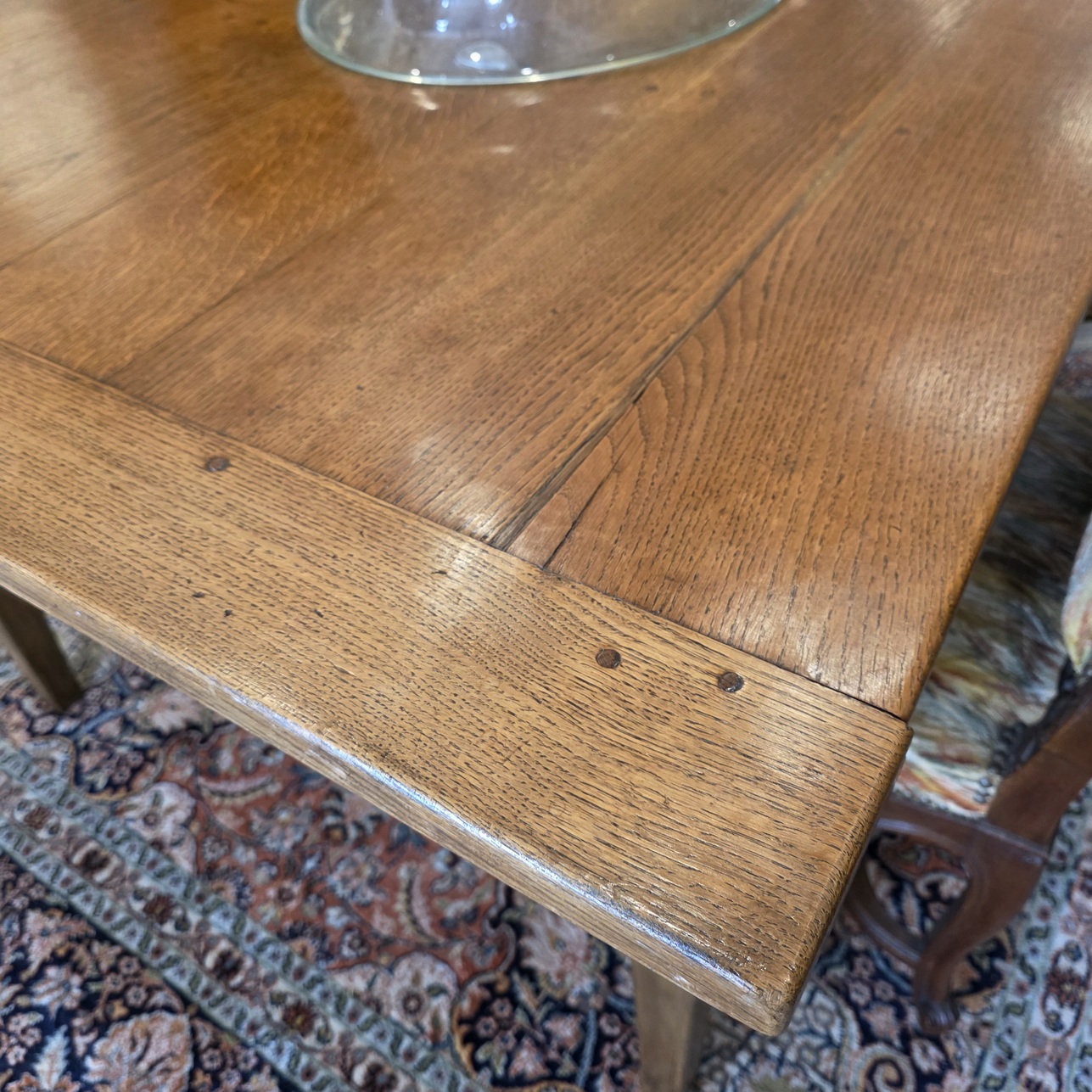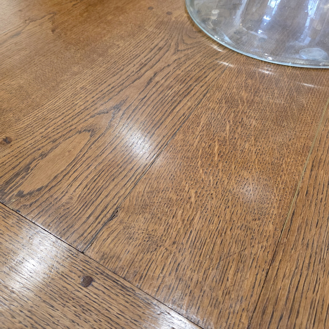 A 19th century French provincial, Louis XVI style, solid oak dining table of exceptionally long and wide proportions, a comfortable 10 to 12-seater. Of simple proportions and standing on graceful, square-section tapering legs, the top is made from wide and thick oak planks and fitted with solid oak bread-ends. The long table rails are narrow, allowing for good leg-room under the table. Please note the wonderful, well-burnished and luminous character of the table top timbers. Area of the Loire Valley, circa 1880.