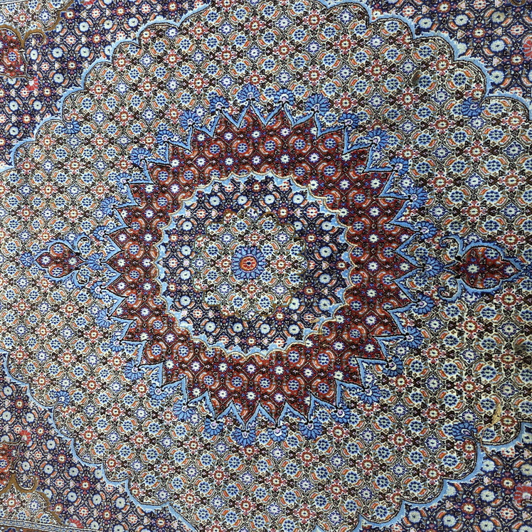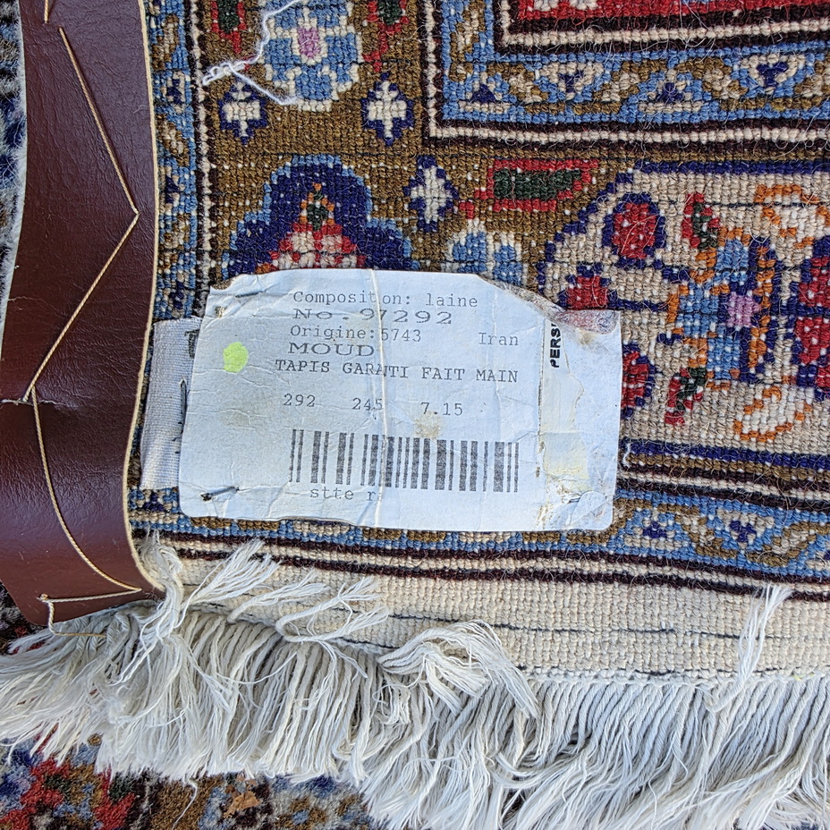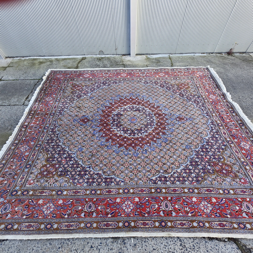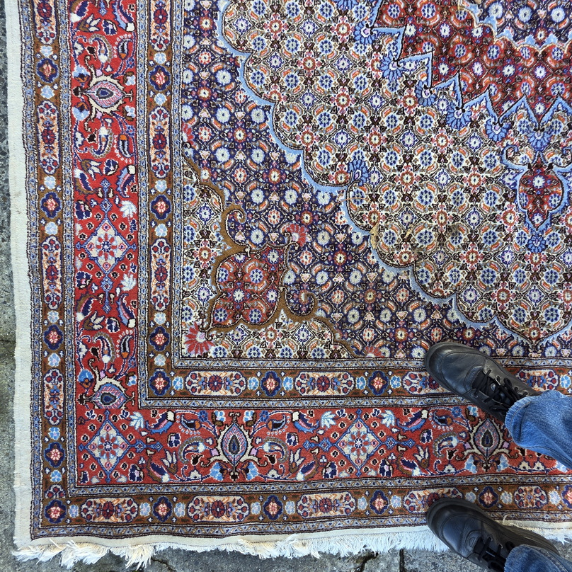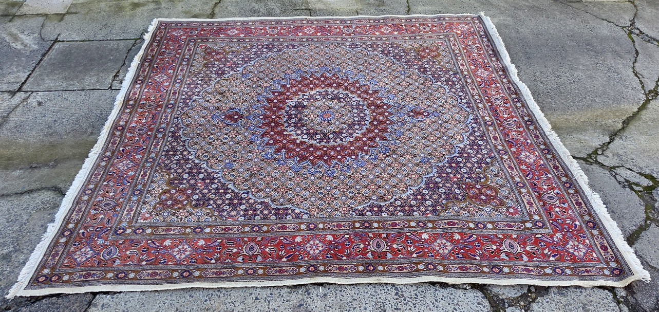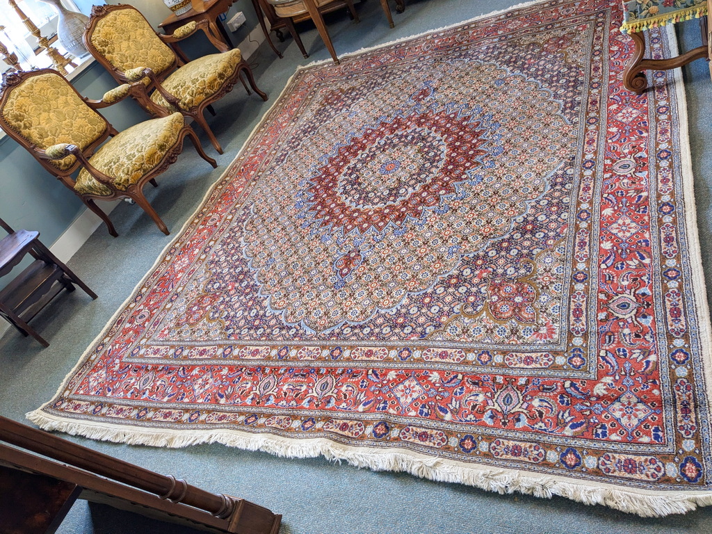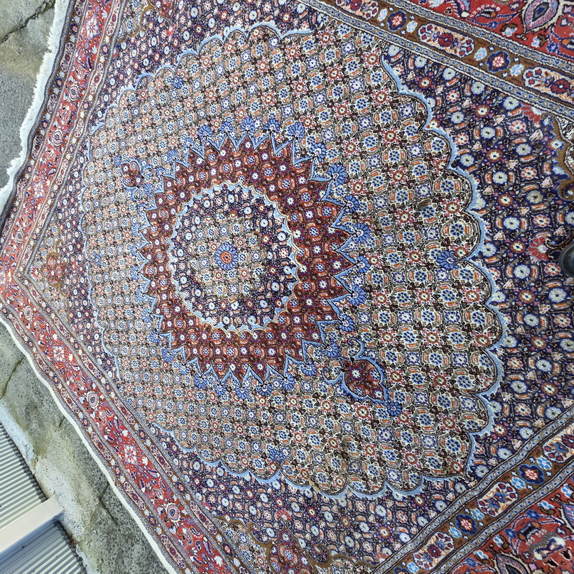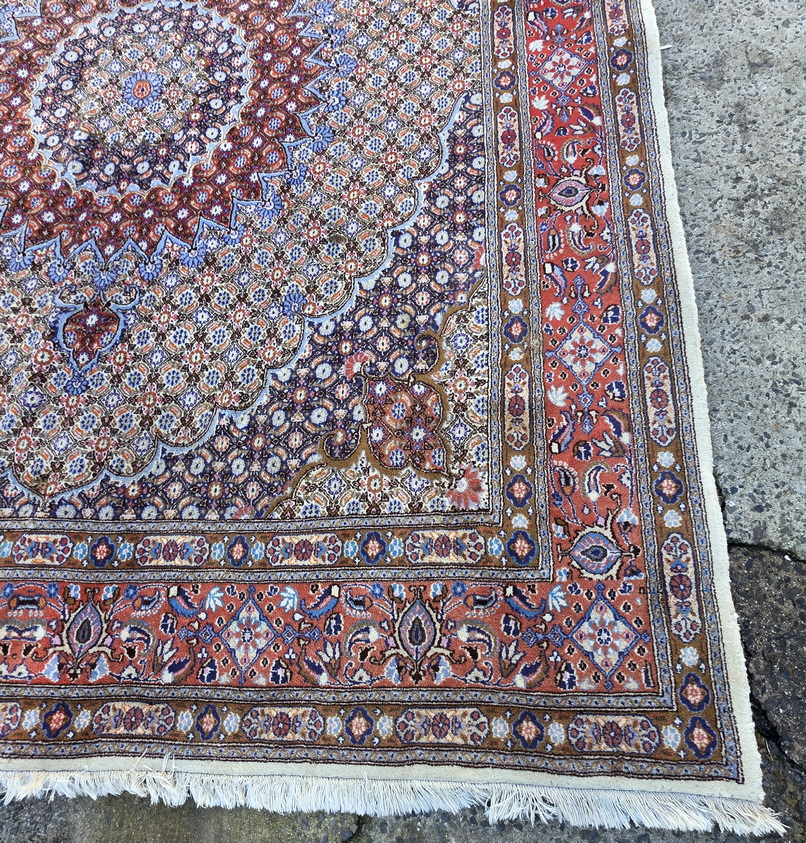 A large Persian Moud tribal rug decorated with a central medallion pattern and with fine Herati geometric patterns. The thickness and the tightness of wool-weave are designed to withstand a high-traffic area. Area of Eastern Iran, circa 1960.