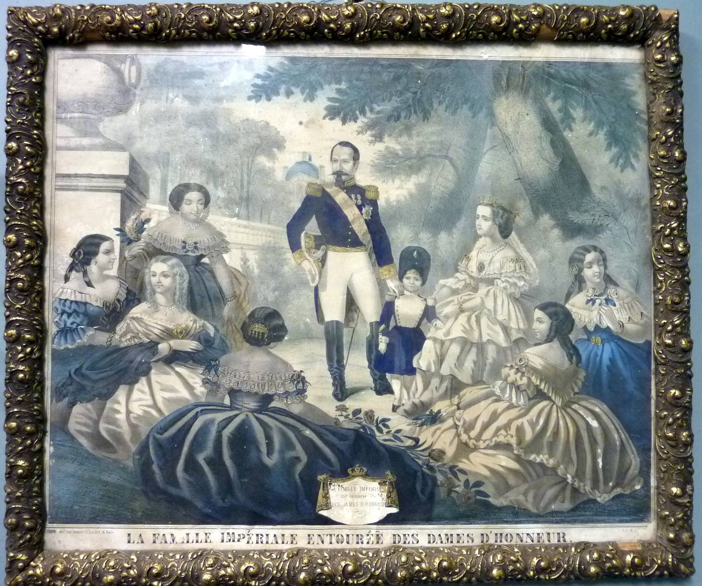 A mid 19th century French Napoleon III period hand-coloured print in its original frame (and glass) depicting the Emperor Louis-Napoleon Bonaparte and his family, with their four Maids of Honour.