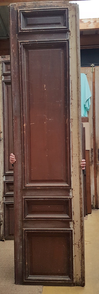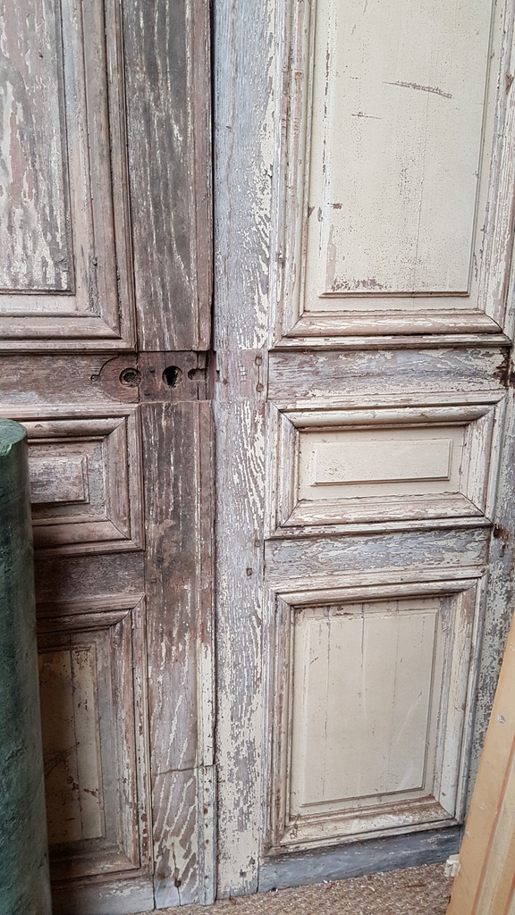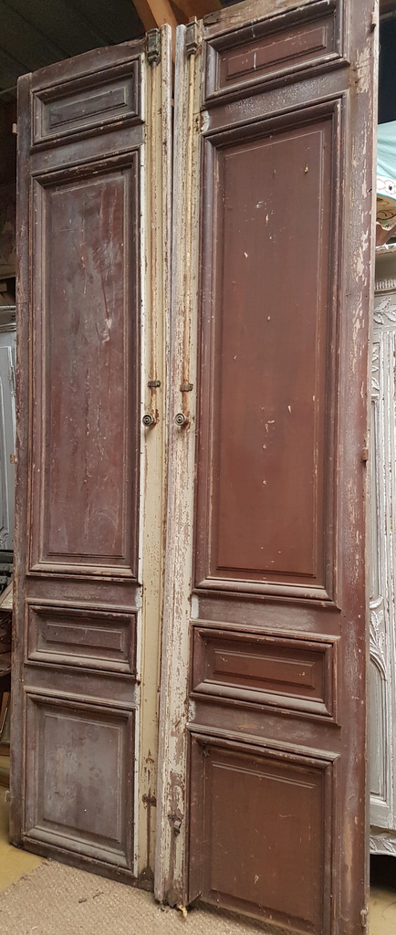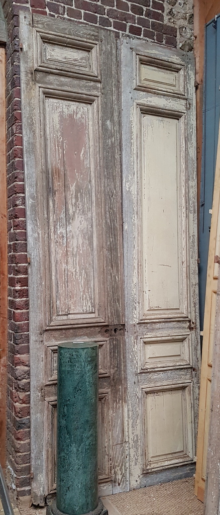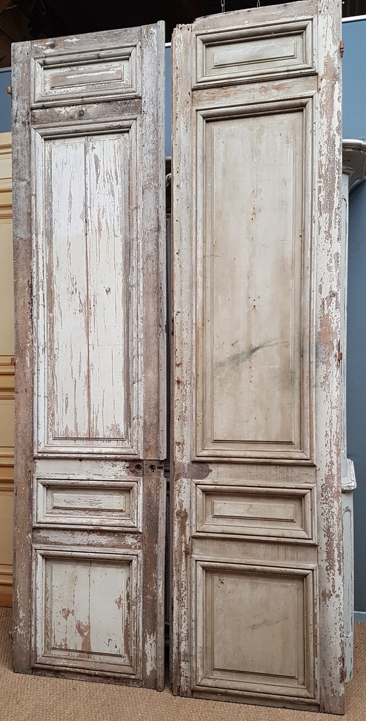One pair of tall 19th century French internal double-doors, traditionally jointed, moulded and panelled, each with the dry remnants of several coats of paint over the pine timbers. Area of Paris, circa 1860.