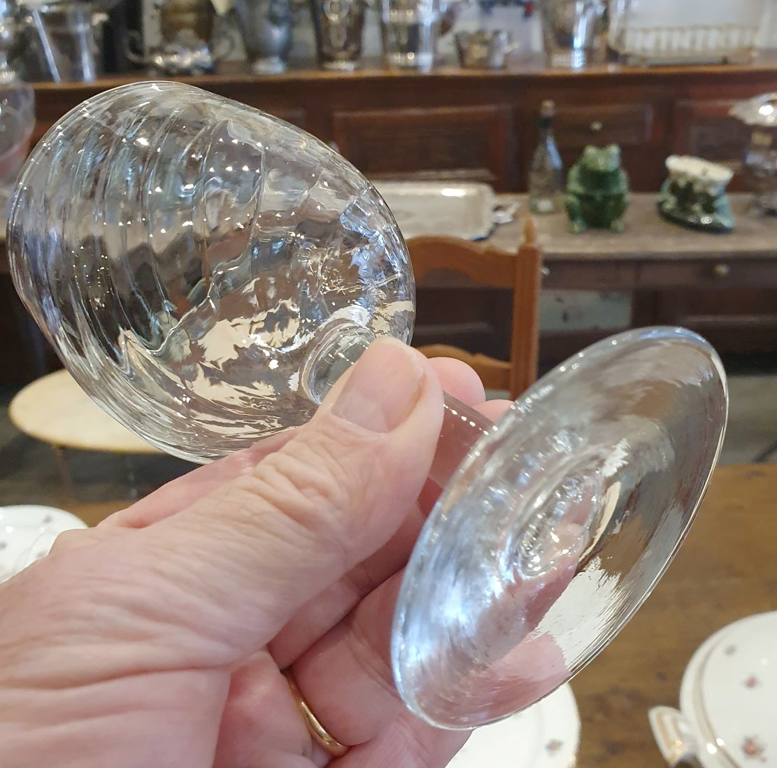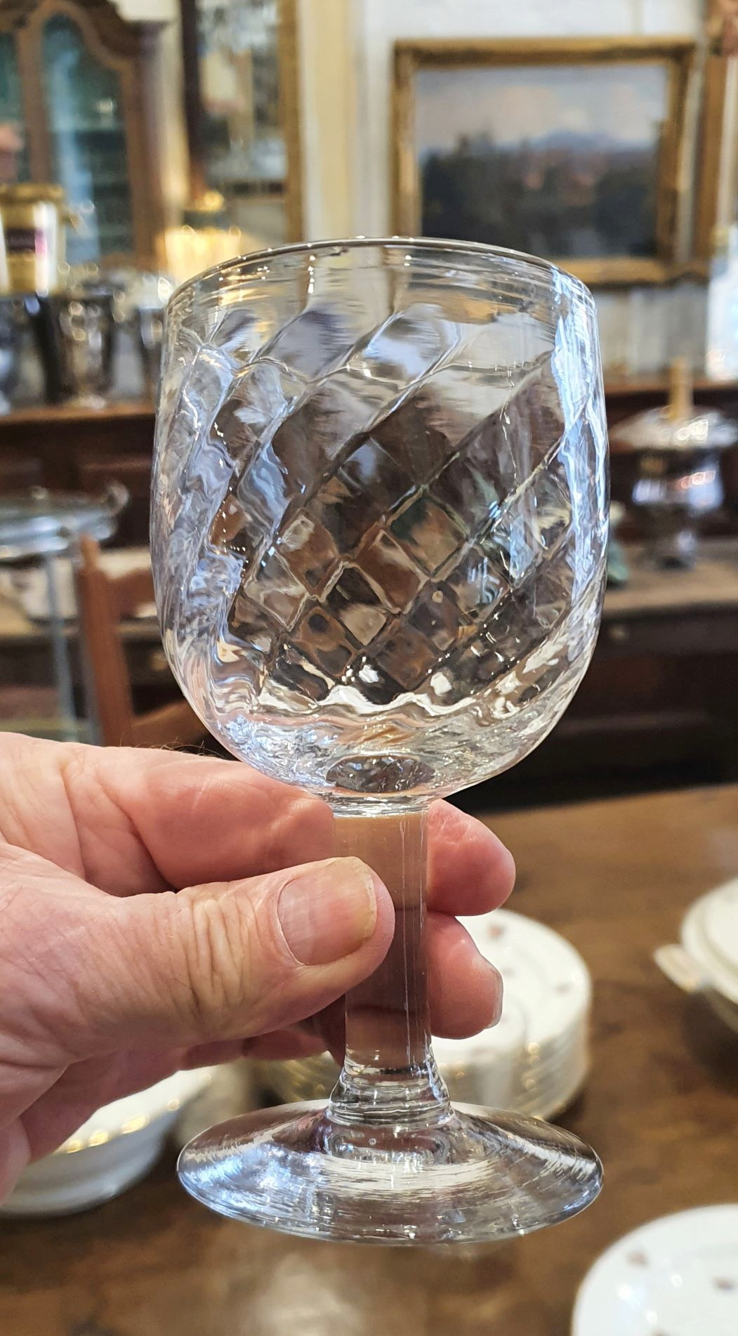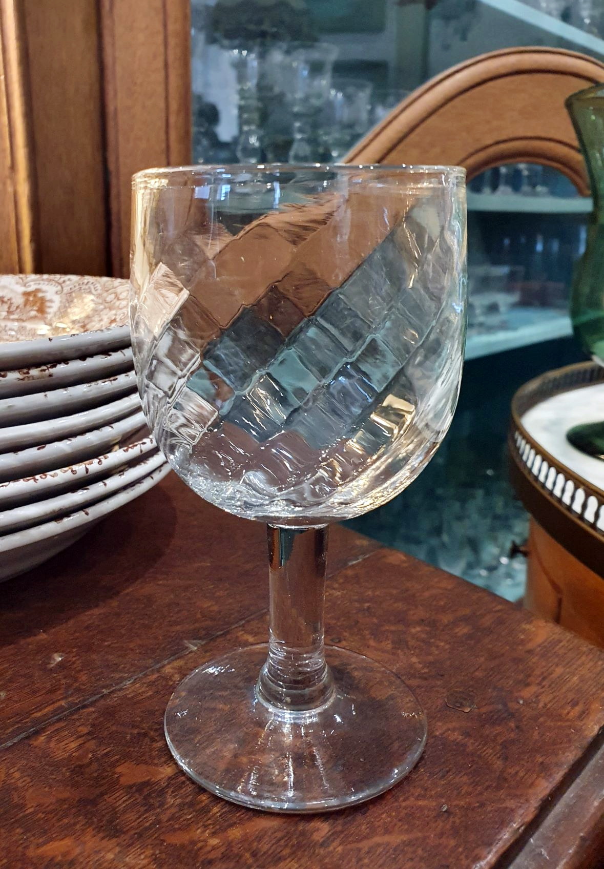 A set of six 19th century, French Napoleon III period, blown-glass wine glasses of fine quality, the bowls decorated with a raised 'spiral-ribbing' pattern, standing on simple stems and plinths. The undersides of the plinths show the original pincer marks of the glassblower. Area of Burgundy, circa 1870.