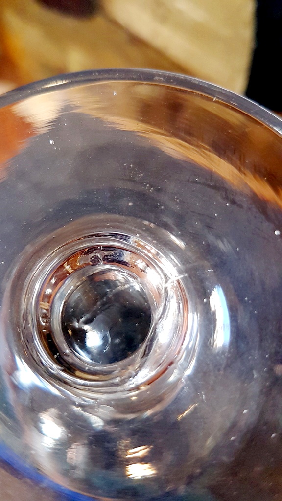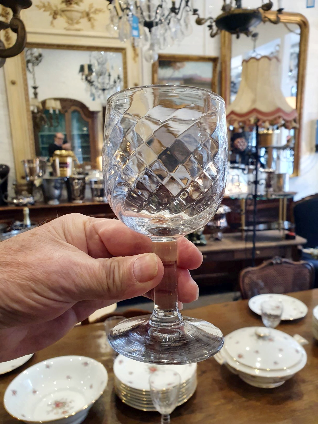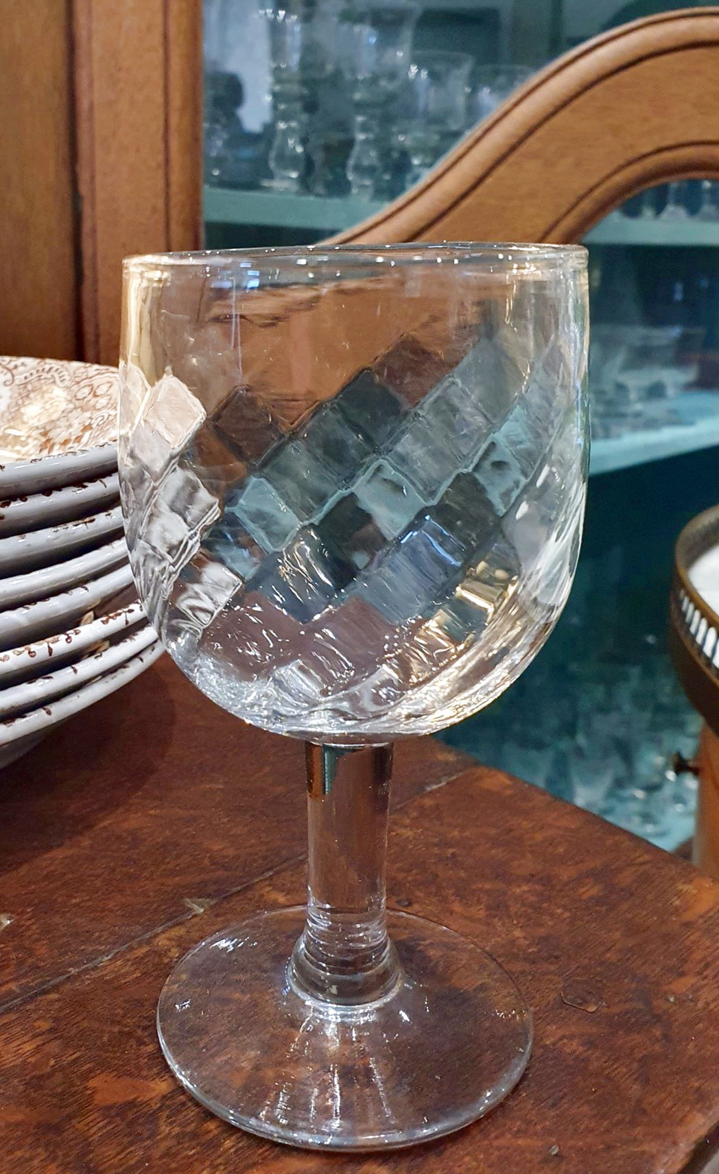 A set of six 19th century, French Napoleon III period, blown-glass wine glasses of fine quality, the bowls decorated with a raised 'spiral-ribbing' pattern, standing on simple stems and plinths. The undersides of the plinths show the original pincer marks of the glassblower. Area of Burgundy, circa 1870.