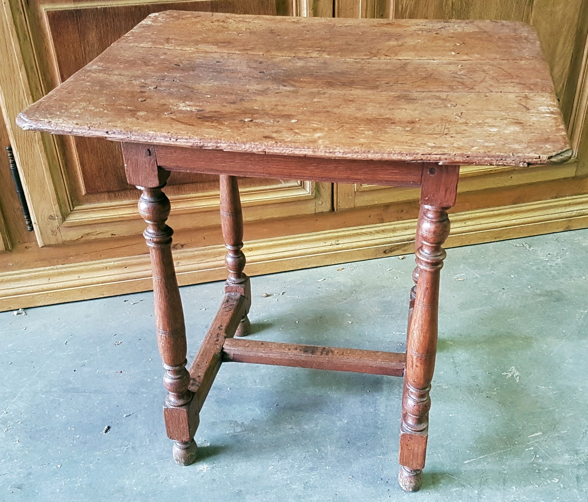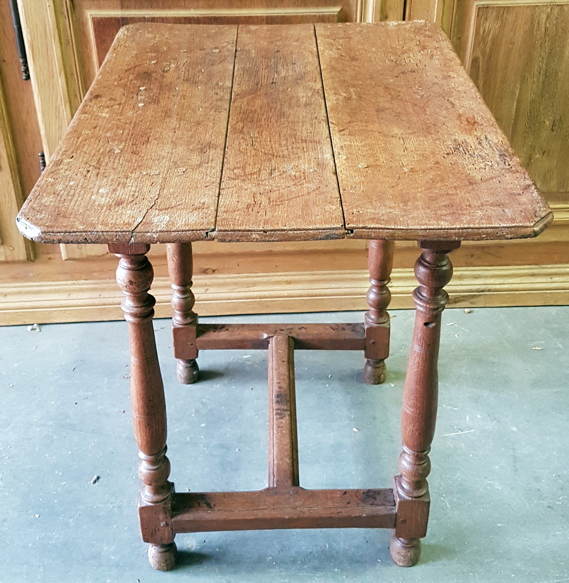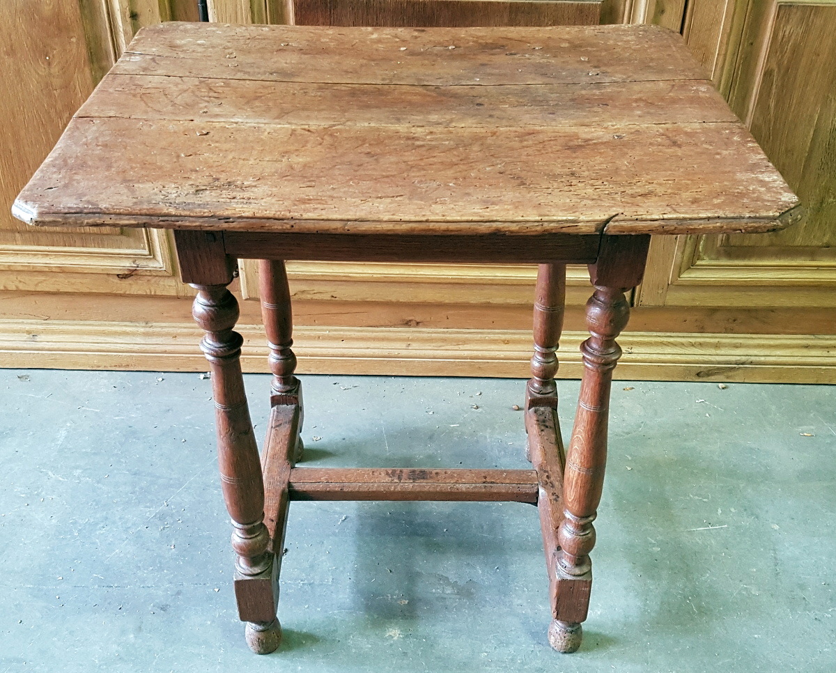 An 18th century French Regence period solid oak side table, the elegantly moulded top standing on four baluster-turned legs joined by a shaped ‘H’ stretcher. Area of Isle de France (Greater Paris), circa 1730.