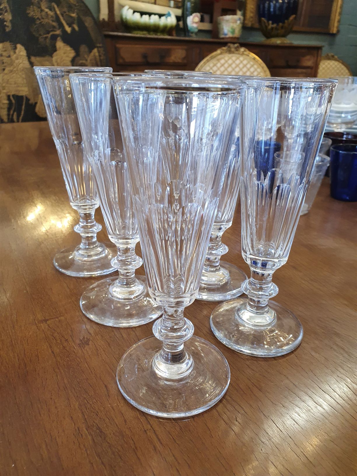 A set of six 19th century French Napoleon III period cut crystal champagne flutes of simple and elegant design, the tapering, long 'flute' bowls with a water-wheel cut pattern, standing on baluster turned stems with wide plinths. Area of Isle de France (Greater Paris), circa 1860.Price is for the set of six.