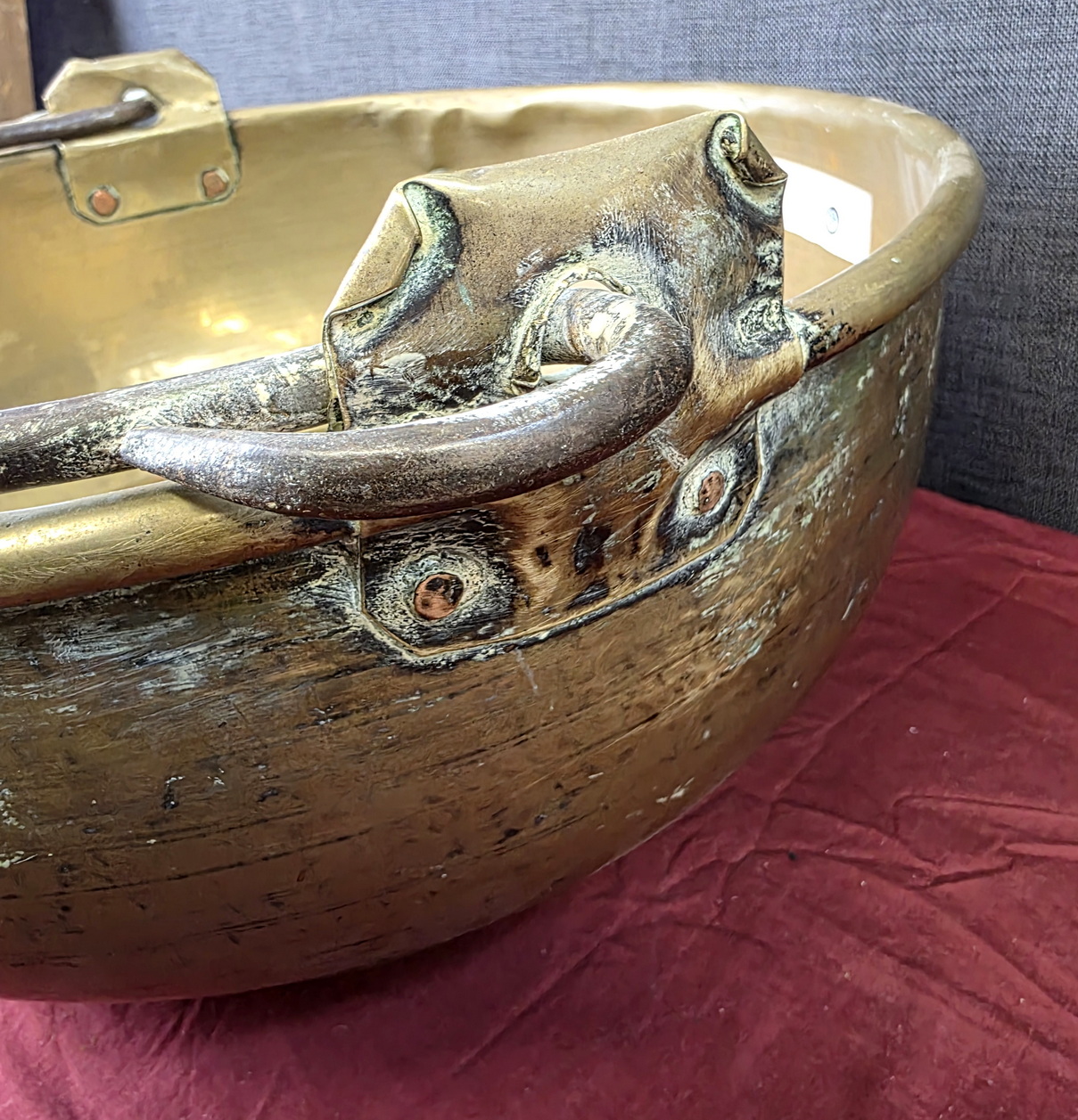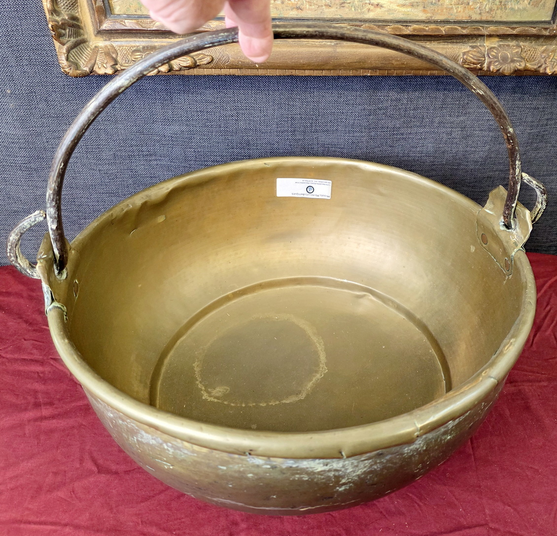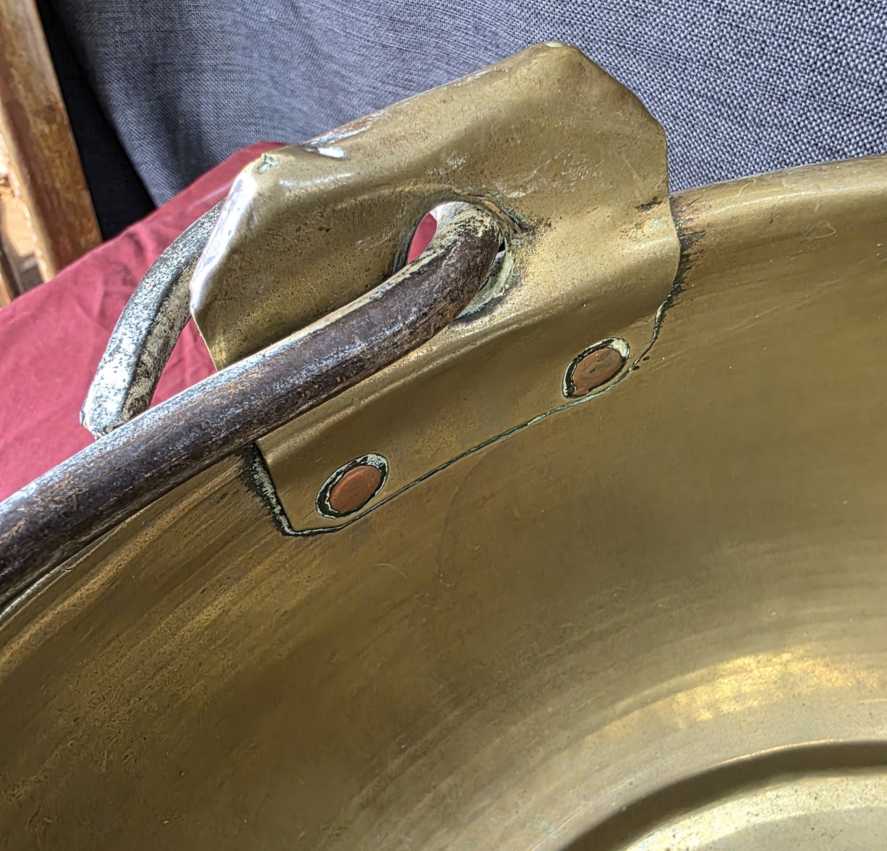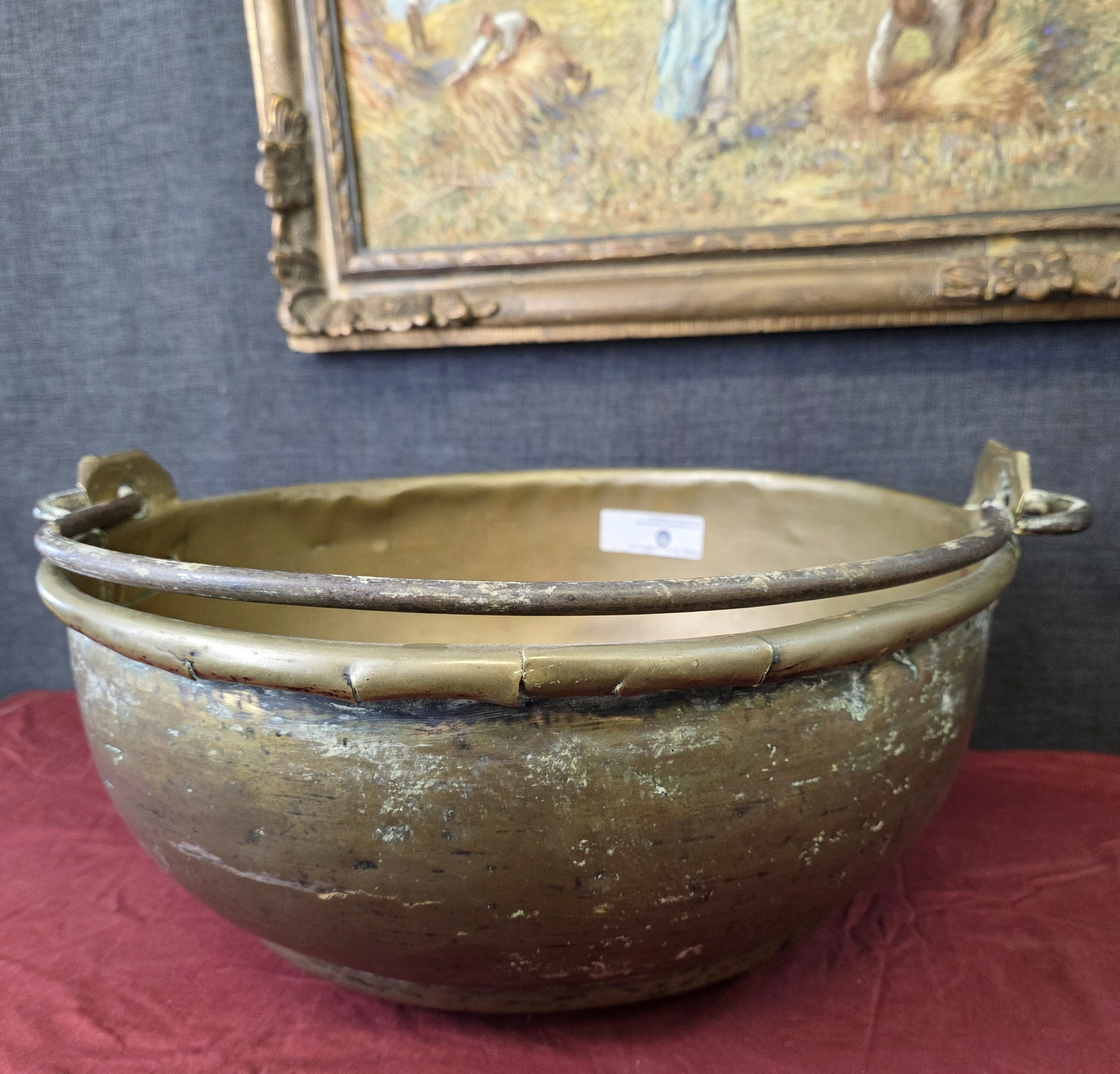 An 18th century French repouseed brass brass cooking pot retaining its large forged steel carrying handle. Please note the rivets of its early construction and the character gained from generations of use. Area of Normandy, circa 1780.