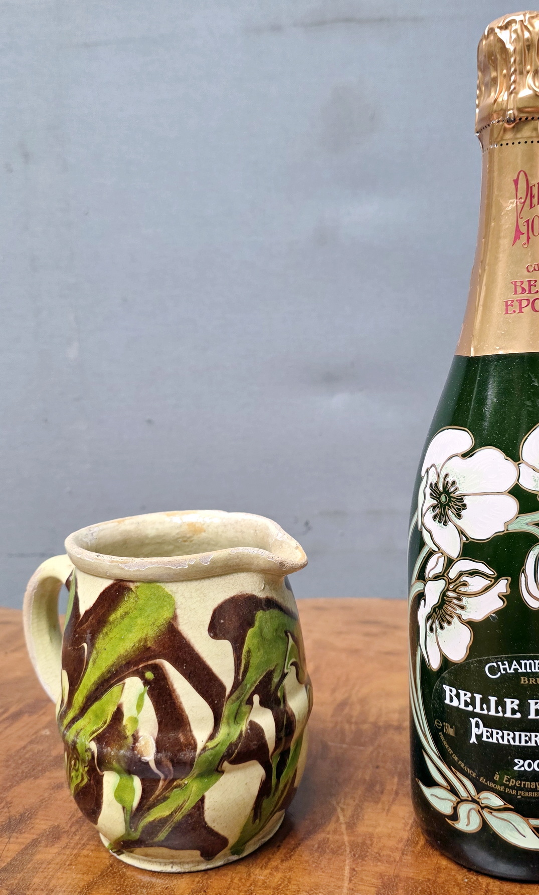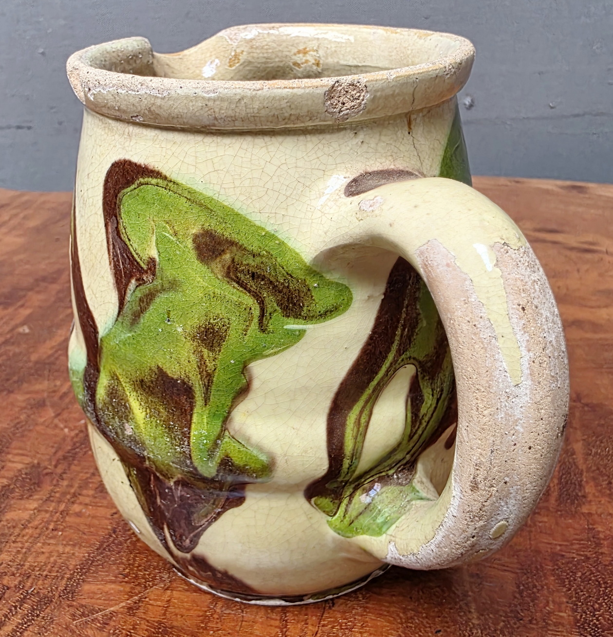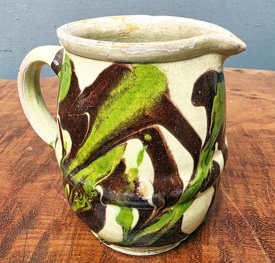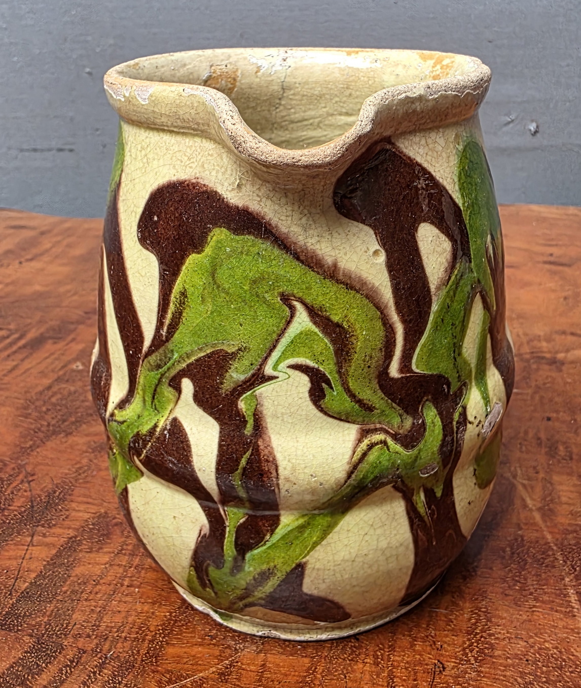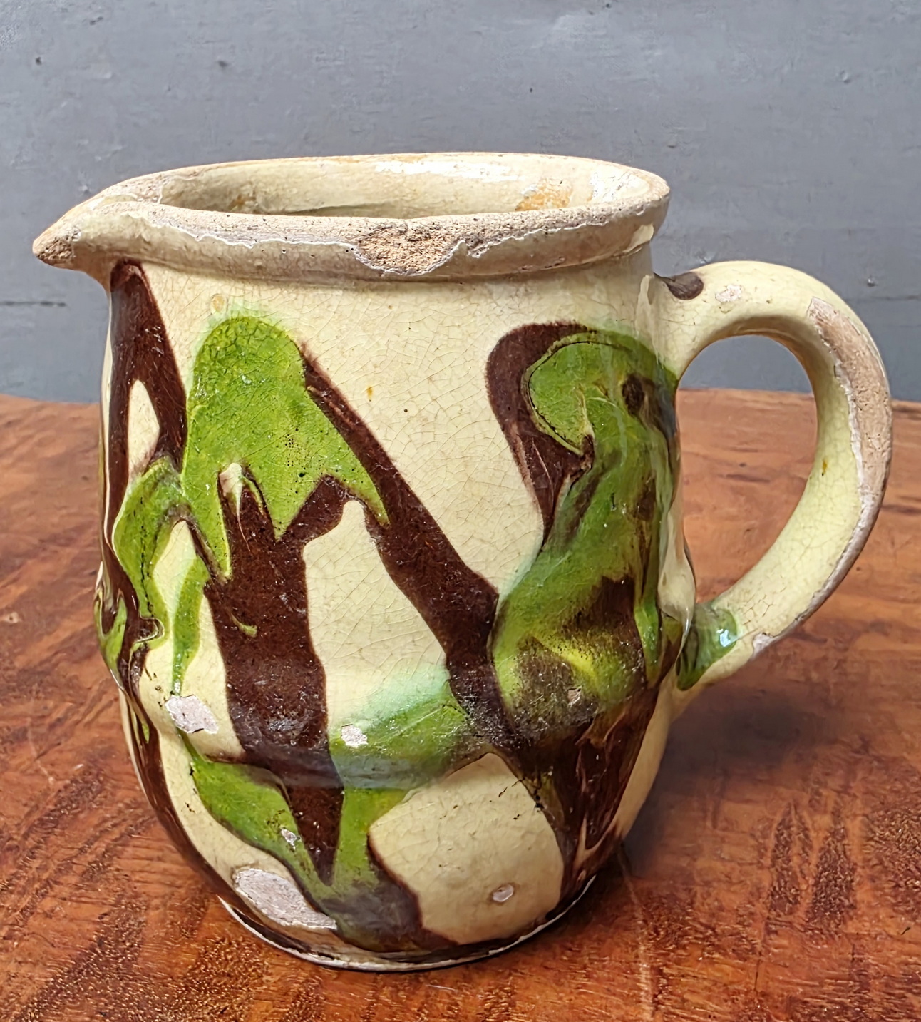 An early 19th century French provincial faience wine jug, decorated with simple 'jasper' patterns in tones of green, on a cream background. Area of Southern France, circa 1800.