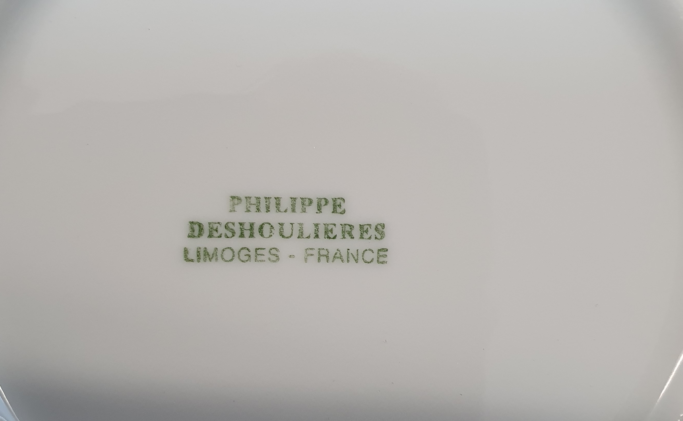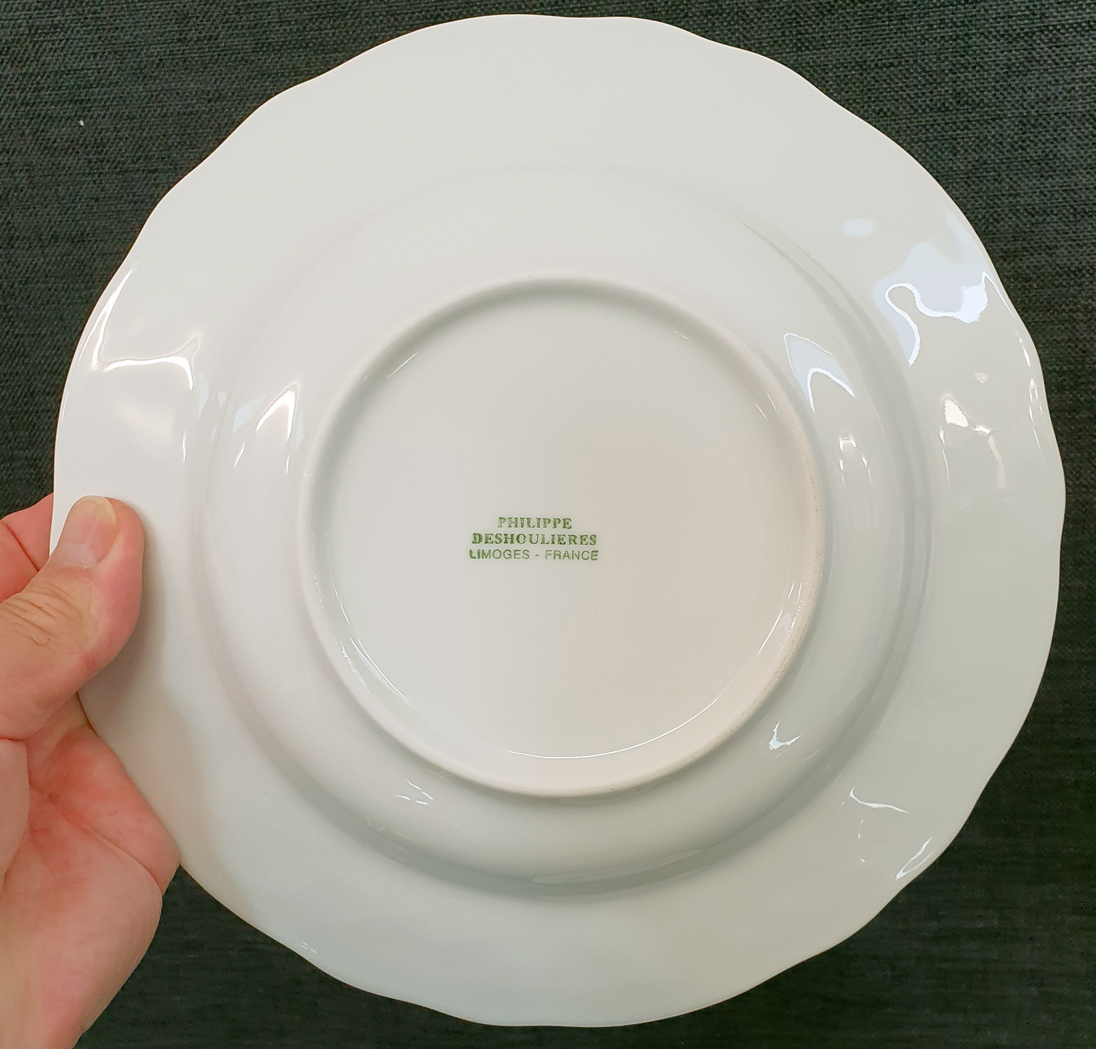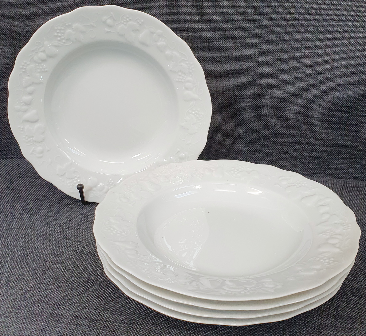 A set of five Limoges 'Blanc De Blanc' porcelain soup plates decorated with haut-relief patterns of vine and grapes, pears and strawberries. The undersides stamped with the maker's mark "Philippe PH Deshoulieres, Limoges". France, circa 1960.