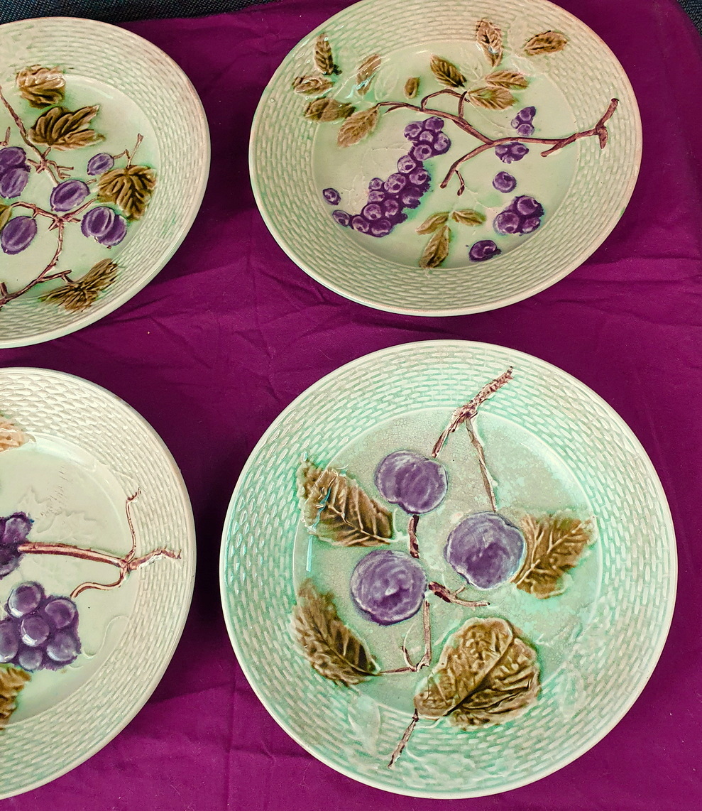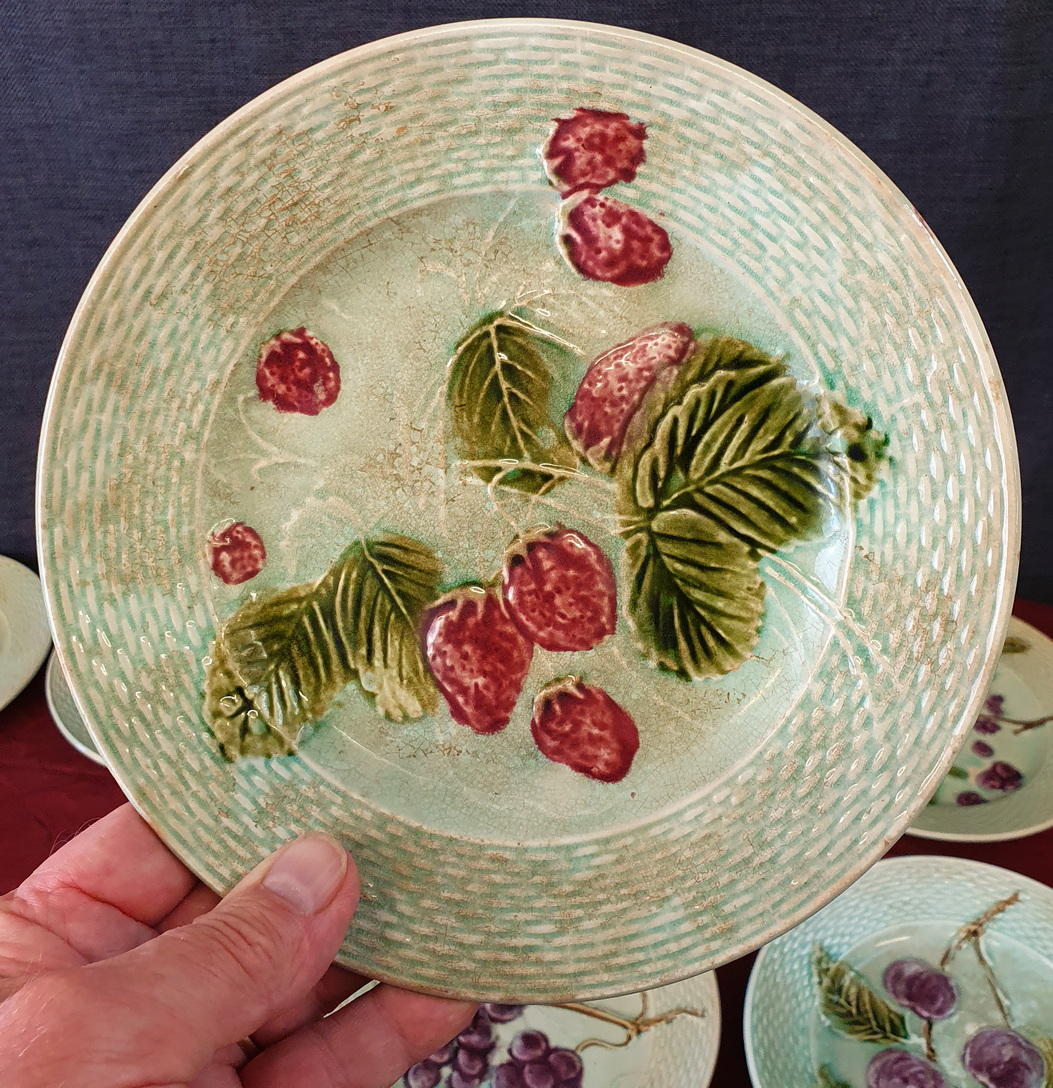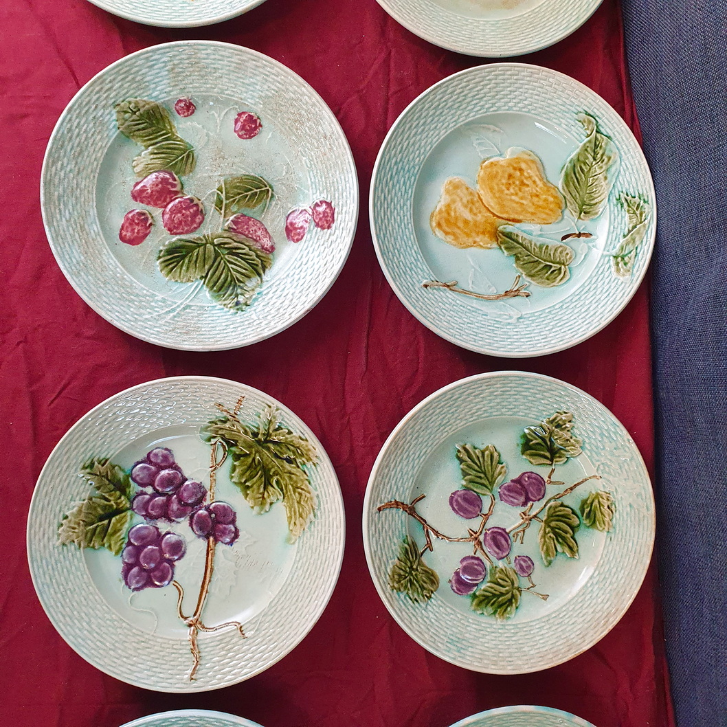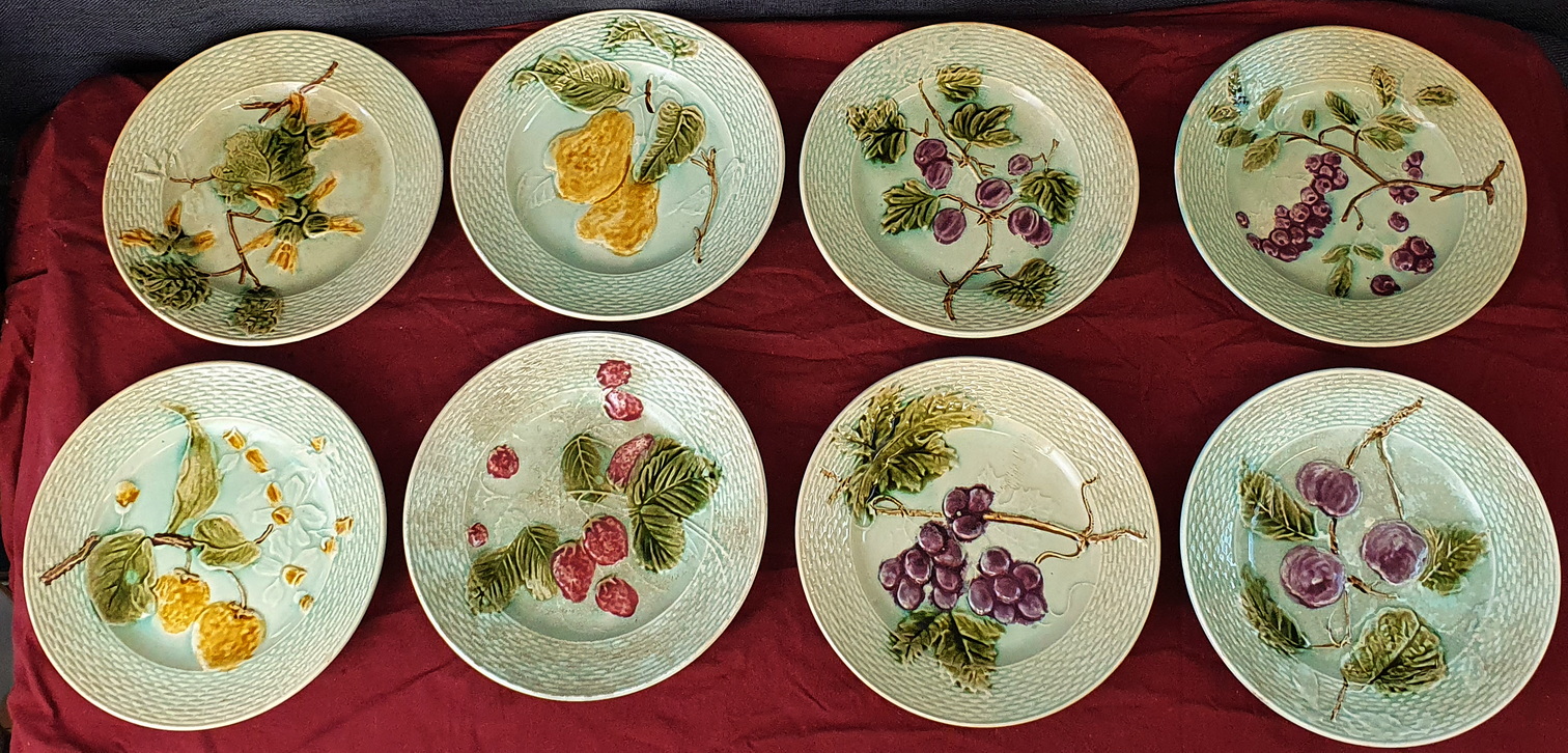 A set of eight French Art Nouveau period majolica dessert plates, the raised decorations painted in pale colour glazes depicting fruit and branches with leaves, on a basket weave background.Typical manufacture of the 'Saint Amand Hamage' pottery. Area of Northern France, circa 1880.