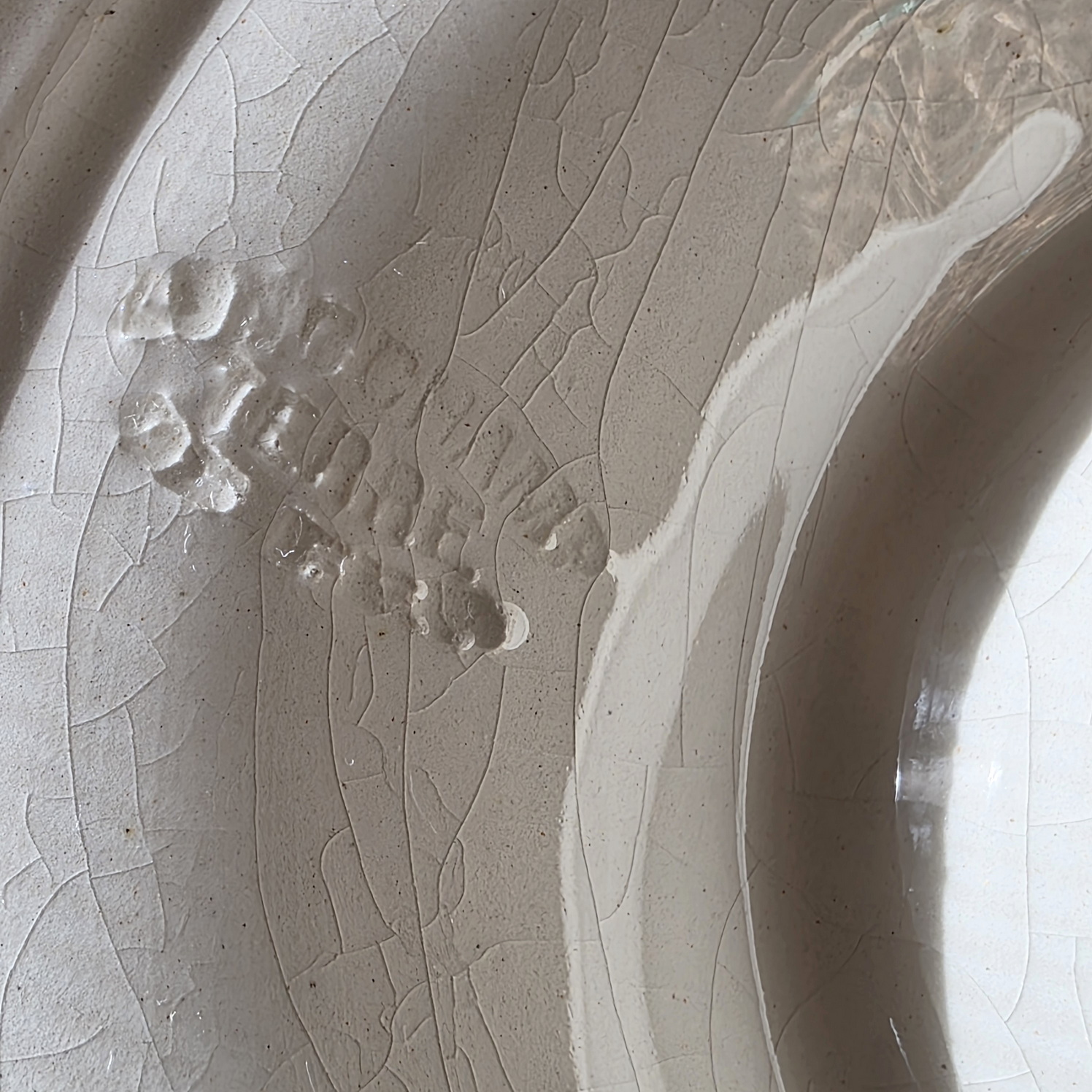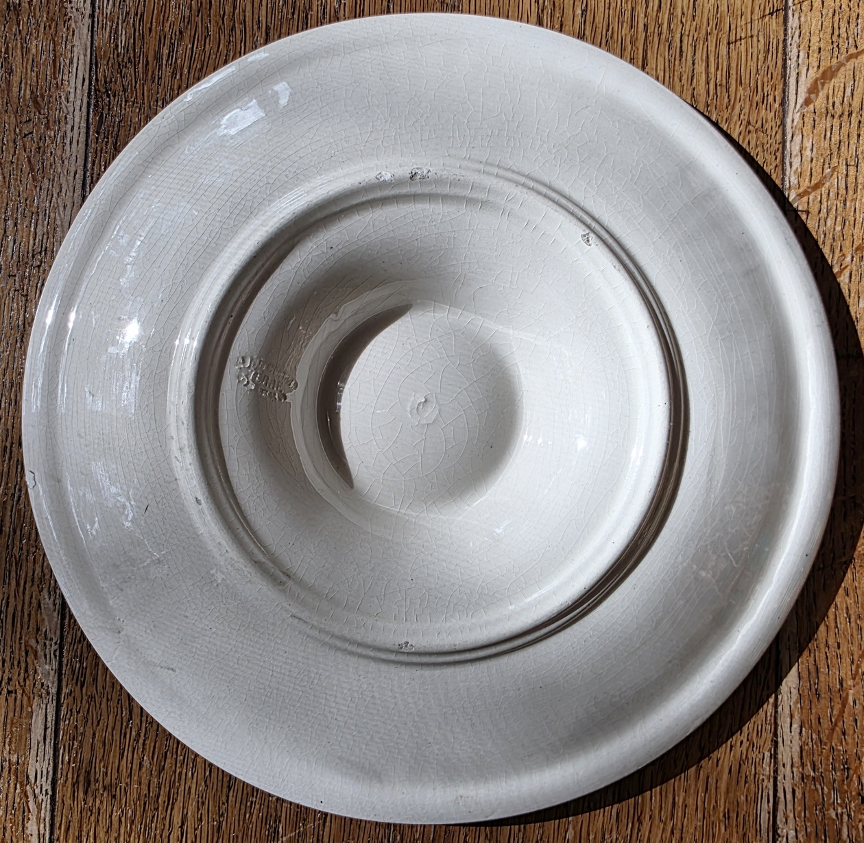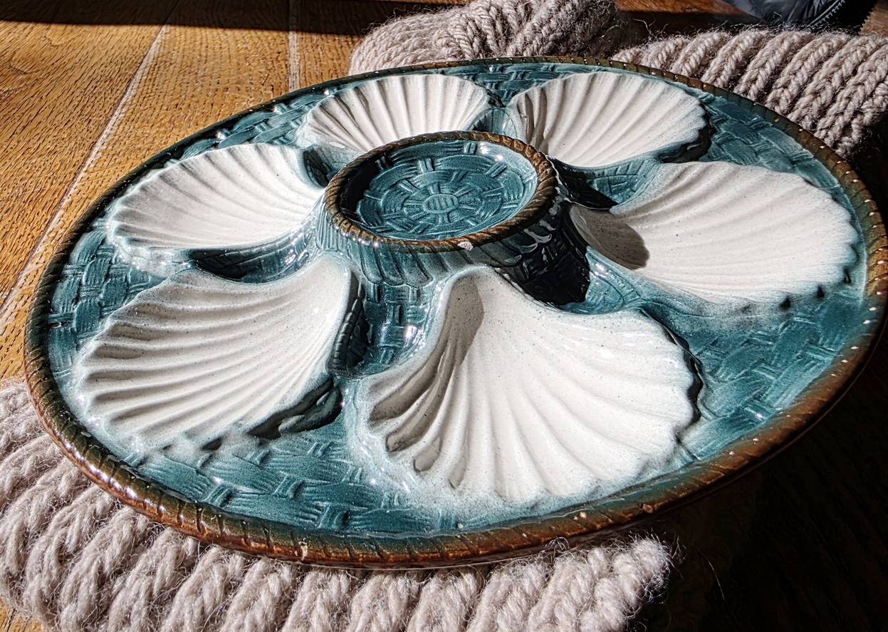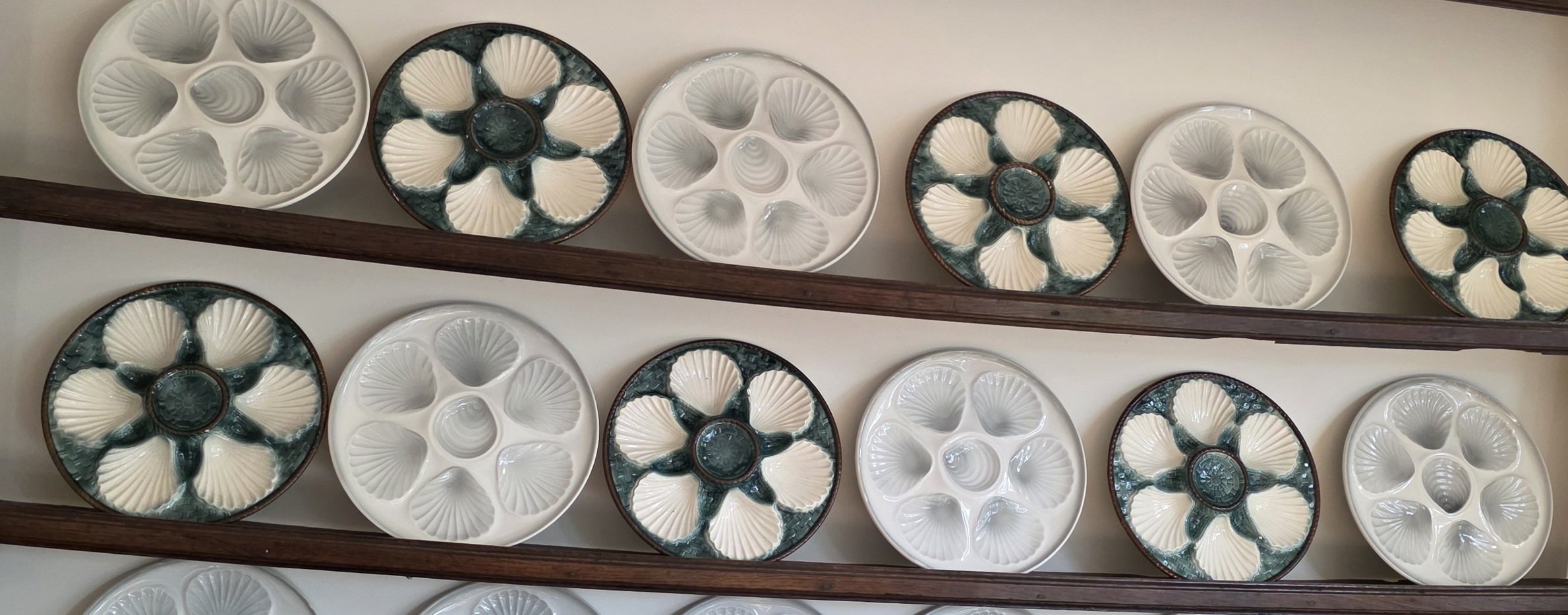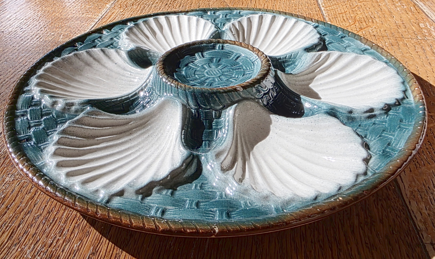 A set of six 19th century French 'Longchamp' majolica oyster plates, each oyster plate designed to hold six oysters or scallops, plus a slice of lemon in the centre. Hand painted in natural colours and decorated in the shape of oyster shells lying on a bed of woven wicker. The undersides with the "Longchamp and Terre de Feu" hallmarks, stamped on the glaze. Area of Cote d'Or, France, circa 1890.