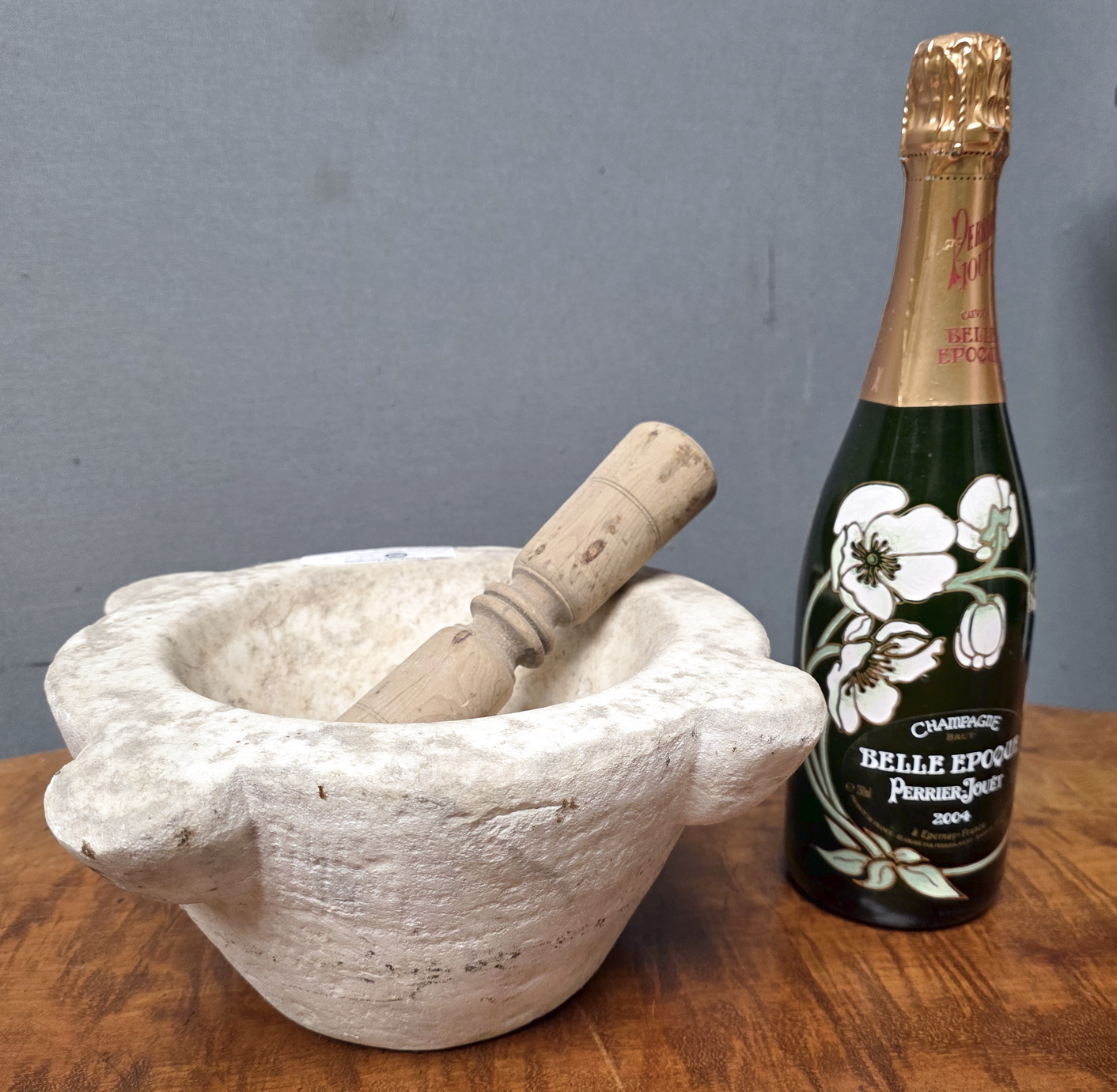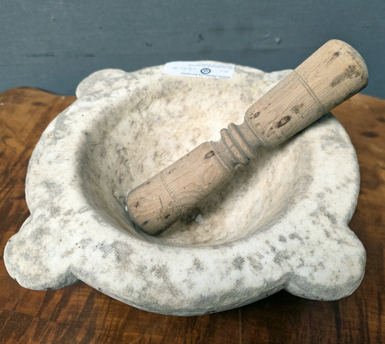 An 18th century French carved Carrara marble kitchen mortar used for crushing nuts, herbs and garlic, typically decorated with its four protruding 'ears'. Sold here with a later, turned hardwood pestle. Area of Paris, circa 1780.