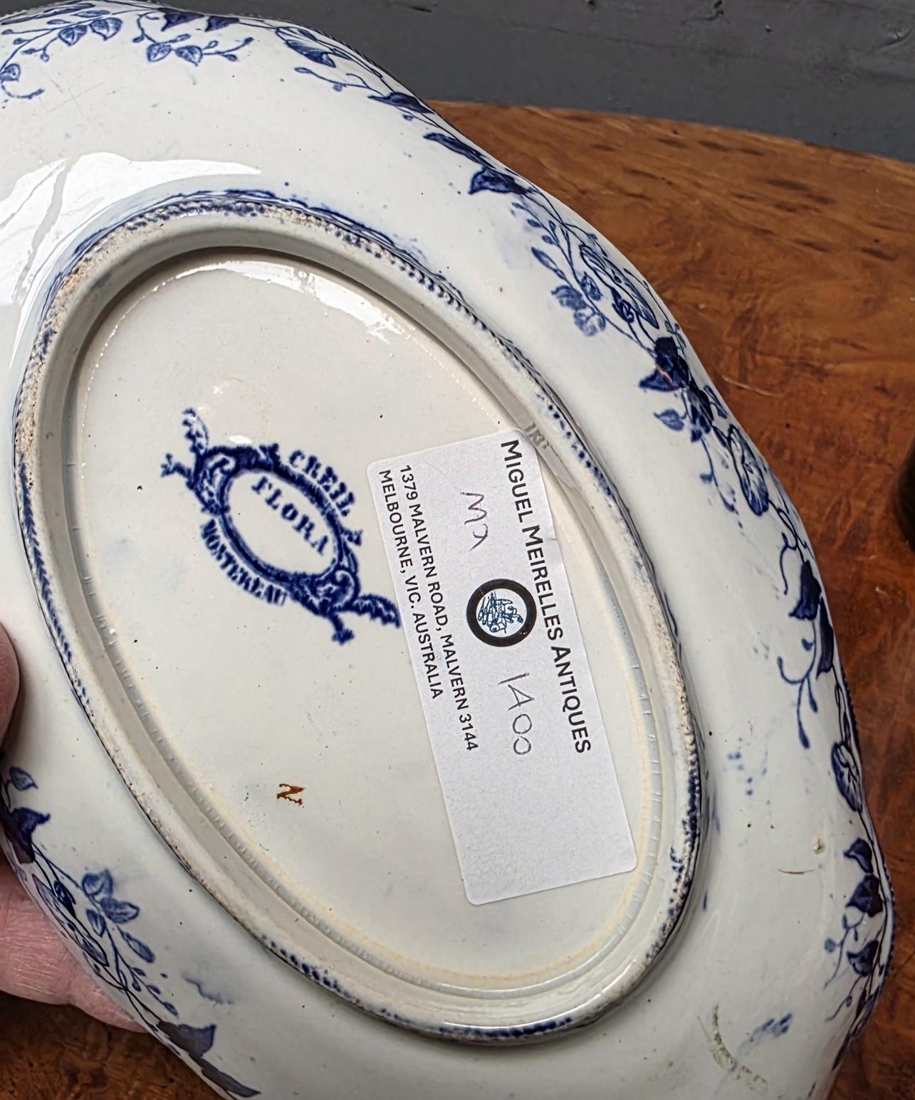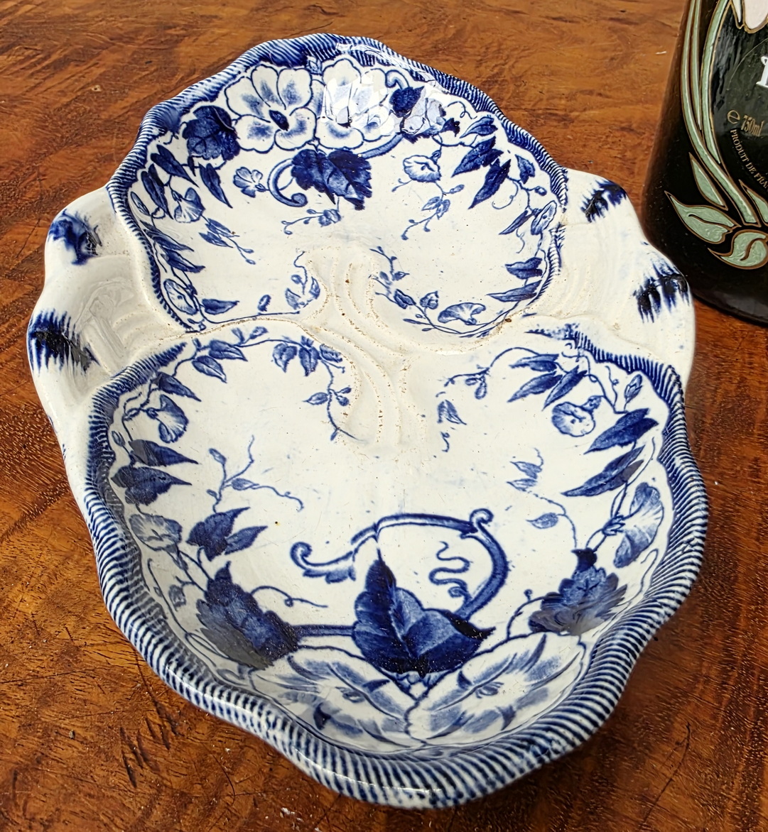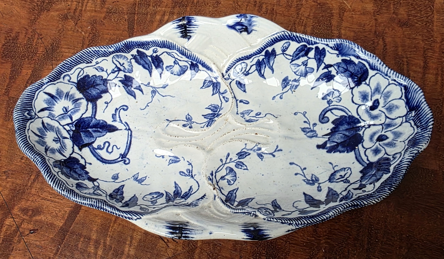 A 19th century French Art Nouveau period faience 'ravier' (delight) platter designed to serve delicacies. This shaped, two-compartment platter is decorated with blue vines with leaves and with morning glory flowers, on a white background. The underside is stamped with the hallmark of the 'Creil-Montereau' potteries, and with the model name 'Flora'. Area of Greater Paris, circa 1880.