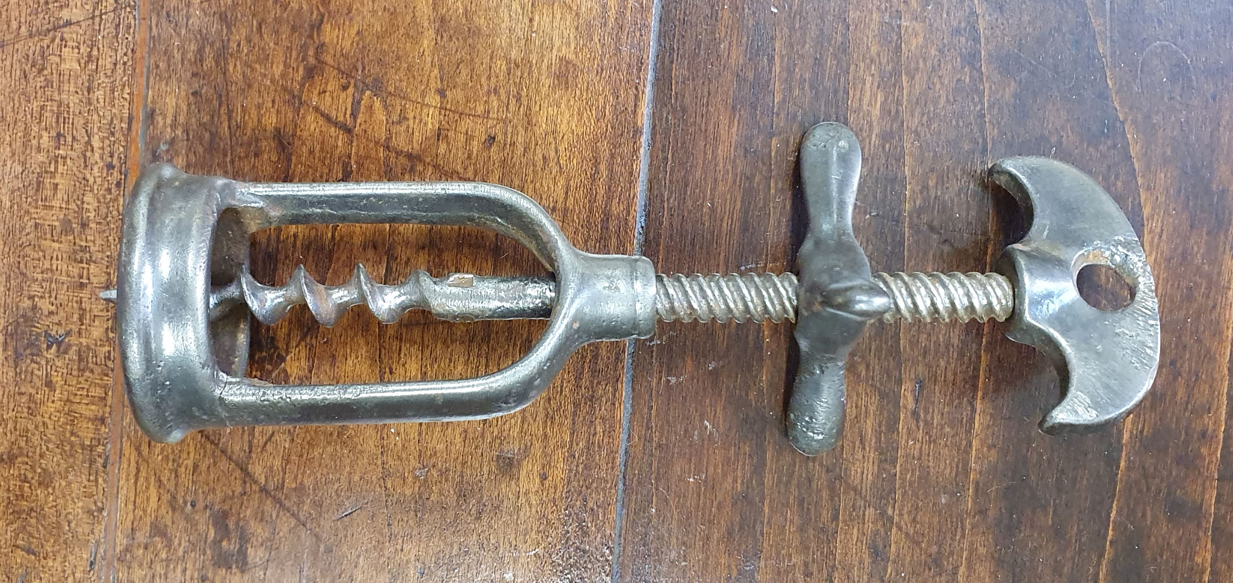 A vintage French flynut corkscrew, the top two-wing nut used to dig the screw into the cork, the lower three-wing flynut used to remove the cork. France, circa 1930.