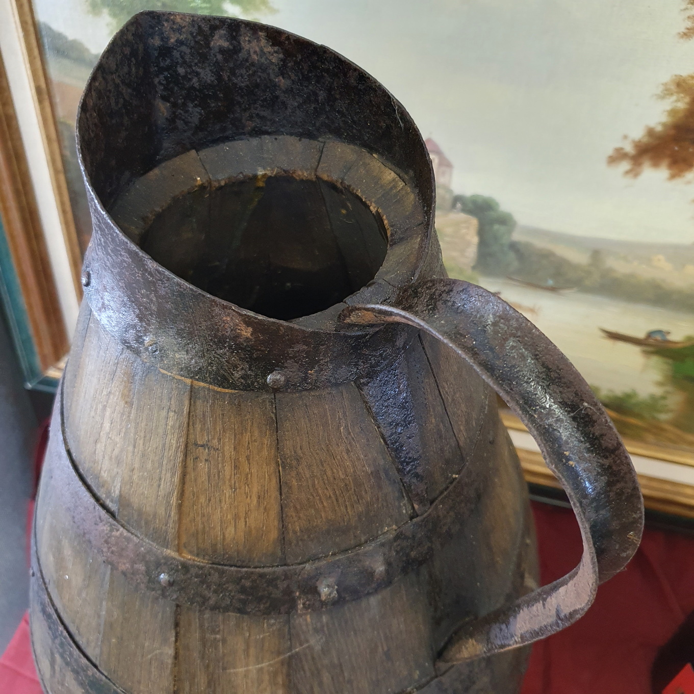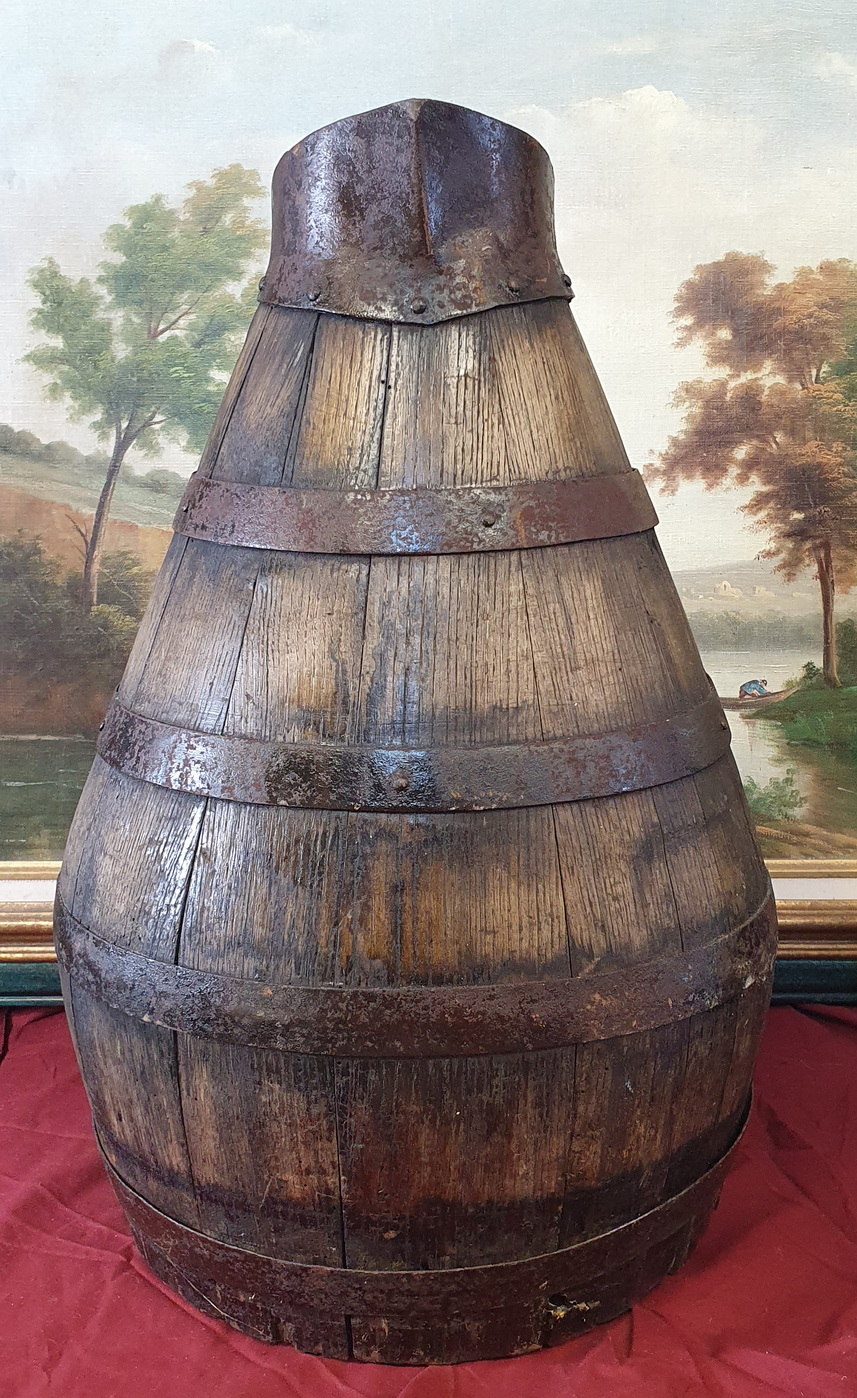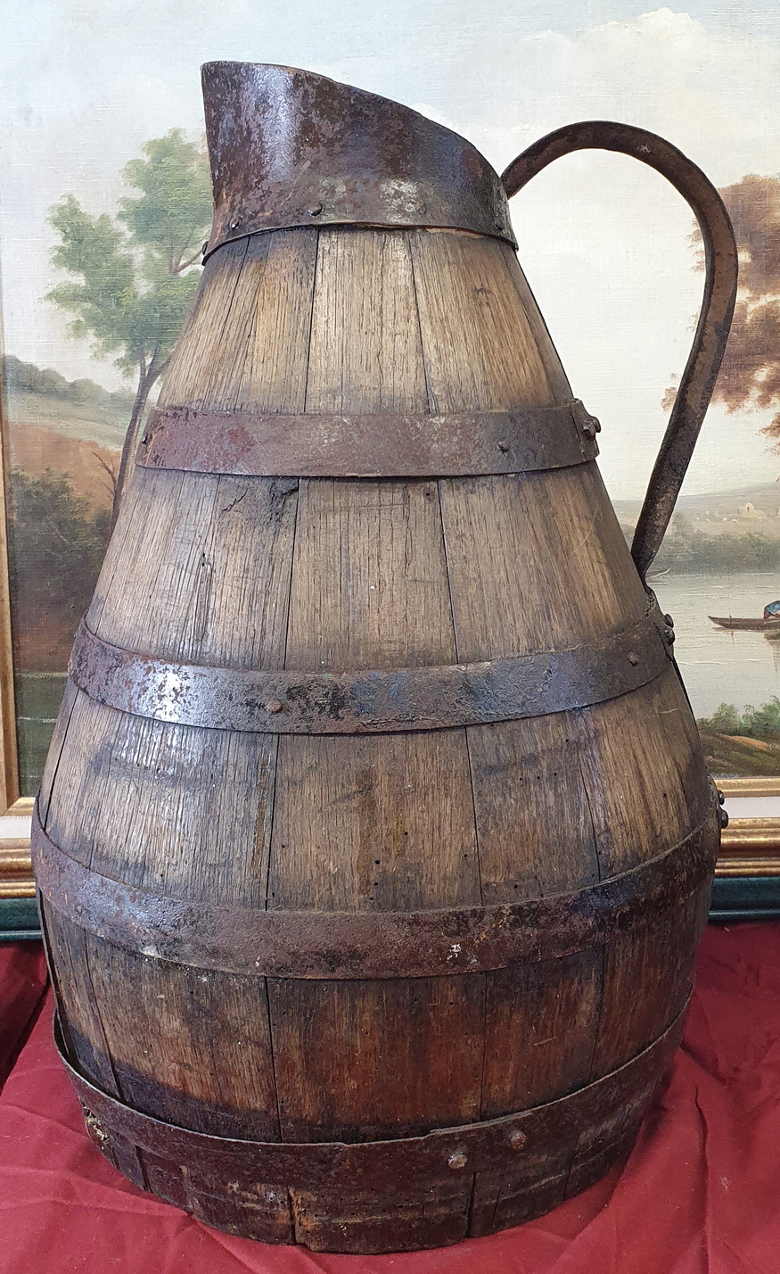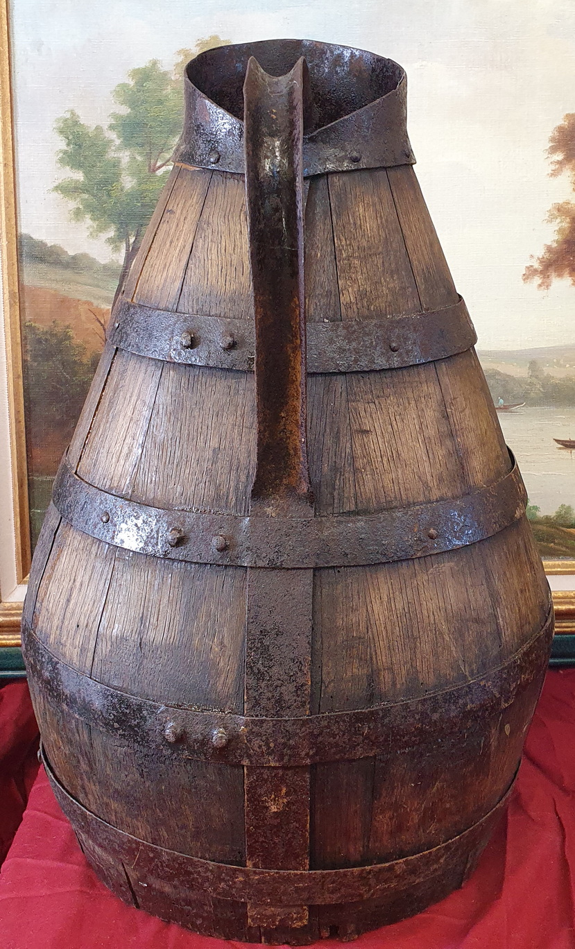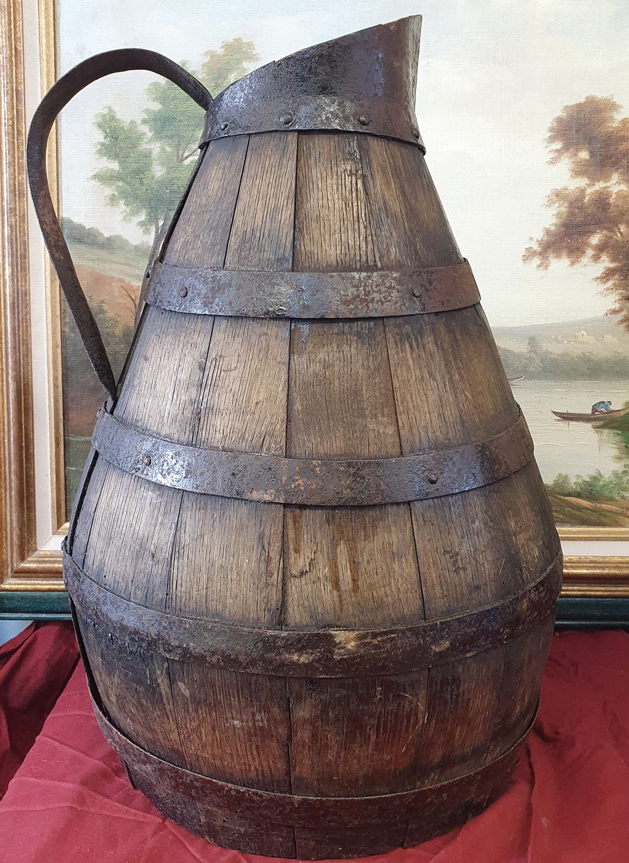 An exceptionally large, 18th century French provincial oak and steel-banded 'pichet' measuring jug, used for measuring/ serving wine and cider. This pitcher was made with fine and traditional coopering work by French wine barrel-makers. Area of Normandy, circa 1780.