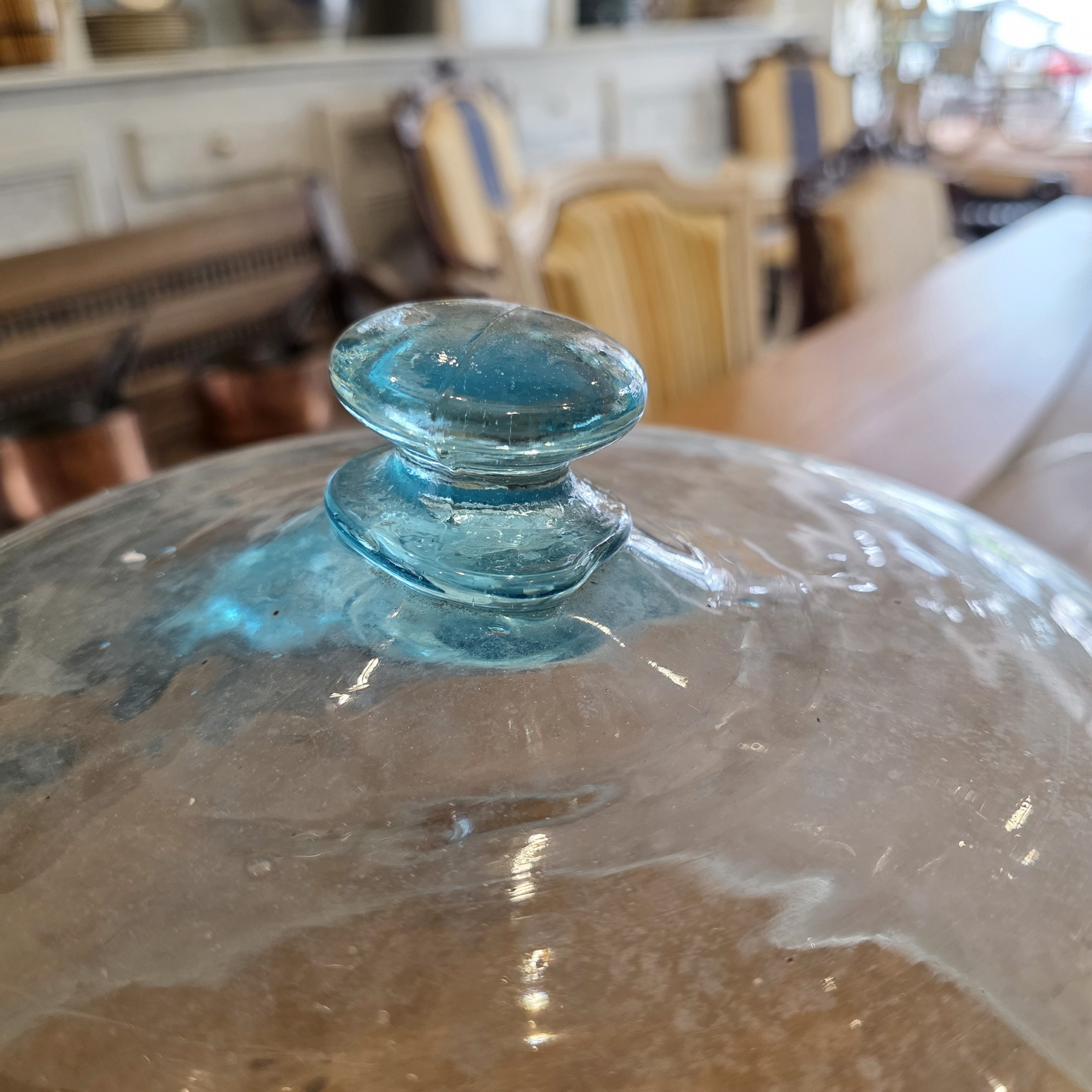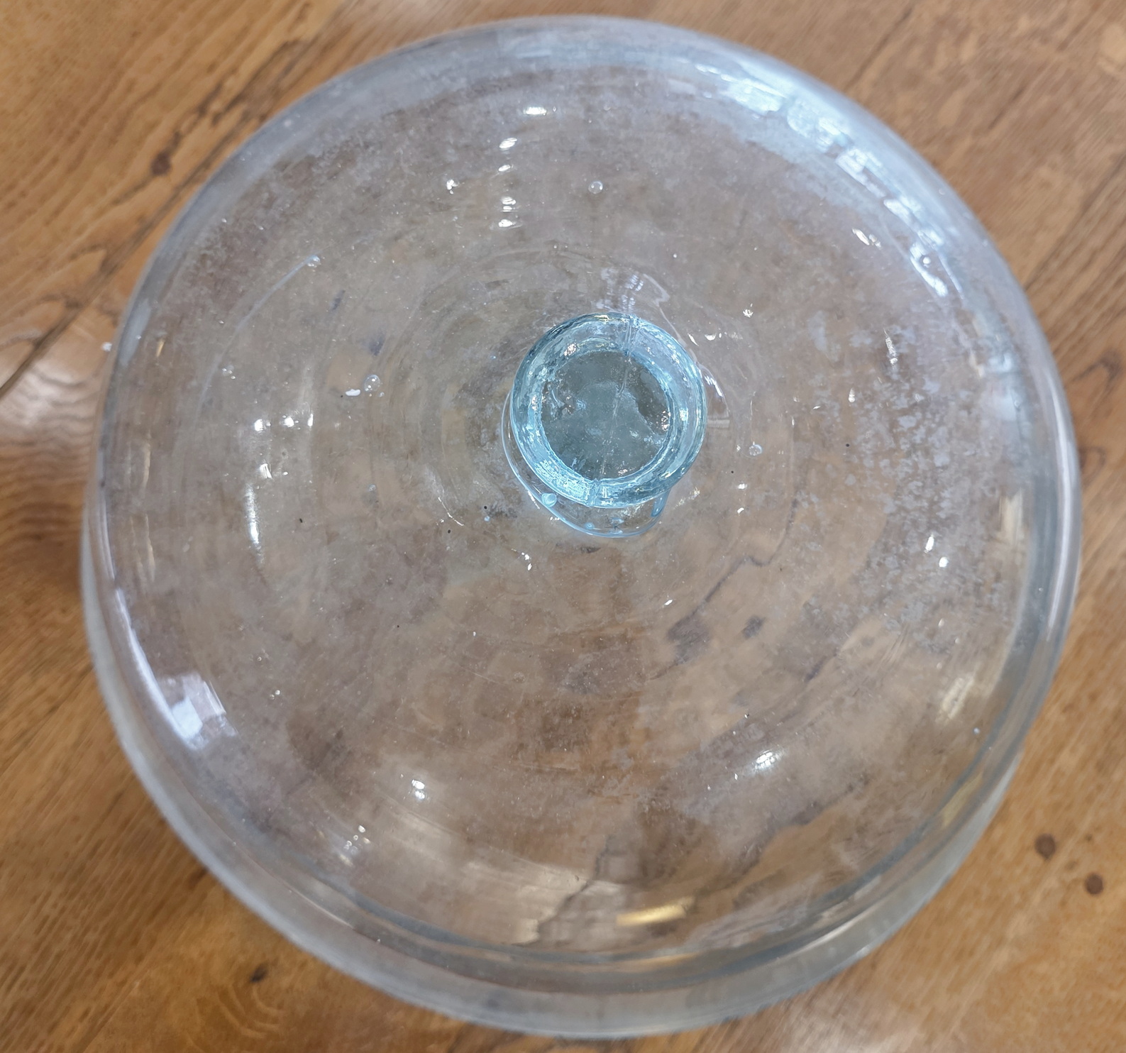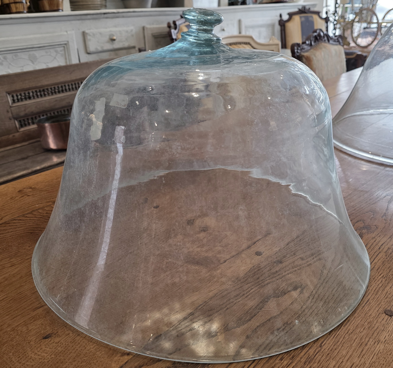 A 19th century French blown-glass 'cloche', a miniature glass-house which was originally used in gardens and in agriculture to protect delicate plants such as lettuces and strawberries from frosts. Please note the character of the hand-made glass, with 'wobbles and trapped air bubbles typical of the early, artisanal construction. These cloches can be used in a home to cover fruit, bread and cheese. Area of Normandy, circa 1860.
