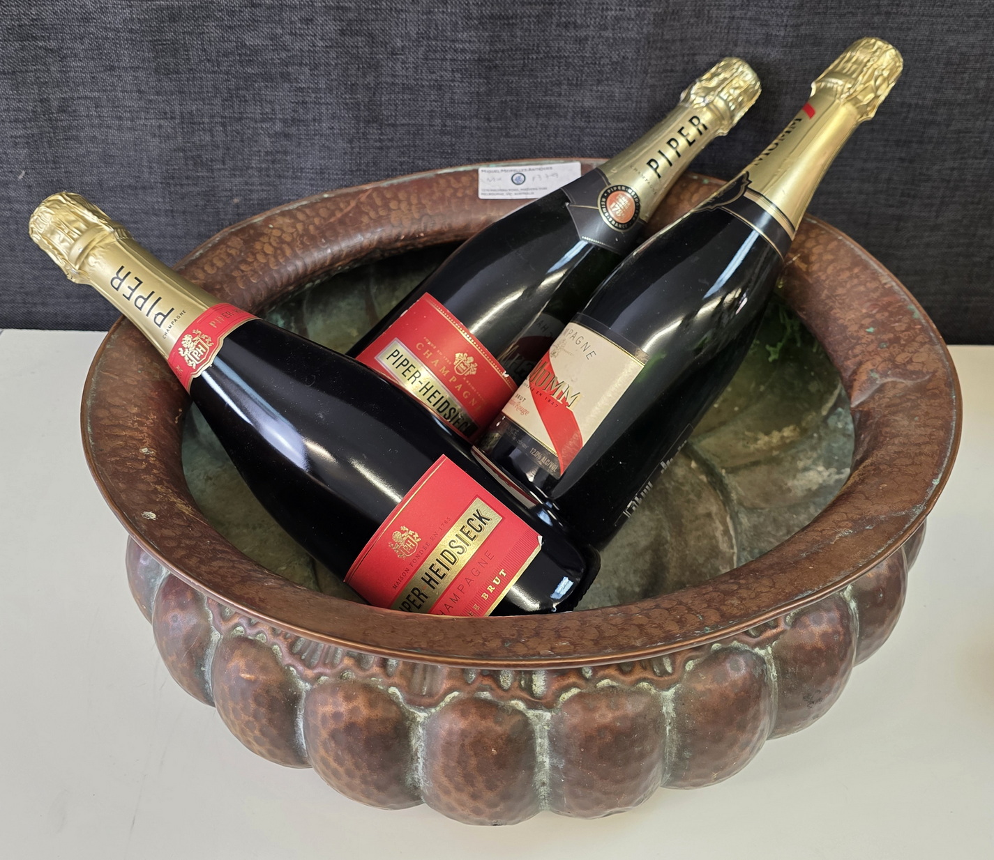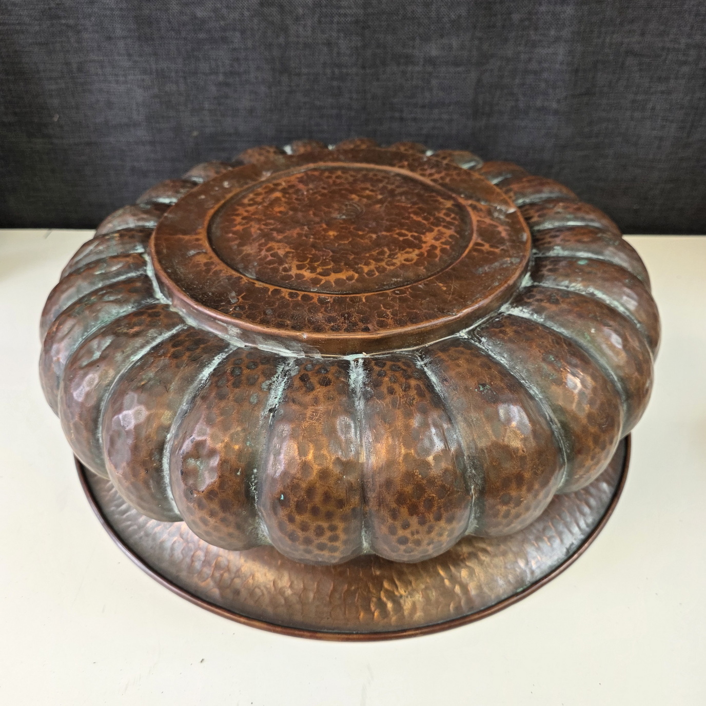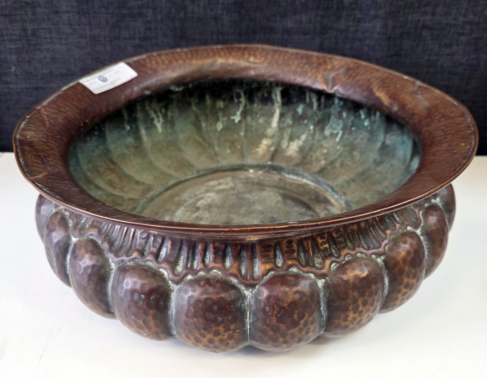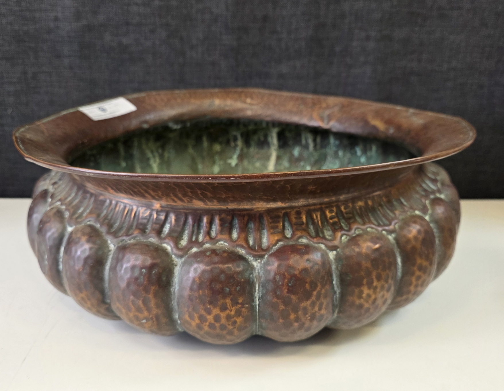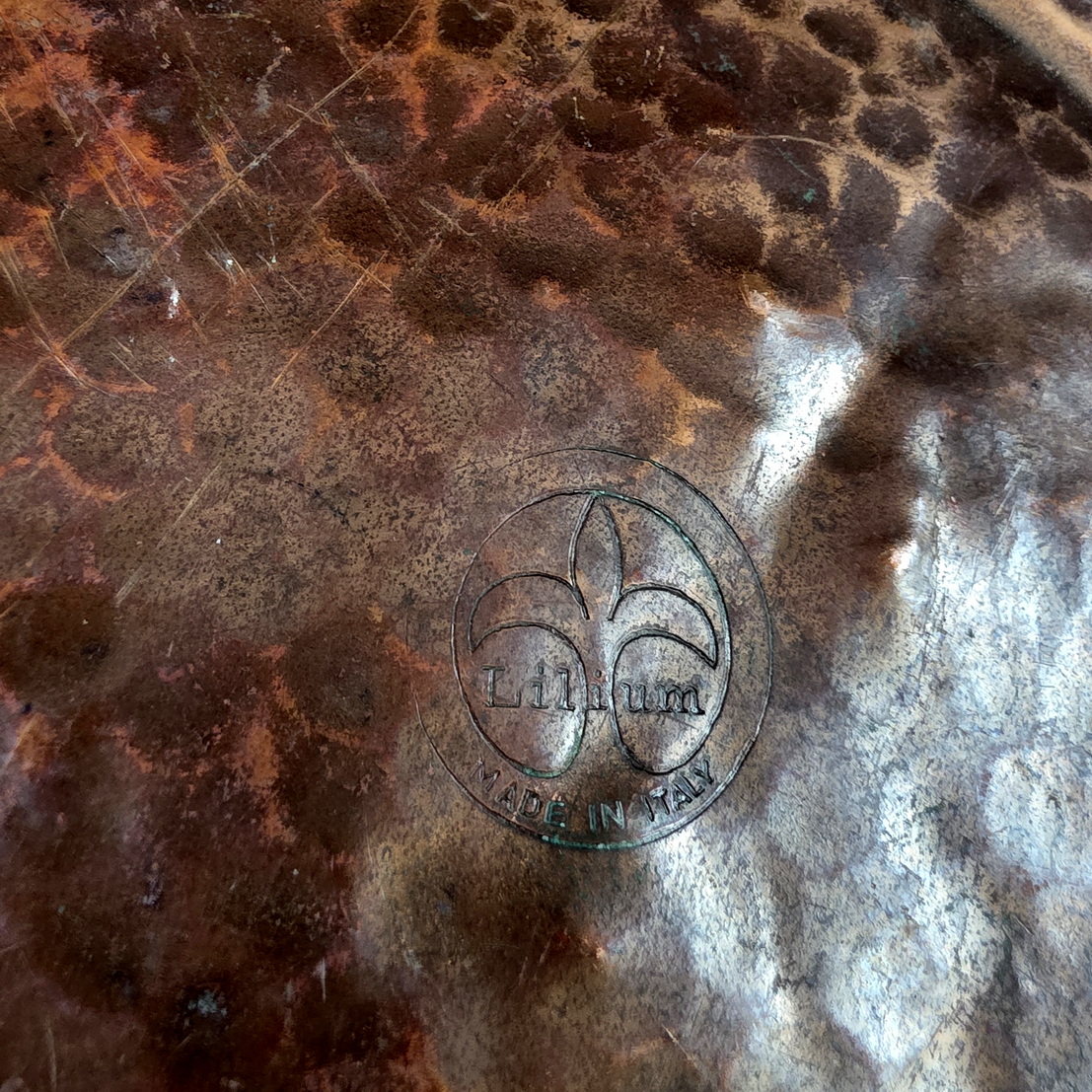 A large, Florentine Renaissance style, repouseed brass bowl decorated with large gadrooned patterns with a light hammered finish. The underside with the maker's hallmark "Lilium" (lily in Latin) and the Florentine fleur-de-lys symbol. Please note: this bowl will serve as an excellent fruit bowl, or even a multi-bottle wine and Champagne bucket. Area of Florence, circa 1930.