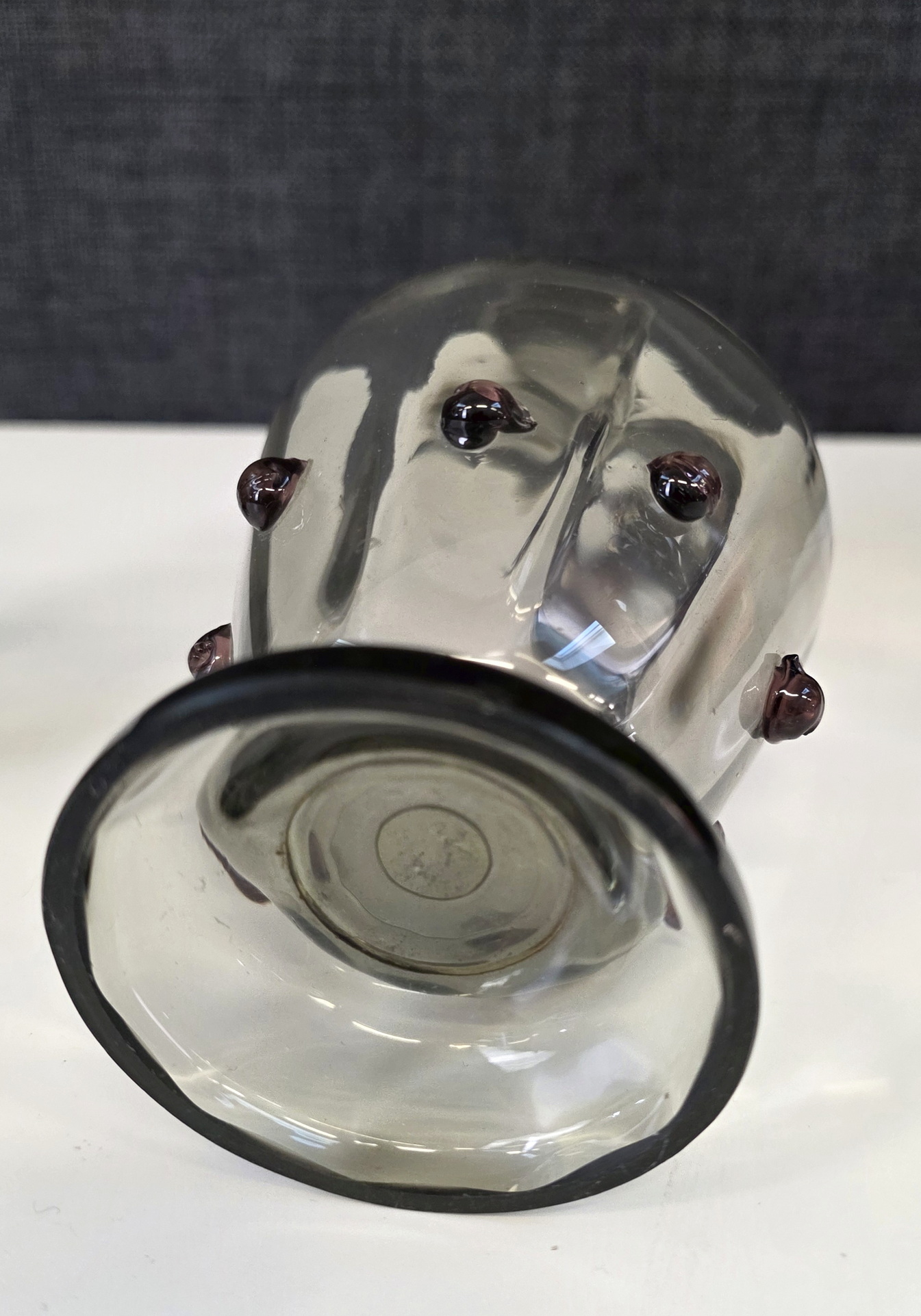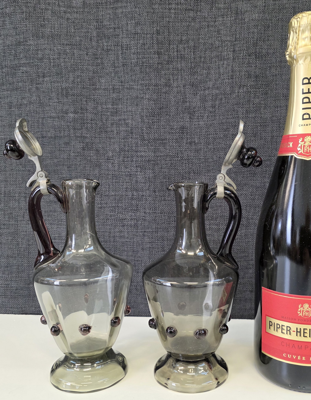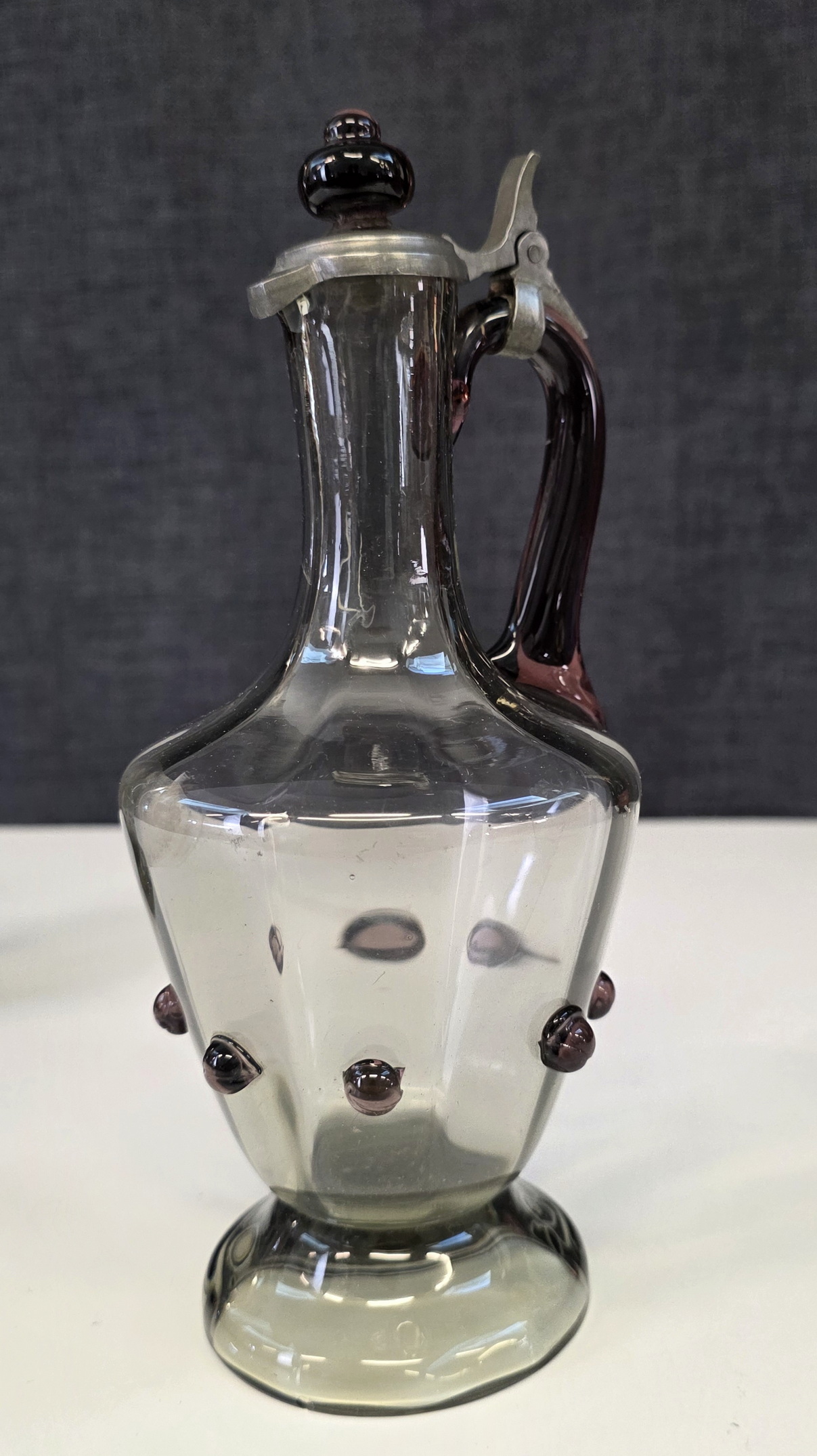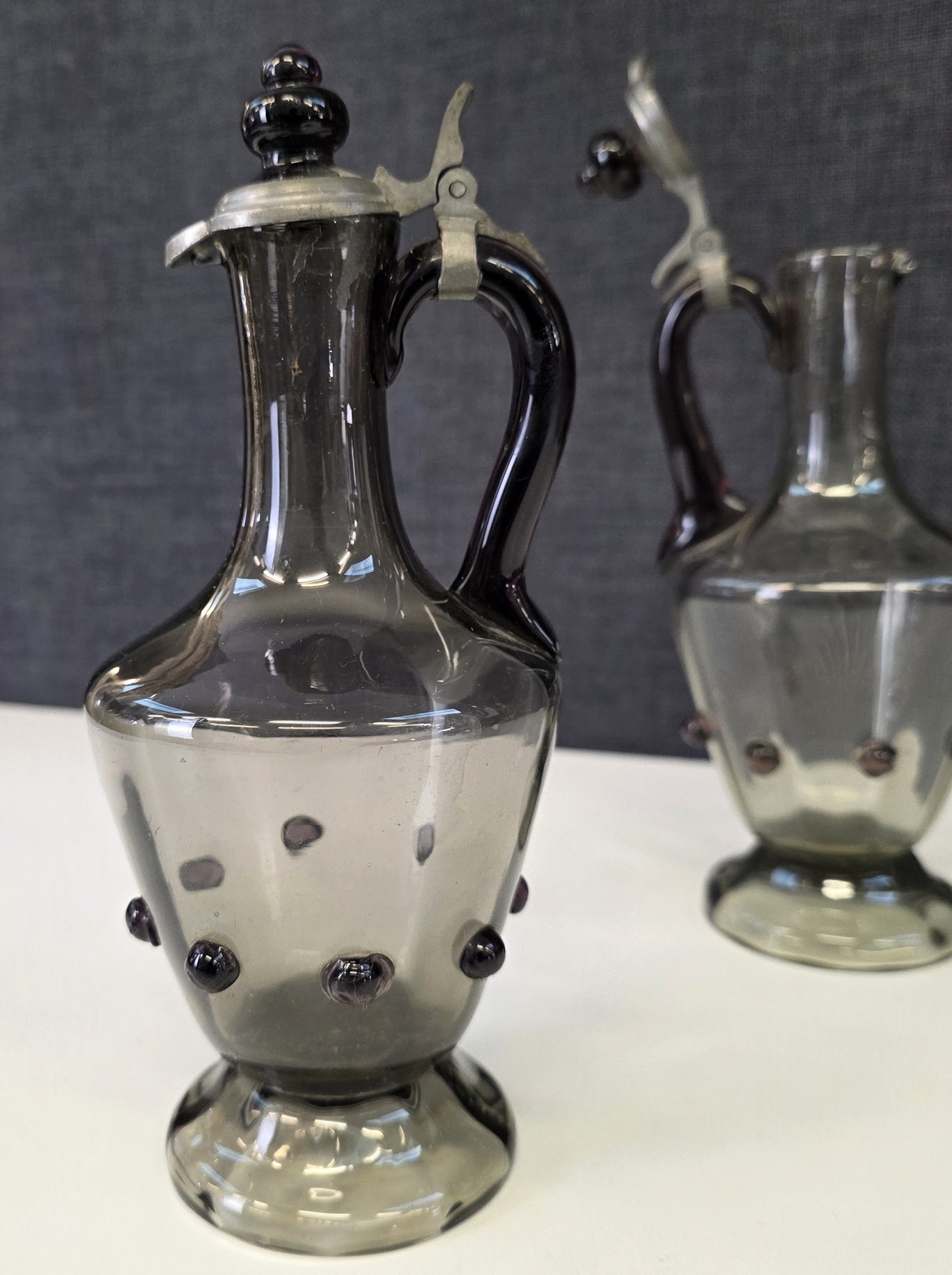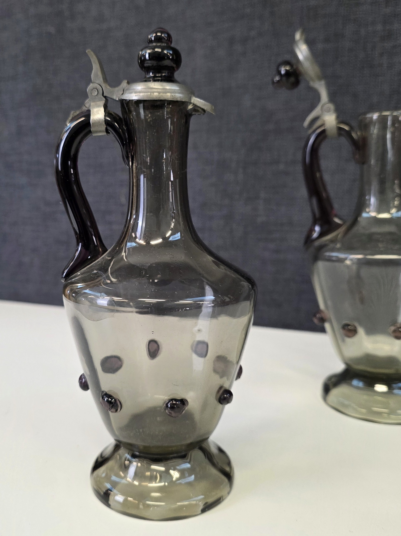 A pair of early 20th century French Art Deco period hand-blown smoked glass cruets, the bodies decorated with raised 'nipples', each cruet fitted with a hinged pewter lid. Area of Paris, circa 1930.