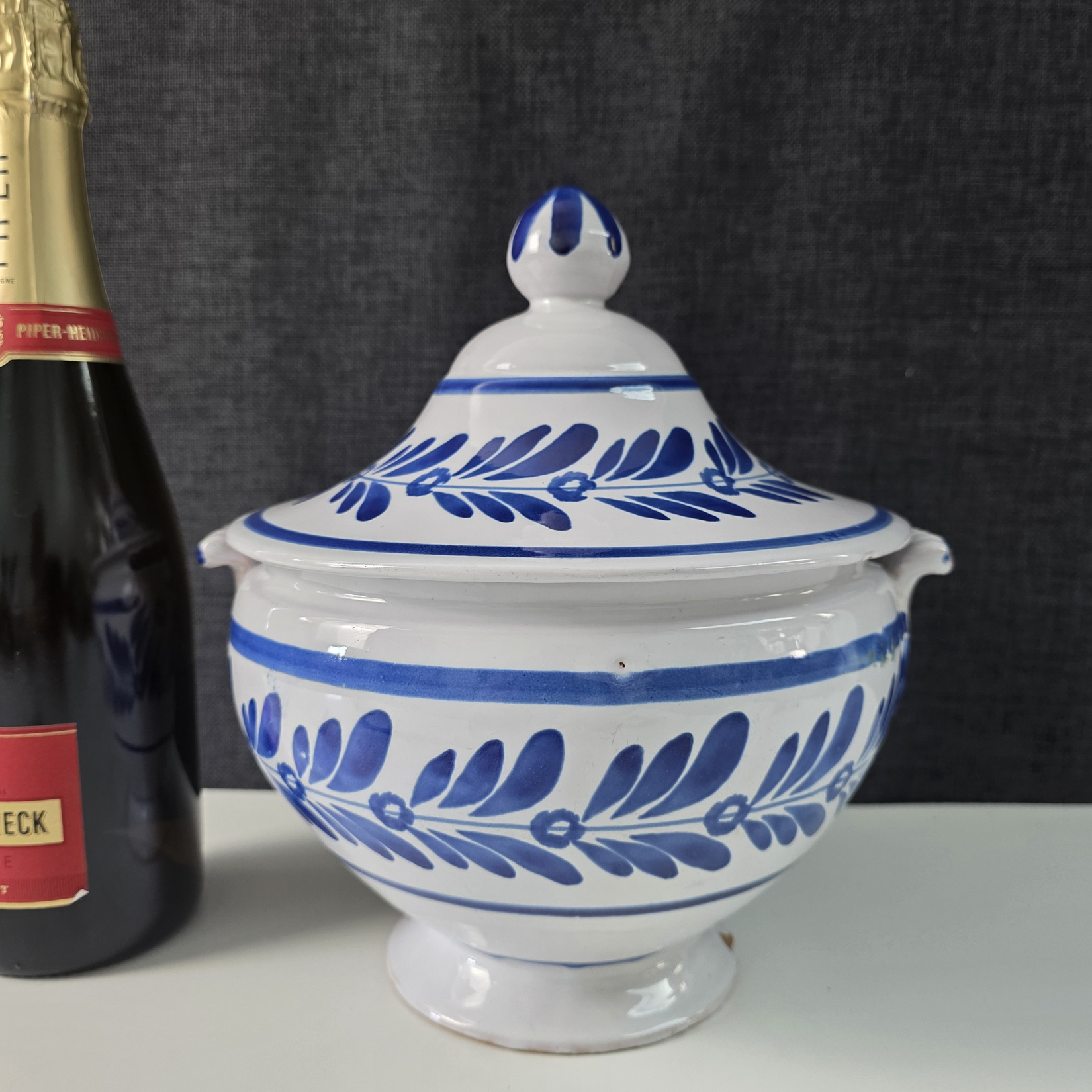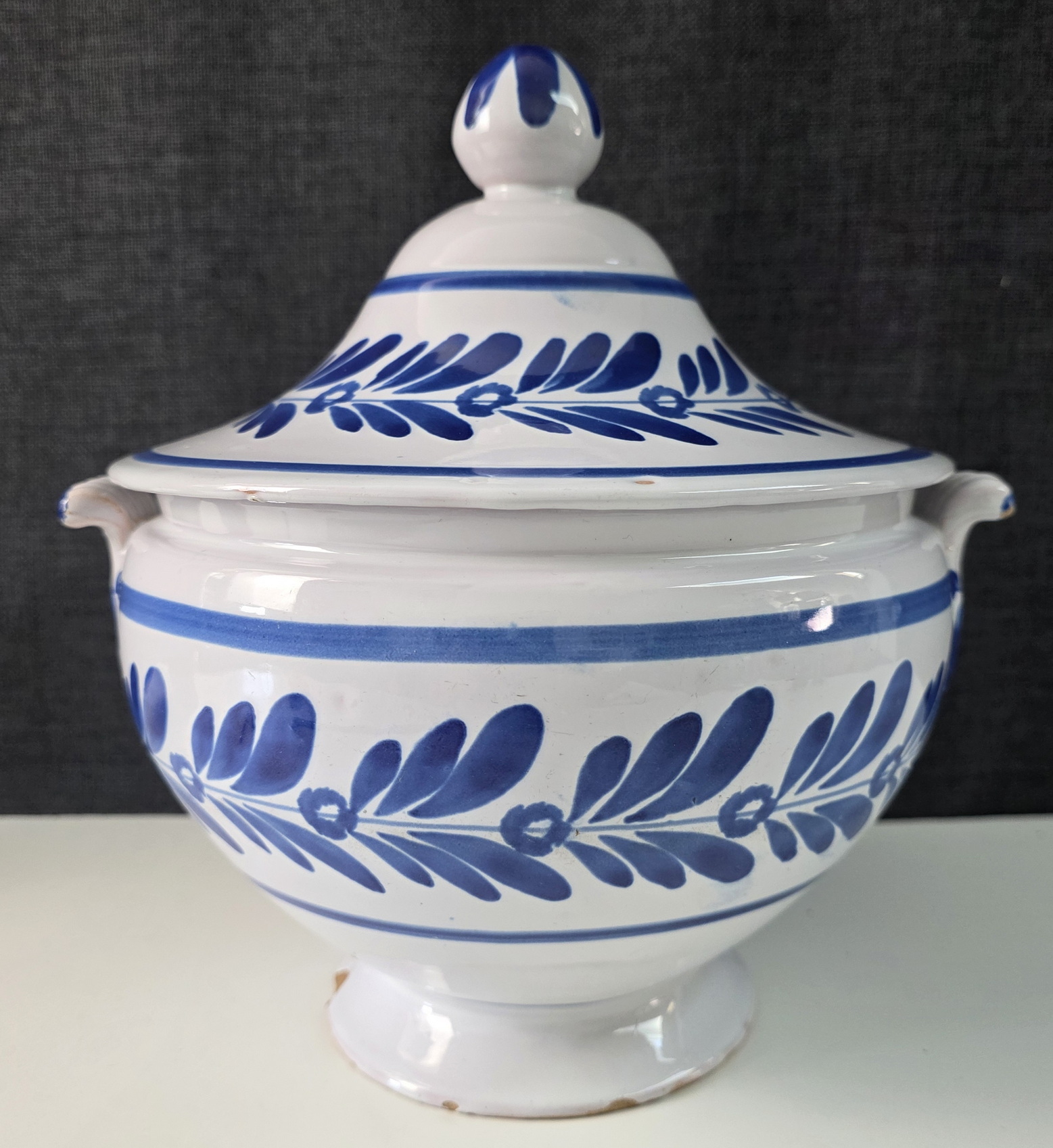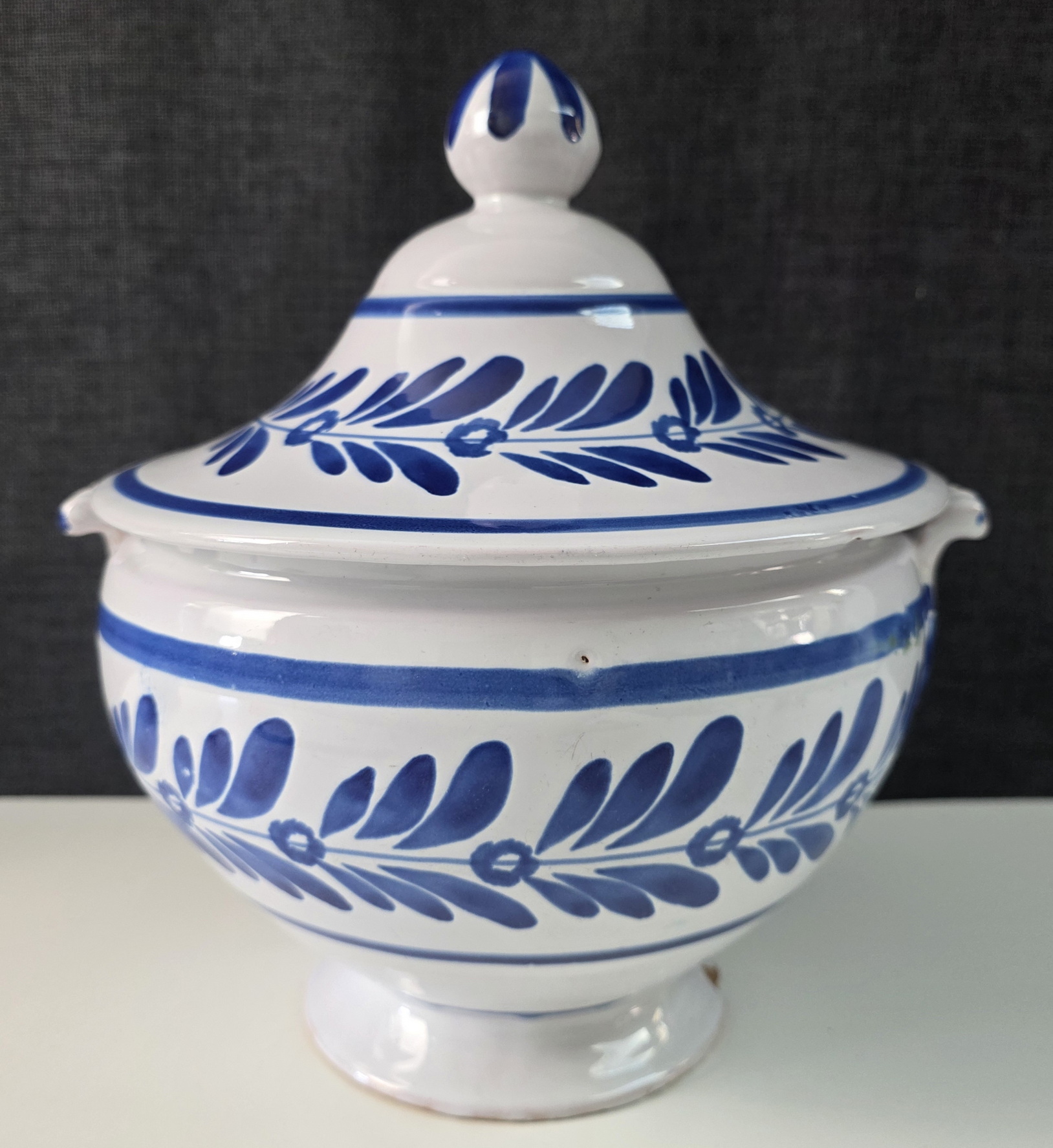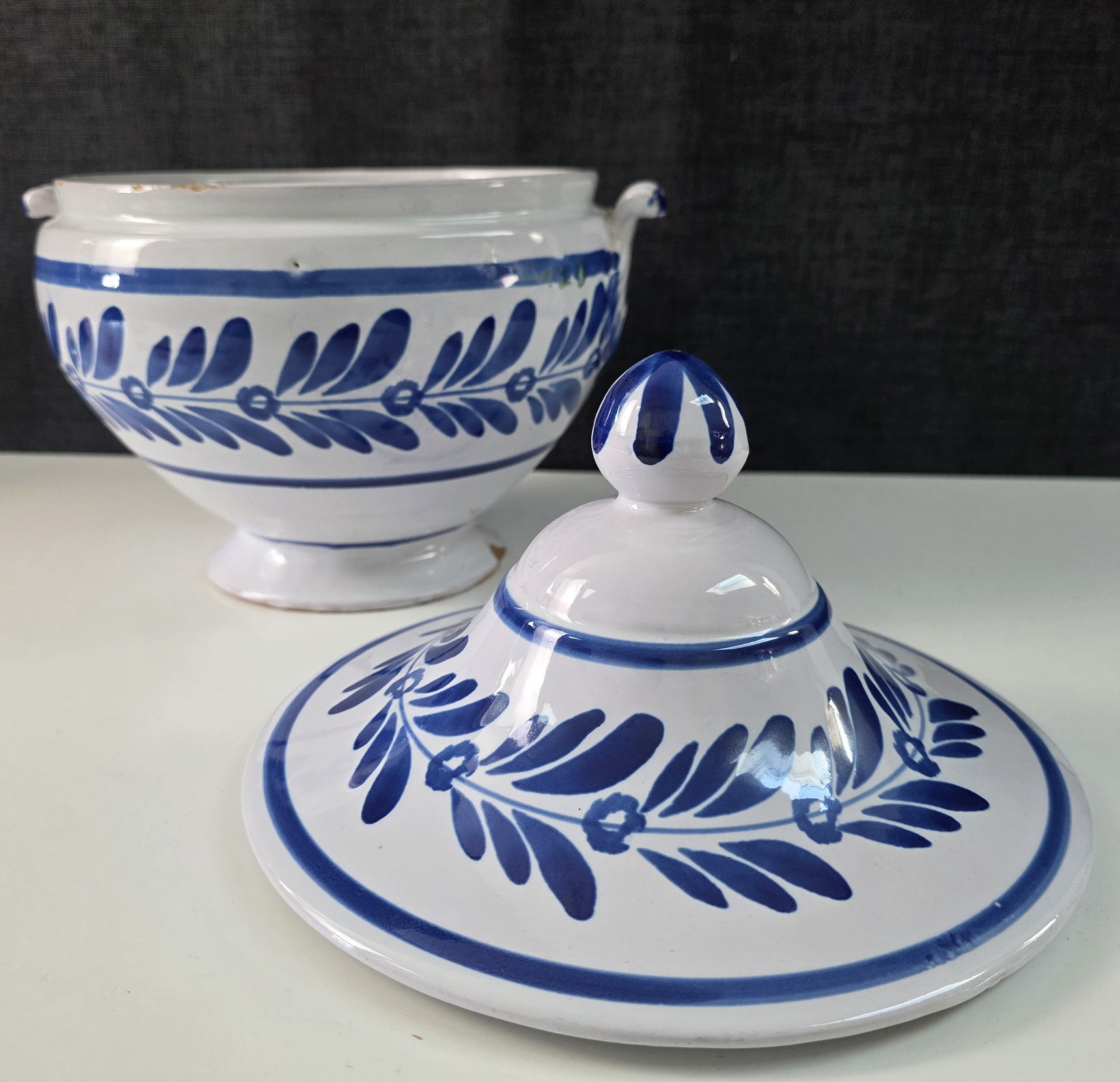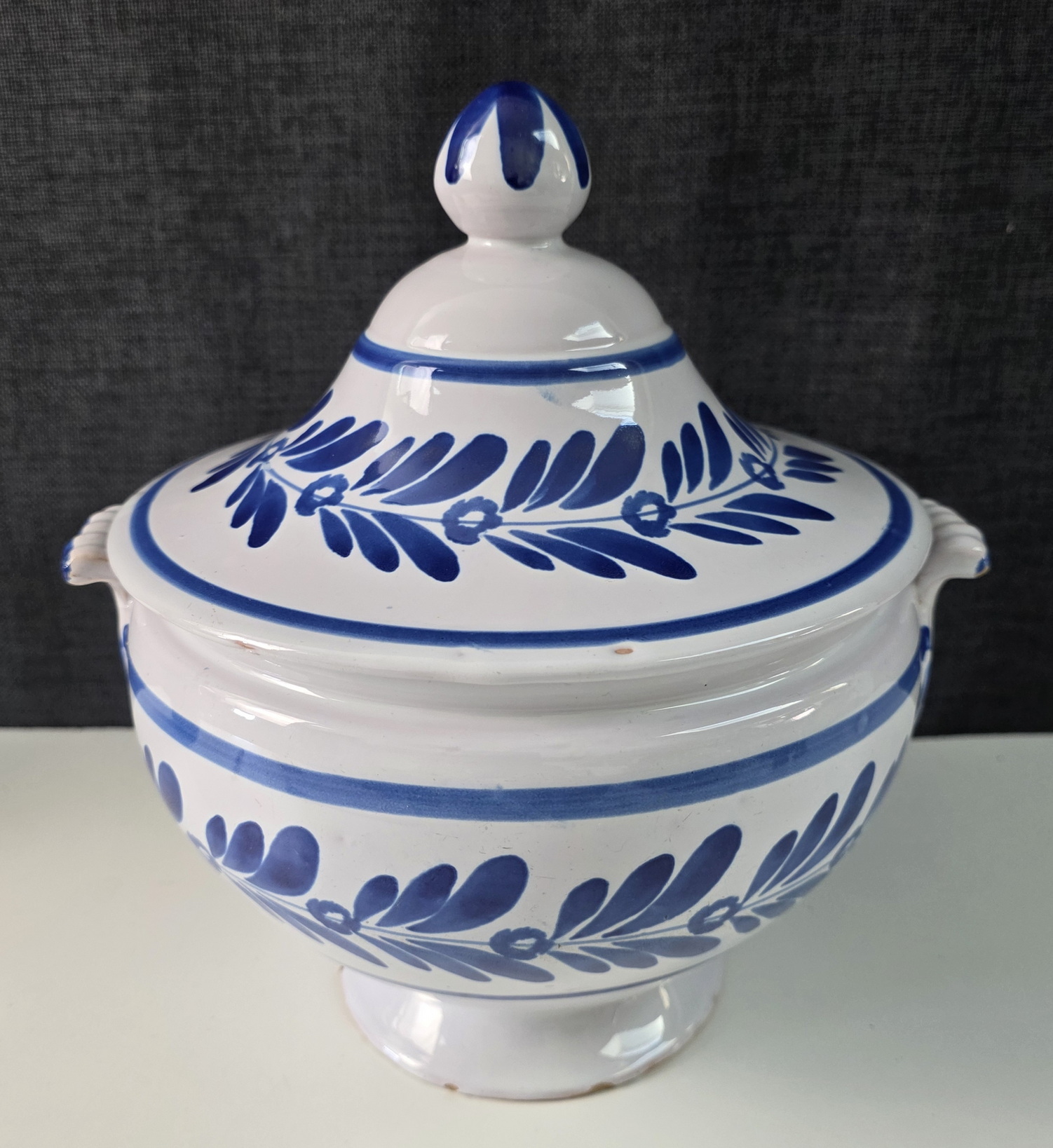 A 19th century Italian Zuppiera, a blue on white glazed majolica soup tureen of Classical 'Medicis' shape, decorated with stylised flower and foliate motifs. Please note: a soup tureen like this one is often used as a 'vide-poches', somewhere to put coins and keys into, near the front door. Typical design of the Deruta potteries. Area of Perugia, Italy, circa 1900.