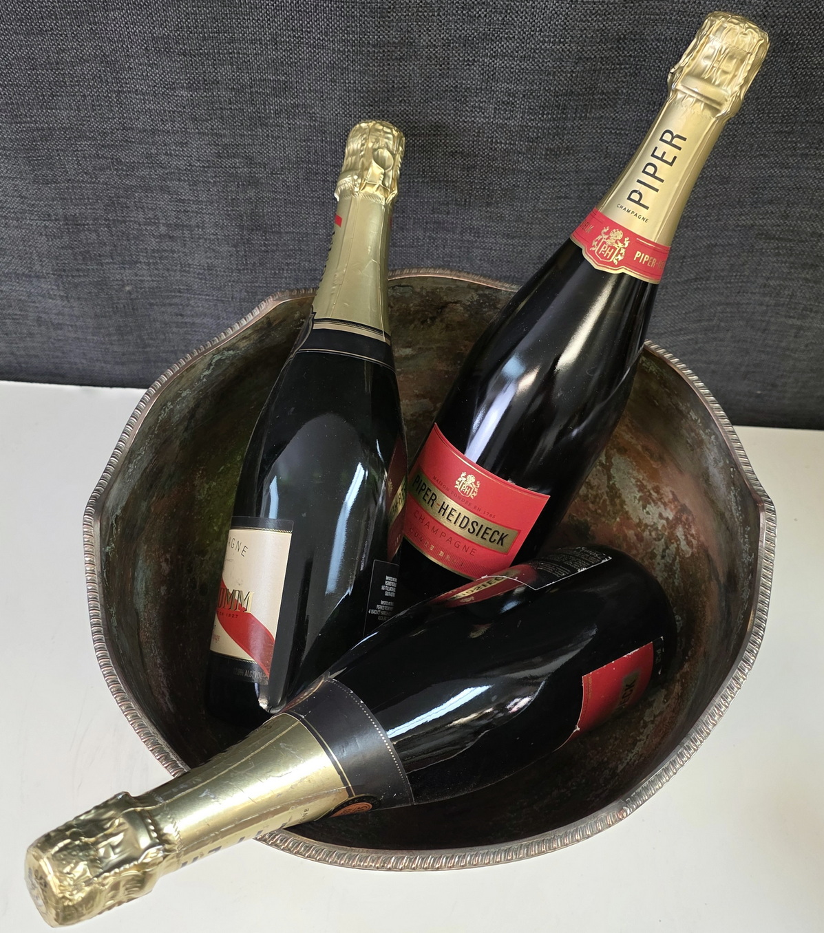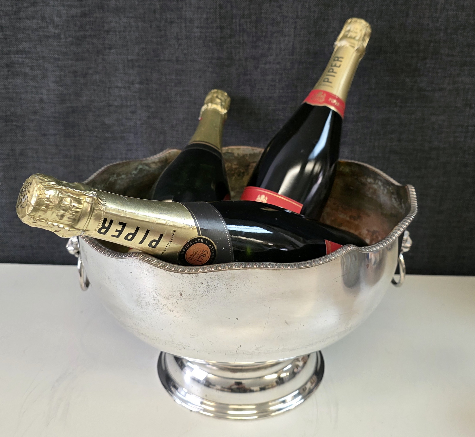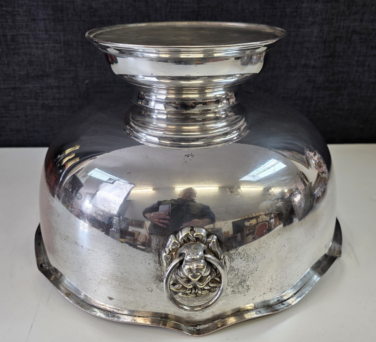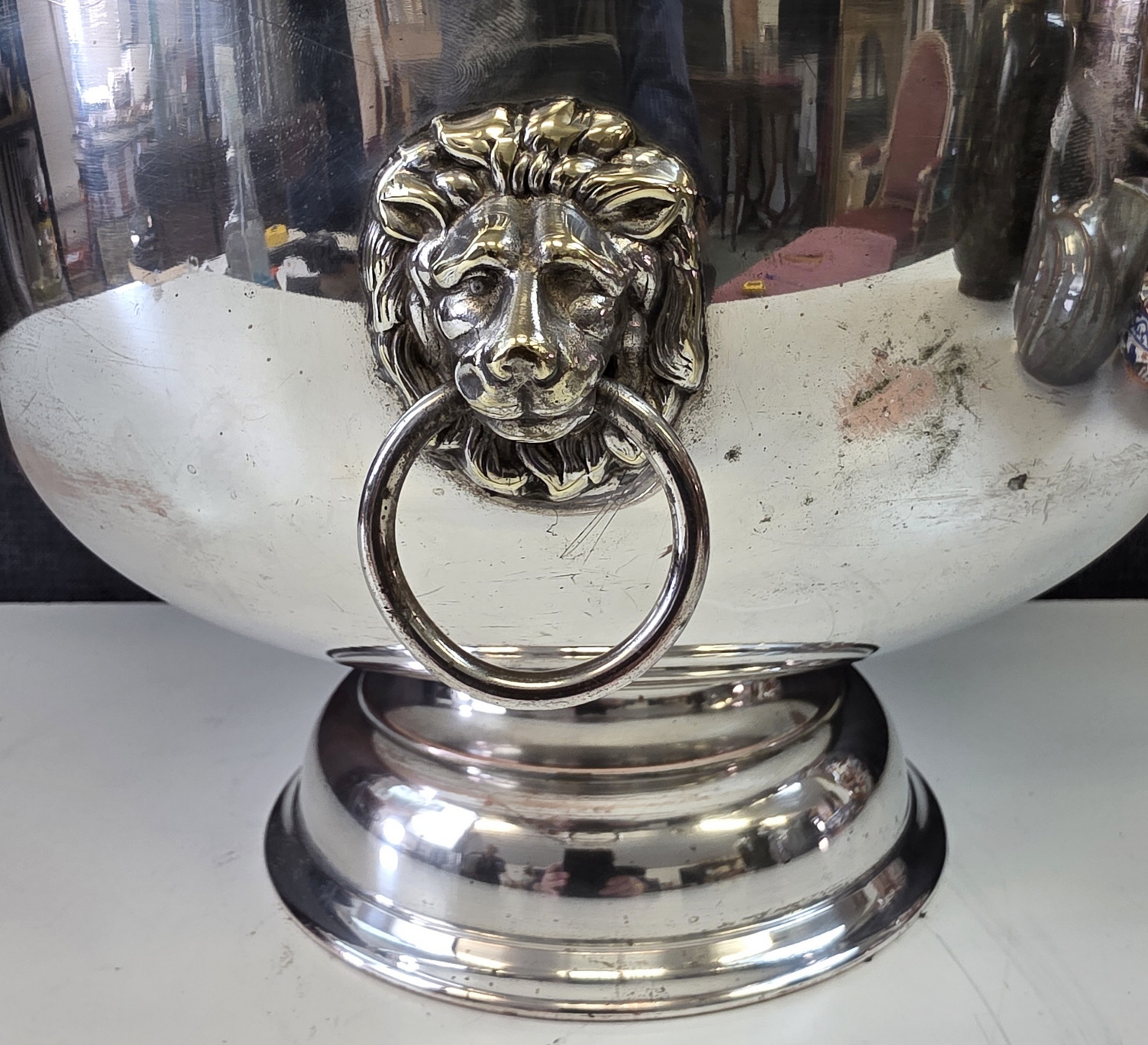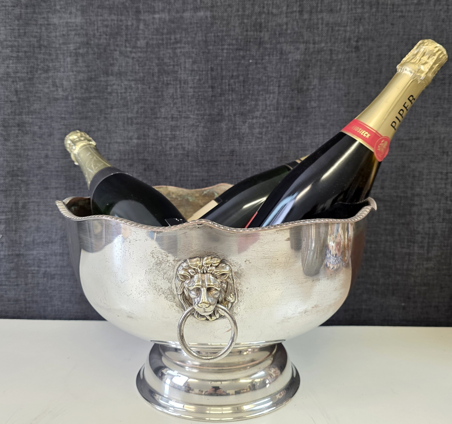 A fine, early 20th century French turned and silver-plated Champagne bucket, a type used in French restaurants for chilling simultaneously several bottles of wine and Champagne. Decorated with finely cast and chased lions' heads handles, the top moulding has raised patterns and scalloped edges. Provenance: The 'Hotel Golf Barriere', Deauville.