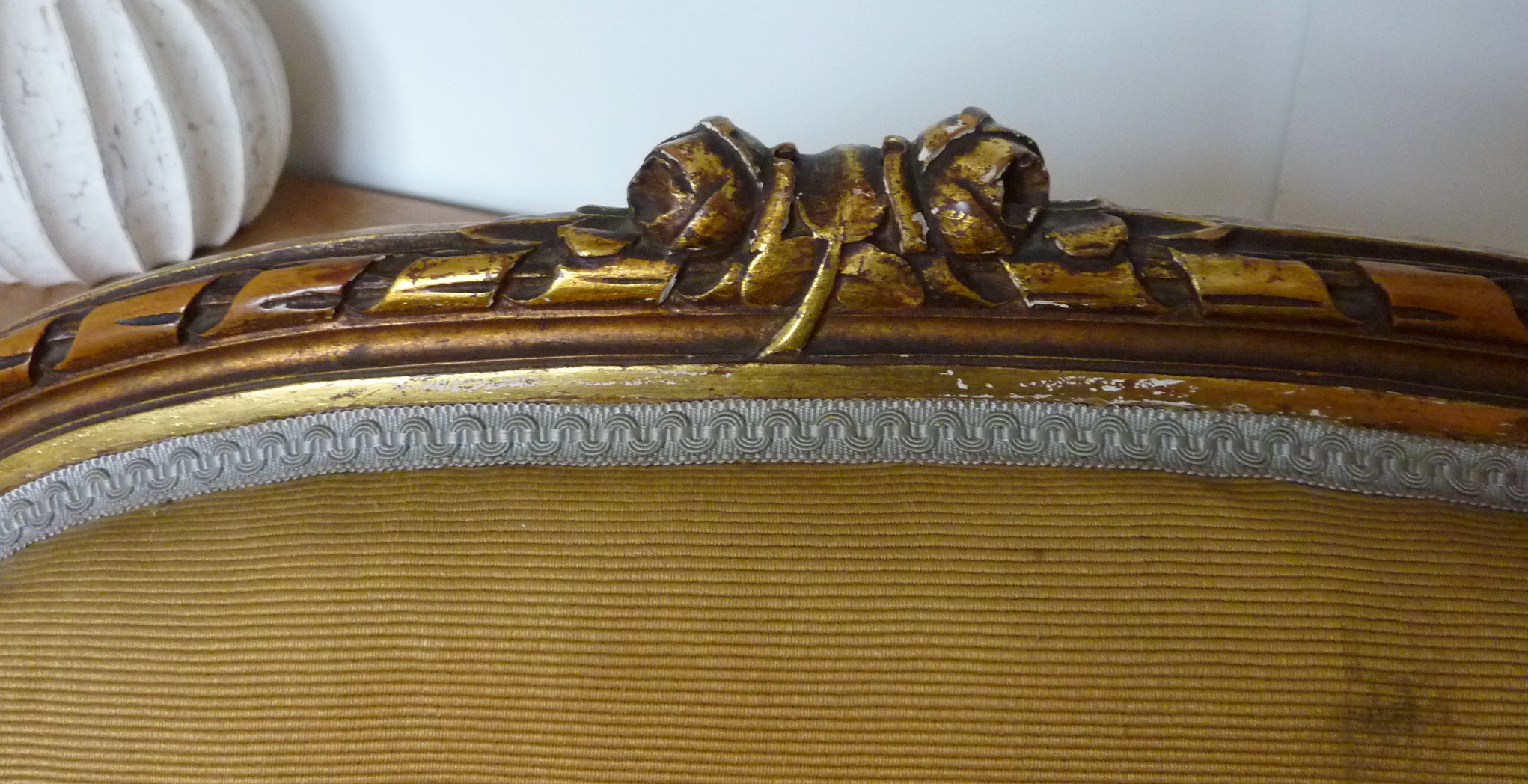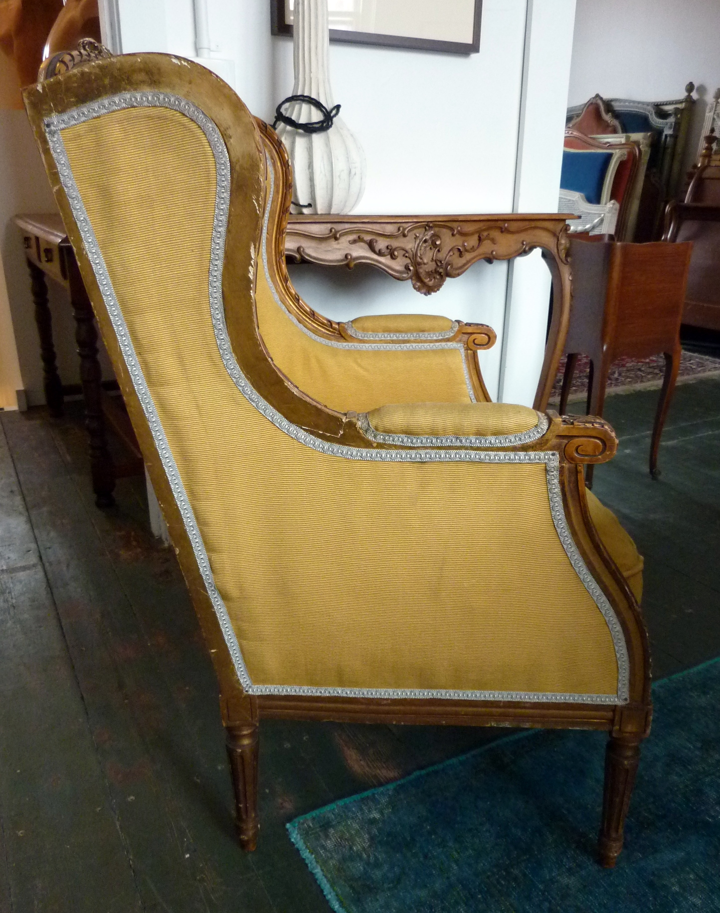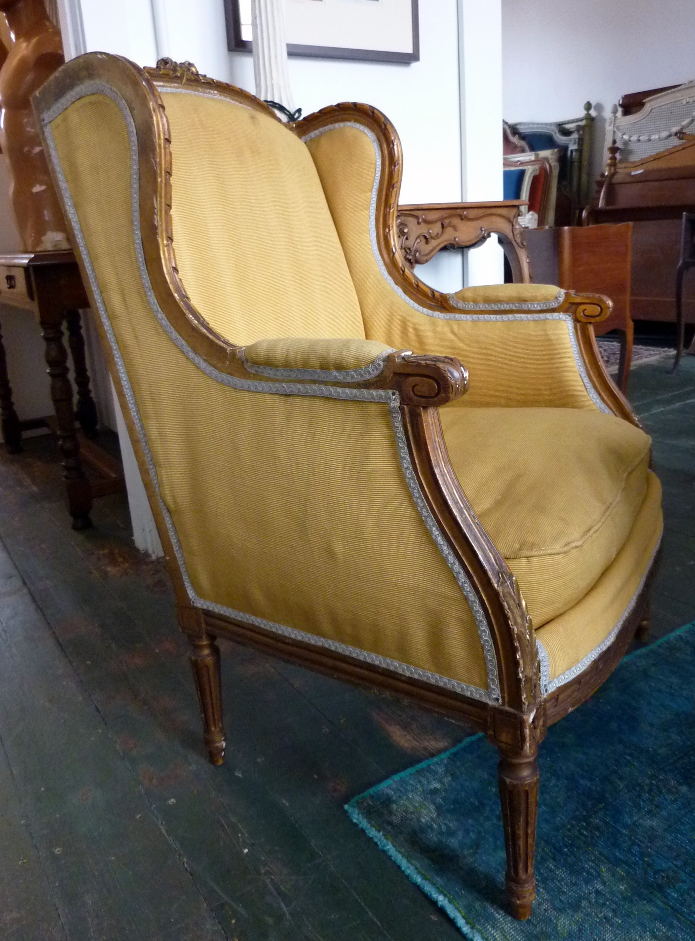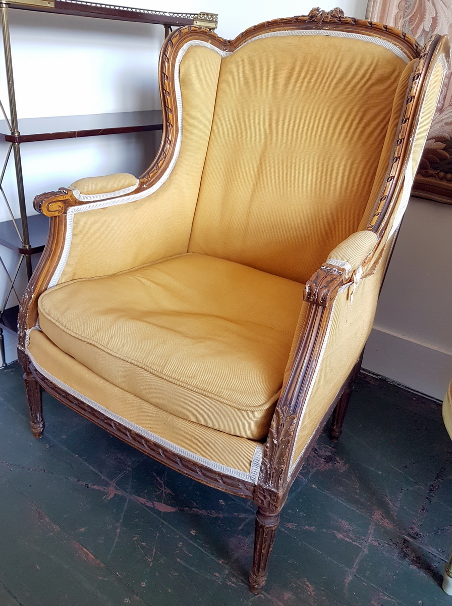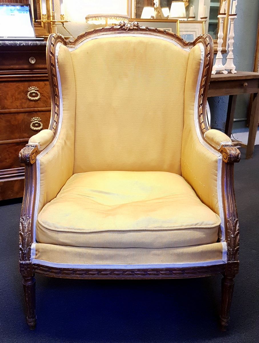 A pair of elegant and comfortable, finely carved and gilt French Louis XVI style Bergere "Wing-Back" Armchairs, the frames decorated with Neoclassical motifs such as 'ribbon' pattern mouldings, acanthus leaves and paterae. Paris, circa 1880.