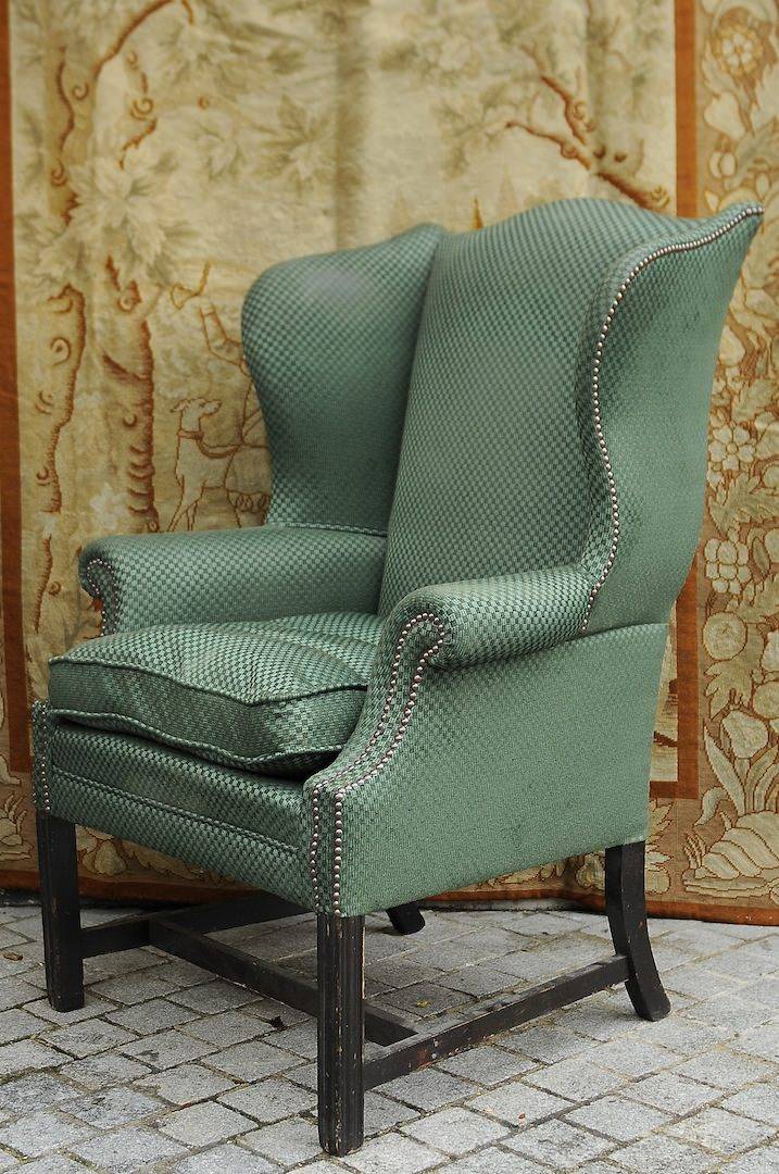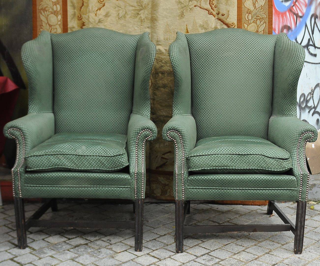 A pair of early 20th century English George III style mahogany library armchairs, the front square-section legs decorated with 'linen-fold' mouldings and fitted with 'H' stretchers.