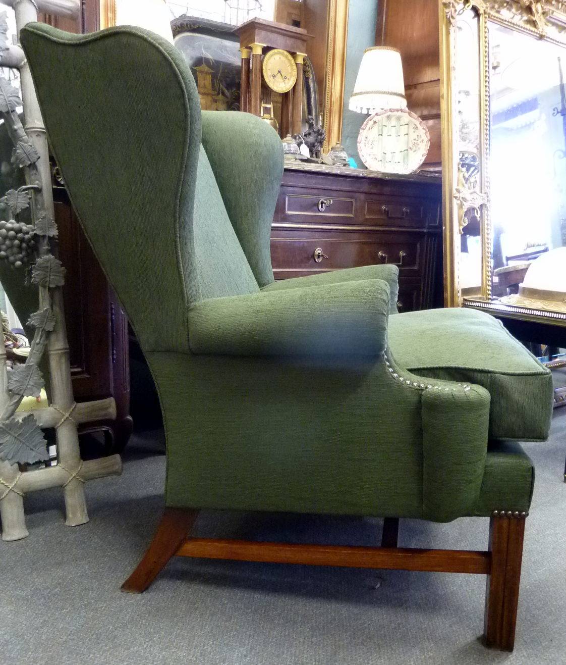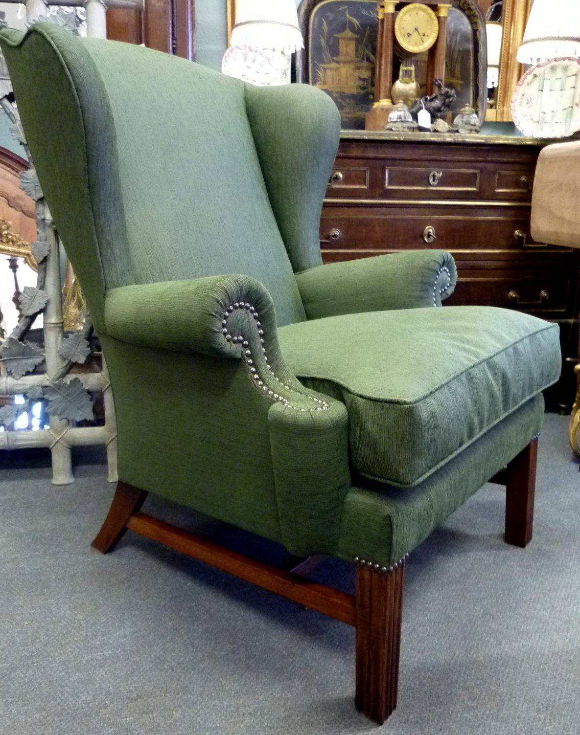 An early 20th century English George III style mahogany library armchair, the front square-section legs decorated with 'linen-fold' mouldings and fitted with an 'H' stretcher. Freshly-upholstered in down feather, with "Loop Alpinia" from Mokum Fabrics,"pinecone" colour.