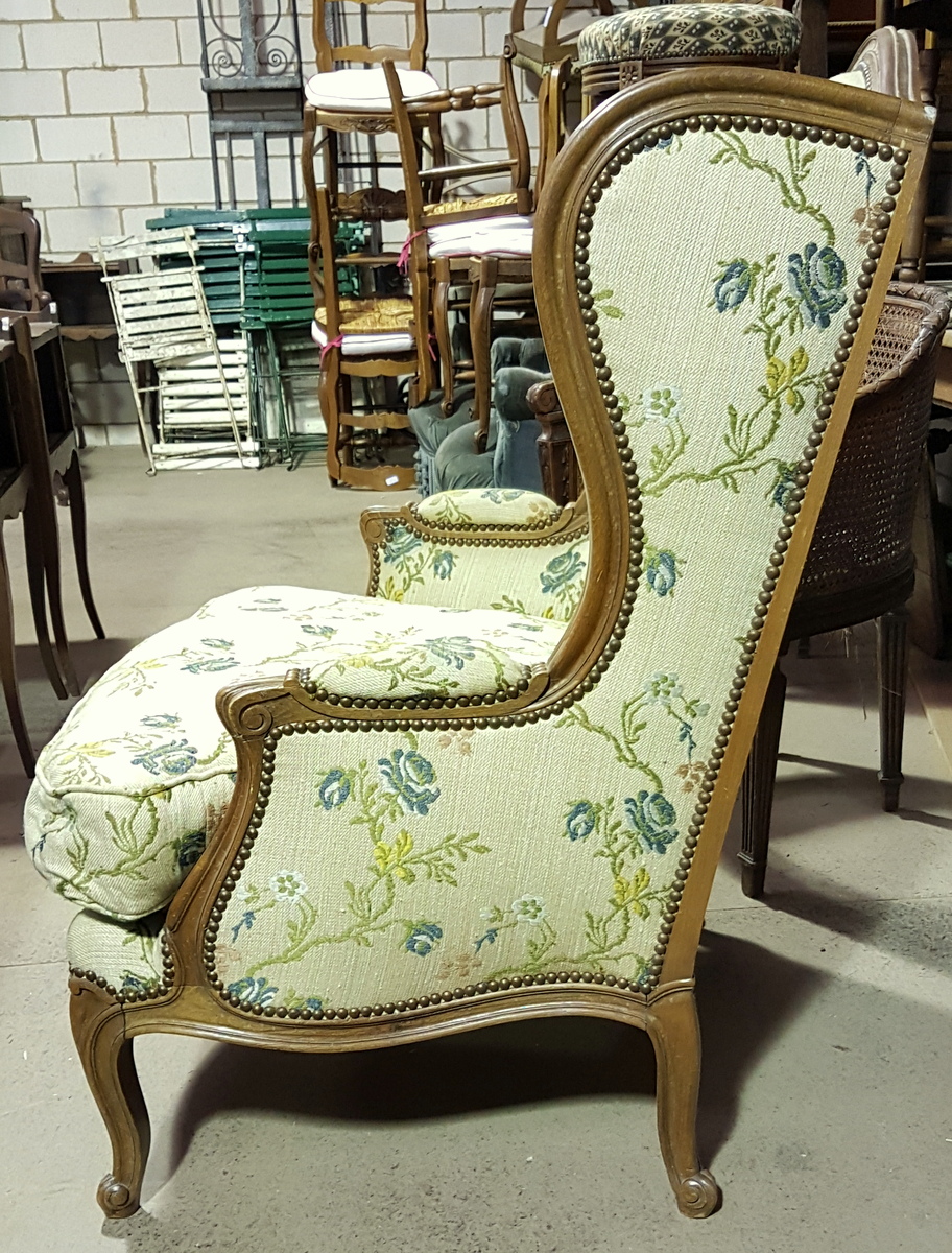 A large and well-proportioned 19th century French Louis XV style, finely carved beechwood wing-back "Bergere a Oreilles" armchair. Upholstered with a separate down-feather seat cushion, its good width and depth making it very comfortable to sit in. Paris, circa 1880. Please note: this armchair is an almost pair with armchair #10988.