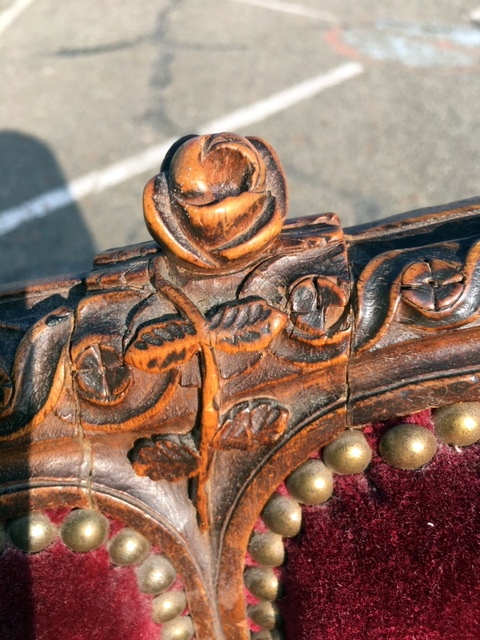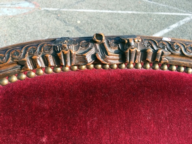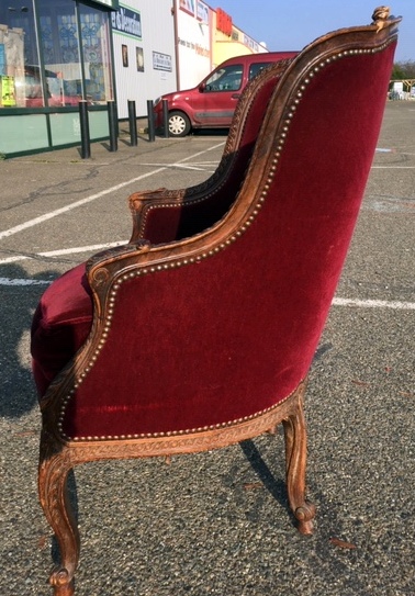 A French Louis XV style “Bergere en Gondole” tub armchair, the finely carved solid walnut structure typical of the Louis XV style. Retaining a clean fabric upholstery, and the original nicely-faded finish. Area of Paris, circa 1900. This item is for sale in a shop near Paris, and will not be brought to Melbourne unless someone wants it, and is willing to put down a deposit on its purchase.