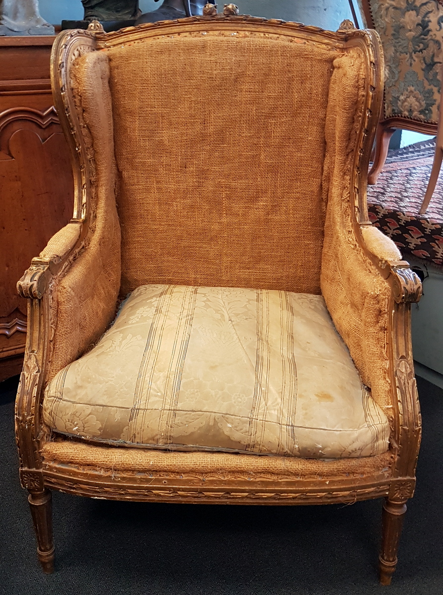 A pair of elegant and comfortable, finely carved and gilt French Louis XVI style Bergere "Wing-Back" Armchairs, the frames decorated with Neoclassical motifs such as 'ribbon' pattern mouldings, acanthus leaves and paterae. The gilt finish worn and nicely dulled to an old bronze colour. Paris, circa 1880. Price is for the pair.